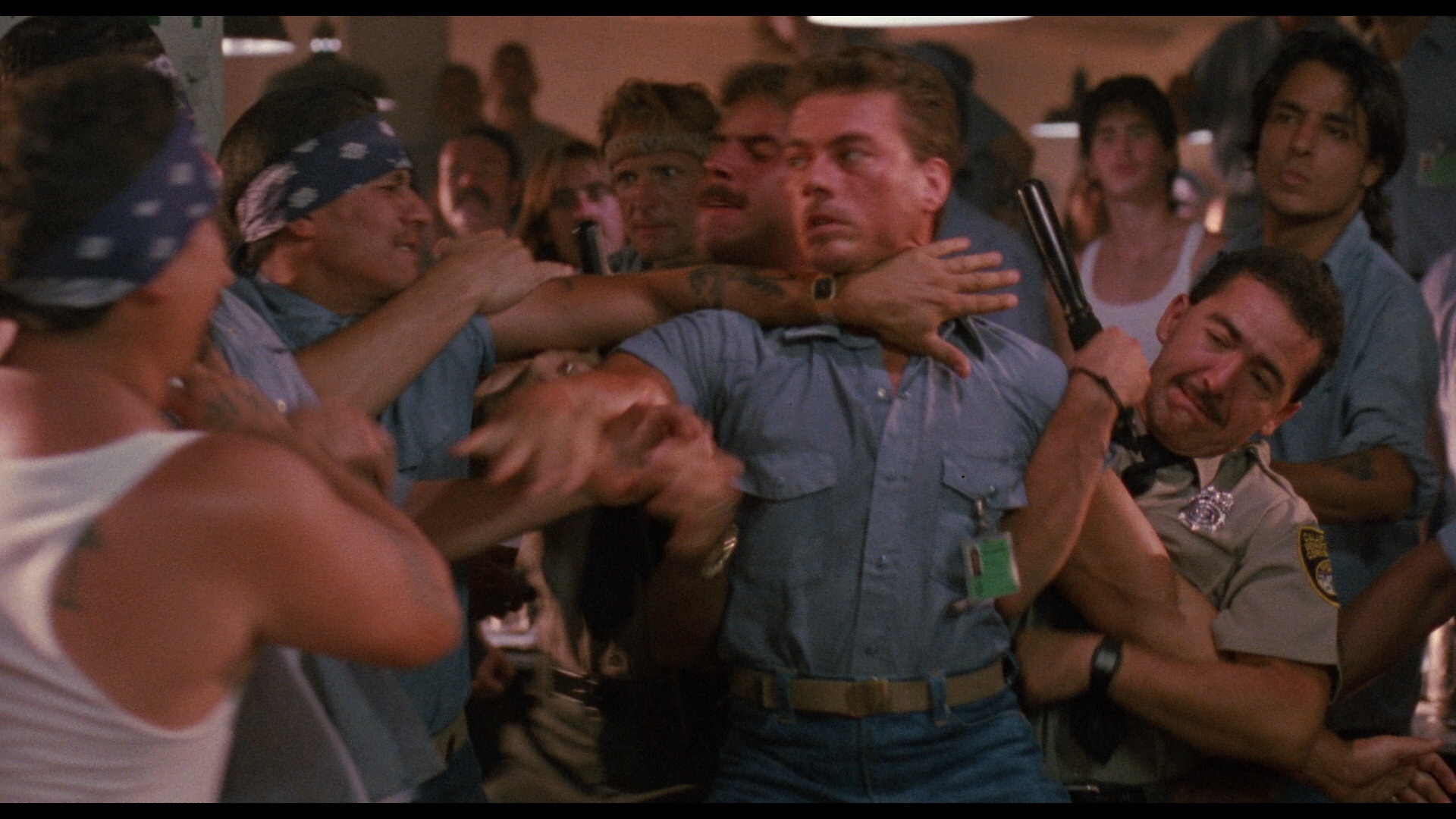 While trailing the man who killed his partner, Quebec cop Louis Burke (Van Damme) ends up on the mean streets of L.A. where he fires several bullets into the culprit, a serial killer known as the Sandman (Kilpatrick). For some reason, Burke decides to hang around for sixteen months and gets enlisted by a governor task force to look into the murders of one guard and eight prisoners at Harrison State Prison. With an election coming up and prison treatment a hot public issue, officials want the matter cleaned up as discreetly as possible. Burke is sent inside with a phony armed robbery conviction and relays information to the outside through recent Stanford grad Amanda (Gibb), who's posing as his wife. However, life inside proves to be challenging on many fronts thanks to abusive jailers and extreme racial tension, not to mention someone running around puncturing the back of people's skulls with an icepick. Through an inmate clerk named Hawkins (Guillaume), Burke works his way through the prison's underworld including a gender bender bordello in the basement and a corrupt guard system apparently working under orders from the outside. Meanwhile Amanda enlists the aid of a sexually aggressive computer hacker (Near Dark's Miller) to