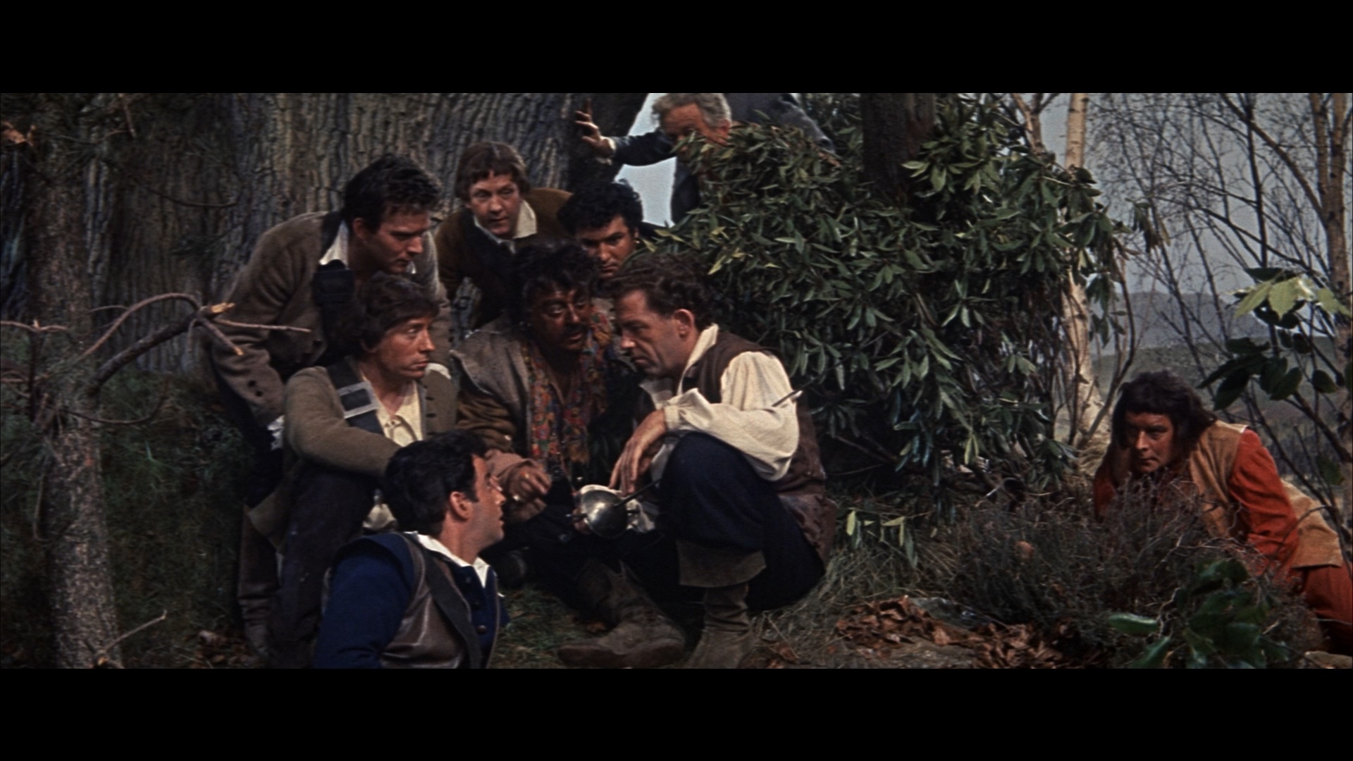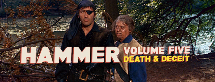 Next we come to the best-known title in the set and the only one with a significant home video history, The Pirates of Blood River. This one popped up on DVD in 2008 during the height of the Pirates of the Caribbean craze as part of a set with Devil-Ship Pirates, The Terror of the Tongs, and The Stranglers of Bombay, followed by standalone DVD-R editions from Sony and a 2017 U.S. Blu-ray from Twilight Time featuring an isolated music track, a trailer, liner notes by Julie Kirgo, and a substantial audio commentary by writer Jimmy Sangster, art director Don Mingaye, and film historian Marcus Hearn. Essentially a more vicious twist on Treasure Island, it's the tale of nice guy Jonathan Standing (7th Voyage of Sinbad's Mathews, also in Hammer's Maniac), unfairly persecuted by his own father (Quatermass and the Pit's Keir), who's snapped up from a penal colony by a gang of pirates headed by the ruthless, eyepath-wearing Captain LaRoche (Lee). As it turns out, Jonathan has some vital information that could lead the gang (including a young Oliver Reed) to hidden treasure, and his best friend, Henry (Homicidal's Corbett), becomes tangled in the hunt as well.