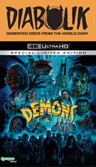 Of course, it was just a matter of time before the Demons duo hit 4K -- and that came to pass with a U.K. edition of the film first out of the gate in 2020 as a limited UHD set from Arrow Video with standalone UHD and Blu-ray combos of Demons and Demons 2 hot on its heels. Meanwhile in the U.S. soon after in 2021, Synapse Films released its own limited (6,000-unit) set of both films on separate UHD discs (with a Blu-ray reissue at the same time as well). Featuring new restorations from the original camera negatives, both films look superb here with the Dolby Vision (HDR10 compatible) presentations bringing out a vibrant and very wide range of color here that blows away Demons 2any versions we've had before. Image quality between the releases looks the same, and in fact the menus are also set up identically even if the contents vary a bit. In a very welcome gesture, Demons 2 has also been digitally stabilized so that unbearably shaky in-camera damage during the beer garden scene is now quite steady for the first time. (The audio's also been synced up a bit better in that scene, too.) Demons features the usual configurations of the DTS-HD MA 5.1 English and Italian tracks, as well as the option of watching the alternate U.S. version (with a botched-up audio track in the initial pressing necessitating a replacement program). Lossless 2.0 stereo tracks are also included for both languages on the international cut as well, with optional English translated or English SDH subtitles. It's worth noting that the audio for the U.S. version has undergone quite a bit more restoration on the Synapse release and sounds much better here. Also, the U.S. cut runs slightly shorter due to the omission of some glimpses of the Coke logo involving cocaine, but that still runs a few seconds longer due to the inclusion of the Ascot logo at the beginning. Demons 2 comes with both the Italian and English tracks in 5.1 and 2.0 options, both of which sound great given the fairly limited nature of the original recording, as well as (on the Synapse) a true stereo 2.0 theatrical mix versus the 1.0 mono on the Arrow.