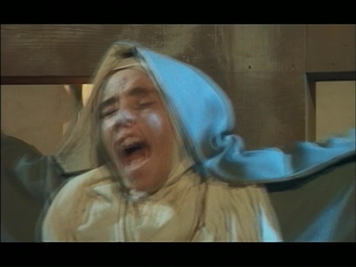The structure of Demonia closely follows the models of such favorites as The Beyond and City of the Living Dead right down to its corpse-laden crypt and opening seance, but the sense of irrationality and foreboding which characterized those masterpieces is very muted here. The dazed performances and sun-blasted cinematography are a long way from the usual Fulci approach, but he still does cut loose with a few anarchic gore scenes to goose viewers in the second half. The most extended death finds a poor soul impaled through the neck with a meat hook followed by that notorious tongue nailing, but the effects keep these set pieces from reaching the delirious heights reached by the likes of FX maestro Giannetto De Rossi. Oddly, the most shocking and memorable moments comes during a mid-film flashback, in which a simple knife to the throat during the throes of lovemaking is filmed in a very unexpected fashion. If the film has a significant failing, it's easily the drowsy, New Age-y score by Giovanni Cristiani, which just lays there and never does much to enhance any of the mayhem on screen.