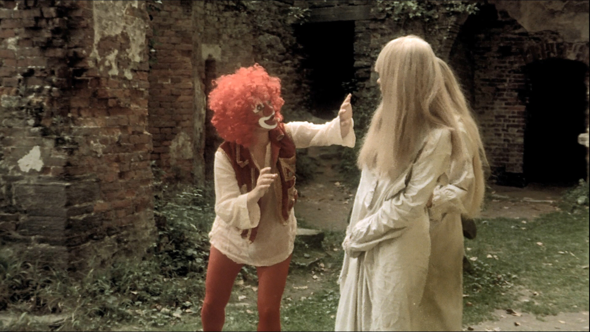 local tavern, the Captain experiences Macbeth-style visions of the maidens, their hands and eyes stigmatized with blood. He flees to Tina, who leads the wreckers back to the scene of their crime. The two girls are still there, barely alive, and escape to the haunted ruins of a church where a powerful spirit resides inside a cell. After meeting the spirit's handmaiden (a woman dressed as a clown, of course), the girls release him and engage in some sins of the flesh. In gratitude, the spirit grants them supernatural powers which, until dawn, will allow them to seek revenge.