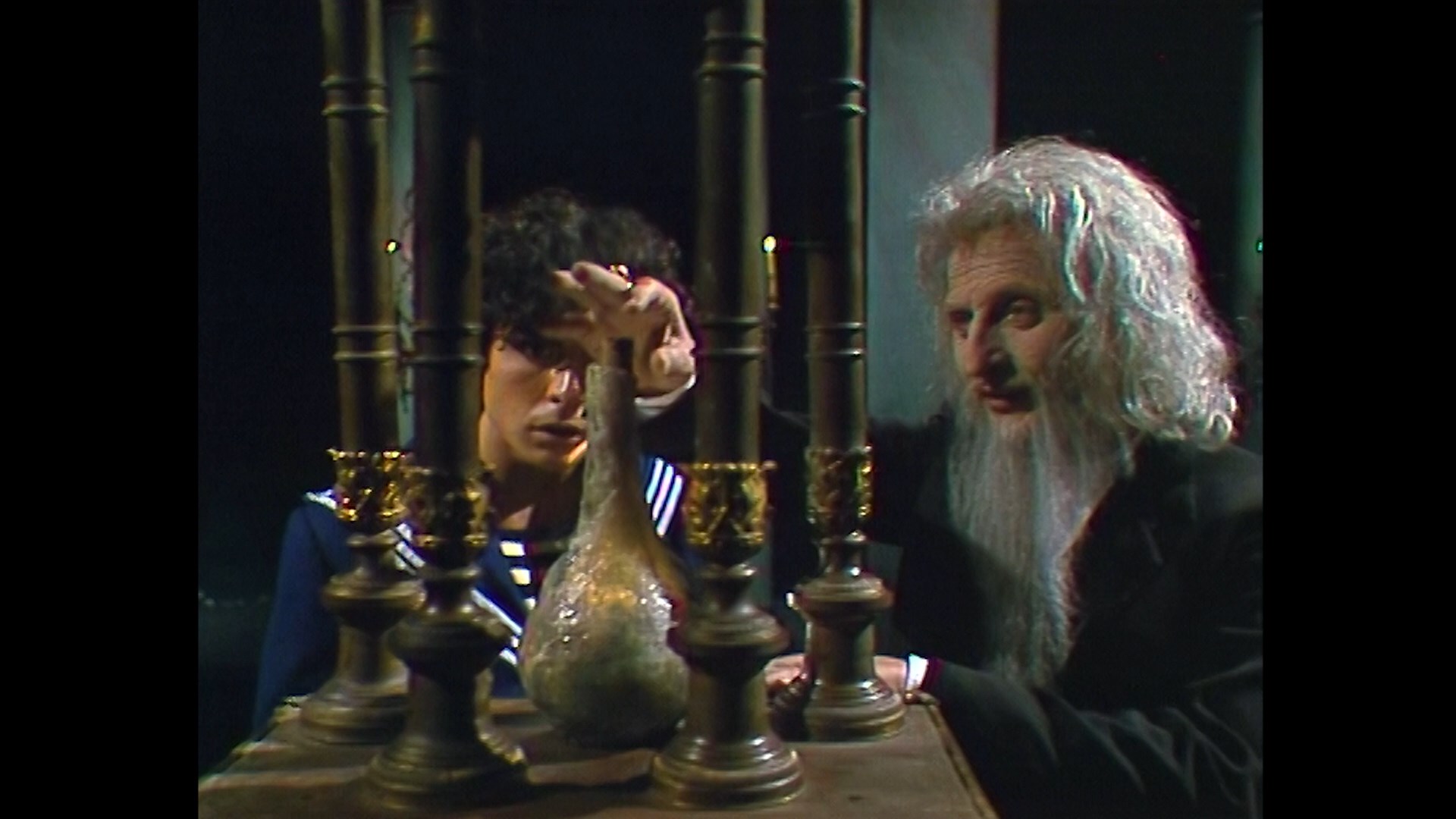 "La mano indemoniata" ("The Possessed Hand") (77m43s) is essentially a remake of the magnificent 1943 French horror film La main du diable (Carnival of Sinners) about a mysterious man showing off a ghastly, seemingly sentient severed hand to a group of guests at an inn during a snowstorm. Through flashbacks we learned the story of the diabolical limb and its origins with a Mephistopholean carnival barker played by the fantastic Gabriele Ferzetti (who makes this episode worth a look all by himself). While the earlier episodes were all shot in scenic locations with convincing period interiors, this one shifts gears for the rest of the stories by being obviously stage-bound with more minimal, stylized sets. That aesthetic goes into overdrive with "Il diavolo nella bottiglia" ("The Bottle Imp") (88m2s), directed by Tomaso Sherman and based on a shortly story by Robert Louis Stevenson. In Samoa, Stevenson (Mario Santella) relates the story of Keawe (Stefano Sabelli), manages to acquire a seemingly unbreakable bottle from an elderly rich gentleman who informs him that it contains an imp capable of granting his dearest wishes. However, the owner will be damned for eternity if he dies while the bottle is still in his possession. Obviously inspired by Powell and Pressburger films (especially The Tales of Hoffman), this is very theatrically staged and often feels more like a ballet with the camera moving back and forth between the stylized action and the narrator. Finally "Il sogno dell'altro" ("The Dream of Another") (59m33s), directed by Giovanna Gagliardo and featuring music by Stelvio Cipriani, is an adaptation of H.G. Wells' "The Story of the Late Mr. Elvesham." Here we have the saga of medical student Edward Eden (Stefano Madia), who is approached by the aging and wealthy Albert Elvesham (José Quaglio) in search of the perfect heir. Of course, that arrangement comes with a very big hitch that turns into an metaphysical nightmare. Again this one is shot on very spare sets, often shrouded in darkness or with a Magritte-style cloud backdrop that gives it a weird, dreamlike feeling throughout. Since these will all likely best first-time viewings for the vast majority, opinions will likely vary about the merits of each episode -- but each one is certainly worth checking out to see an intriguing concept that would never get off the ground on Italian TV today.
