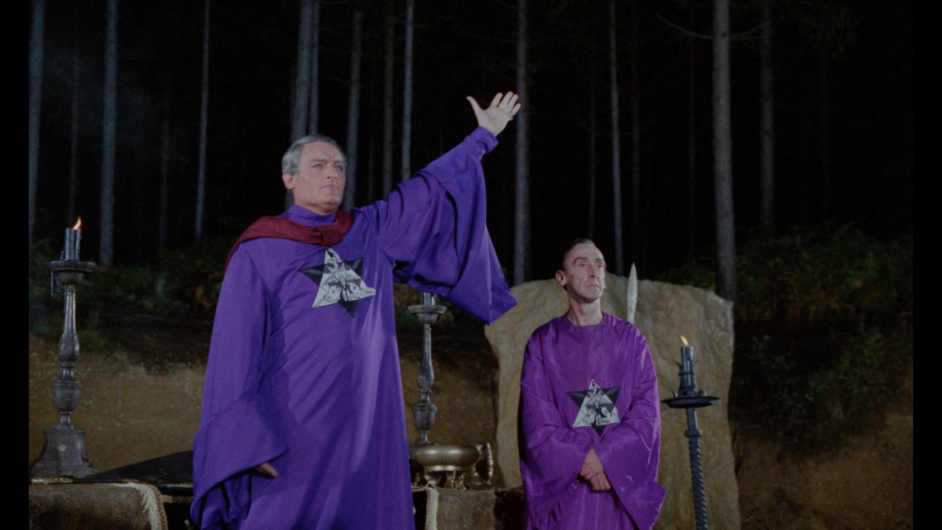 included to satisfy everyone. The new 2K scan of the interpositive held by American distributor 20th Century Fox is a total stunner with more robust and convincing colors than the earlier Blu-ray and a nice uptick in detail as well. Particularly on larger displays, it really wipes the floor with the Studio Canal transfer from start to finish. This version sports the title card for The Devil's Bride and features all of the original effects shots intact. The Studio Canal tweaked version is also included among the extras looking the same as the prior release, so feel free to compare at will. (Due to their respective logos and a BBFC card, the running times differ slightly.) The Lee and Lawson commentary, World of Hammer episode, "Black Magic," "Dennis Wheatley at Hammer" are also ported over (no "The Power of Light," not surprisingly), and you get a trio of very welcome new extras as well. An audio commentary with Steve Haberman, Constantine Nasr, and Richard Christian Matheson (son of Richard and a screenwriter in his own right) is a very thorough and informative conversation about the film with multiple subjects packed into each minute, with some fascinating insights about elements of Wheatley's novel that made it into Matheson's script but not quite to the screen (including a pre-Hitler swastika and a mummified penis; can't imagine why those got dropped!). They also point out one great scene cited as perhaps the best acted in any Hammer film, note some character variations compared to their literary counterparts (including the original Judaism of one of our heroes), and the nature of the film's visual effects as a product of their time and an extension of the story's function. The featurette "Satanic Shocks" (29m59s) features the always enthusiastic Kim Newman who hails Matheson as the "unsung hero" of the film (albeit denigrating the source novel a bit more than it deserves) and really goes into story's place in the scope of Wheatley's work including the characters' previous adventure and the state of Hammer at the time. "Folk Horror Goes Haywire" (24m8s) is an equally worthy analysis from Jonathan Rigby contextualizing the film as an unusual entry from the height of the summer of love and a timeless slice of supernatural horror from Fisher, whose career had been sidelined a bit by two freak accidents outside the same pub. He also goes a bit into Hammer's push to cast Charles Boyer in the Lee role, which would've been... interesting. The U.K. and U.S. theatrical trailers are also included along with an image gallery (4m37s) including some priceless portrait shots of the cast. SCREAM FACTORY (BLU-RAY) (2019 SCAN)