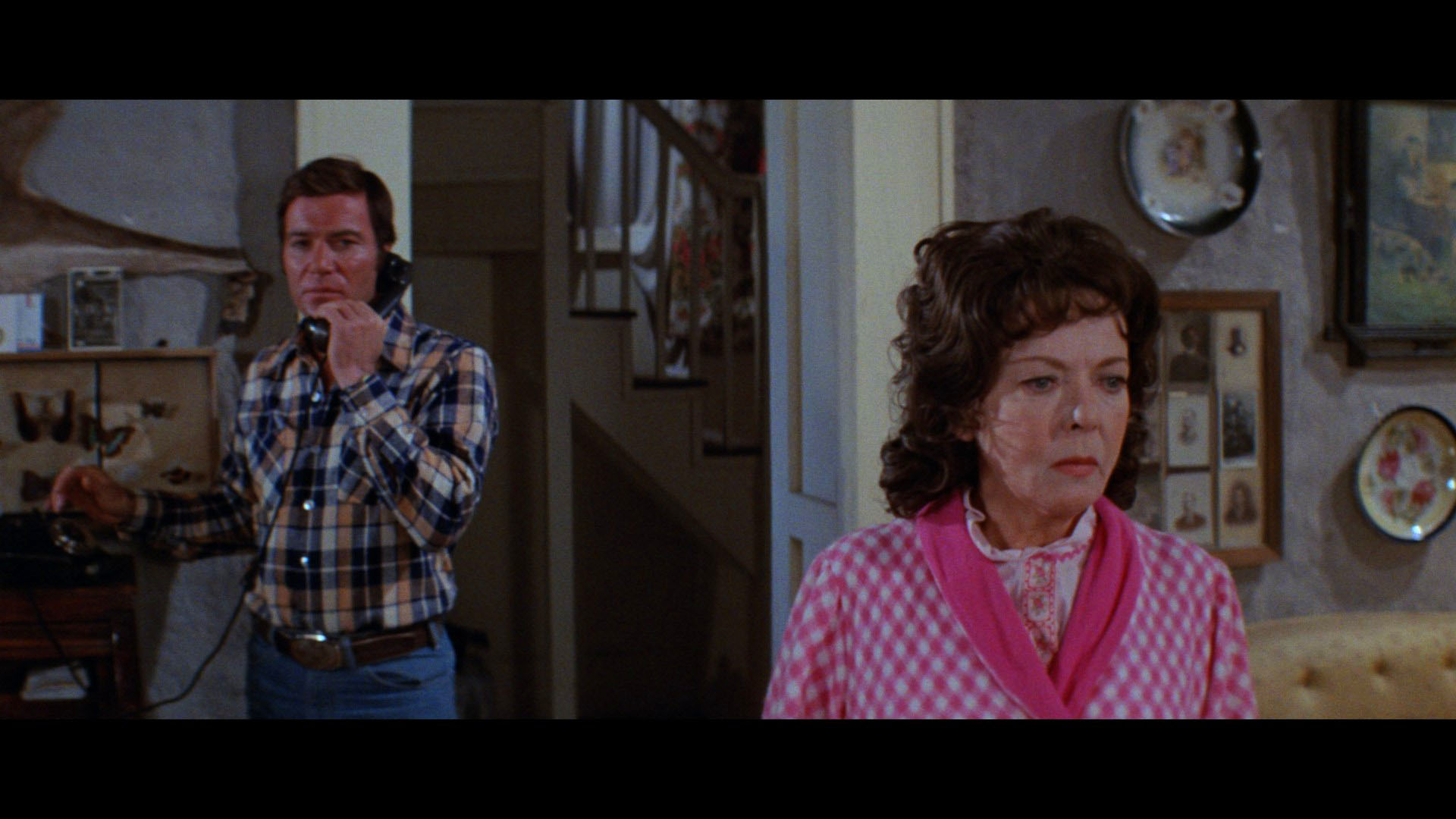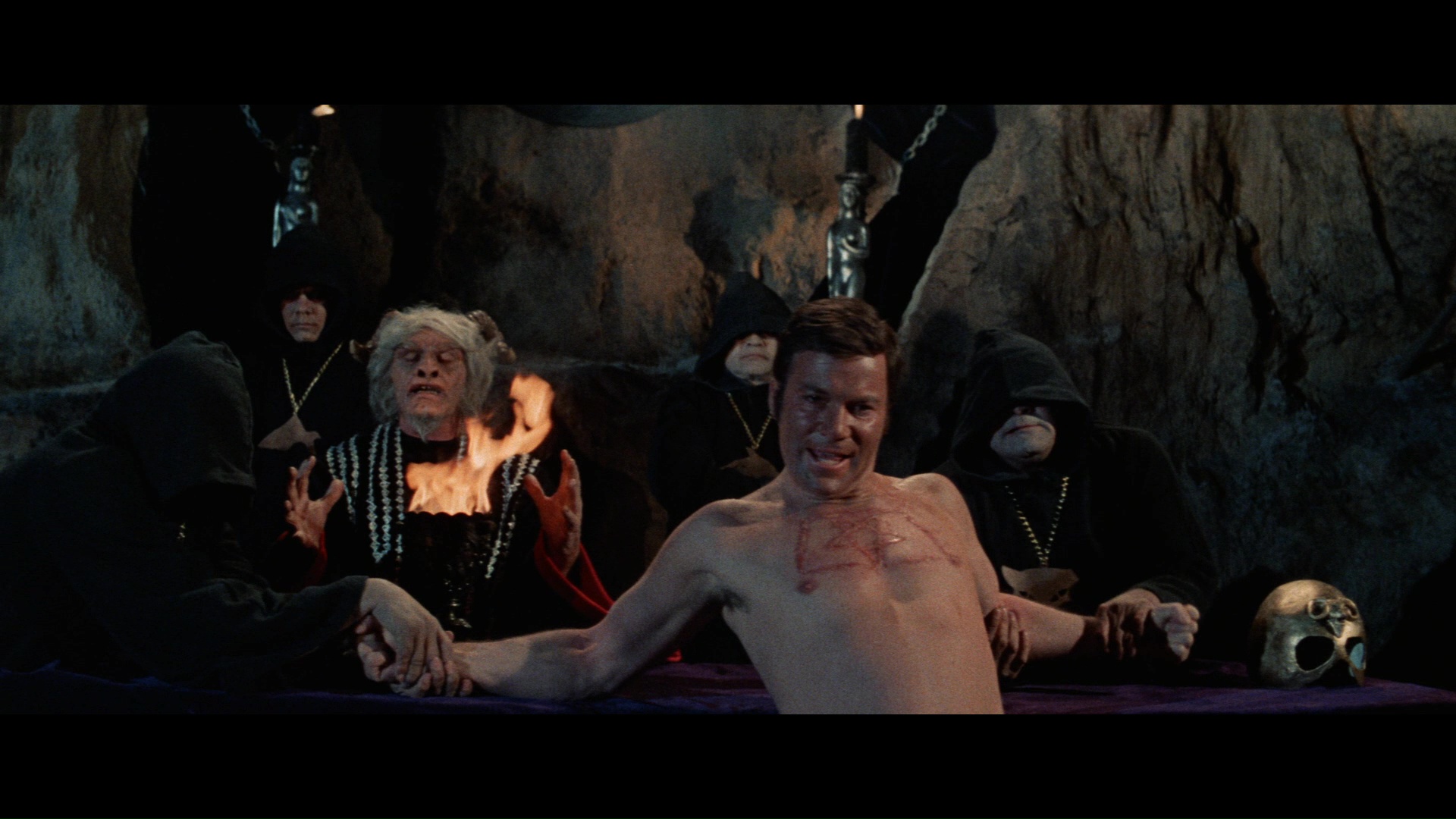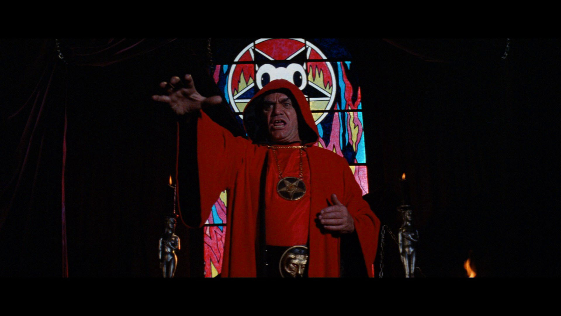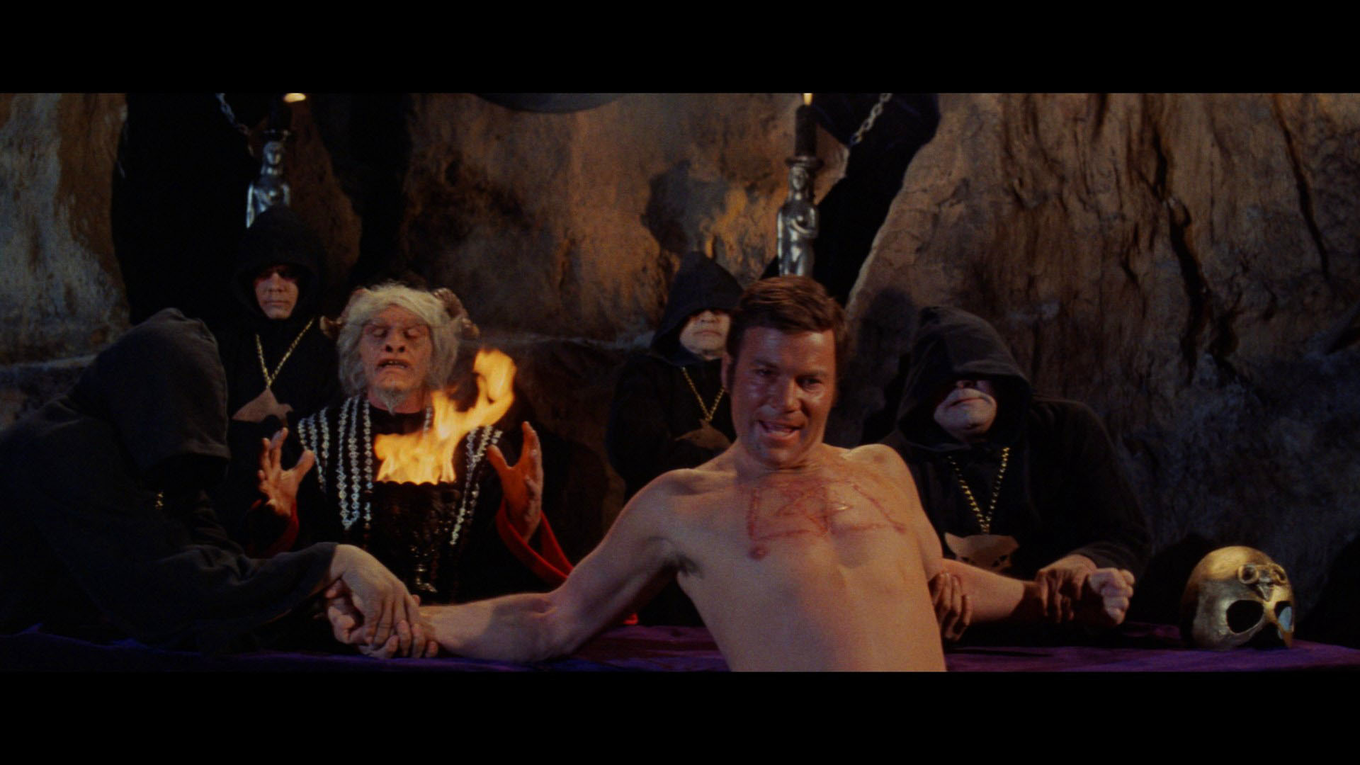 In 2017, Severin Films gave the film a welcome HD upgrade with a Blu-ray release (and separate DVD reissue) with a multitude of options including a limited slipcover, a Corbis pendant, and a bundle with Beyond the Seventh Door. The transfer looks very impressive if you're familiar with the look of this film; it has that scruffy '70s look it's always had, but the jump in detail is substantial and the vivid colors, especially those blazing reds, are now resolved far better than NTSC could have ever handled. A few flaws that have been baked into The Devil's Rainthe film's opticals are still here, most notably that blue scratch that was apparently part of the printing process to create the main title card. The standard English track sounds quite good for such a fairly basic track, and optional English SDH subtitles are provided along with Spanish and French dubs (also DTS-HD MA mono).