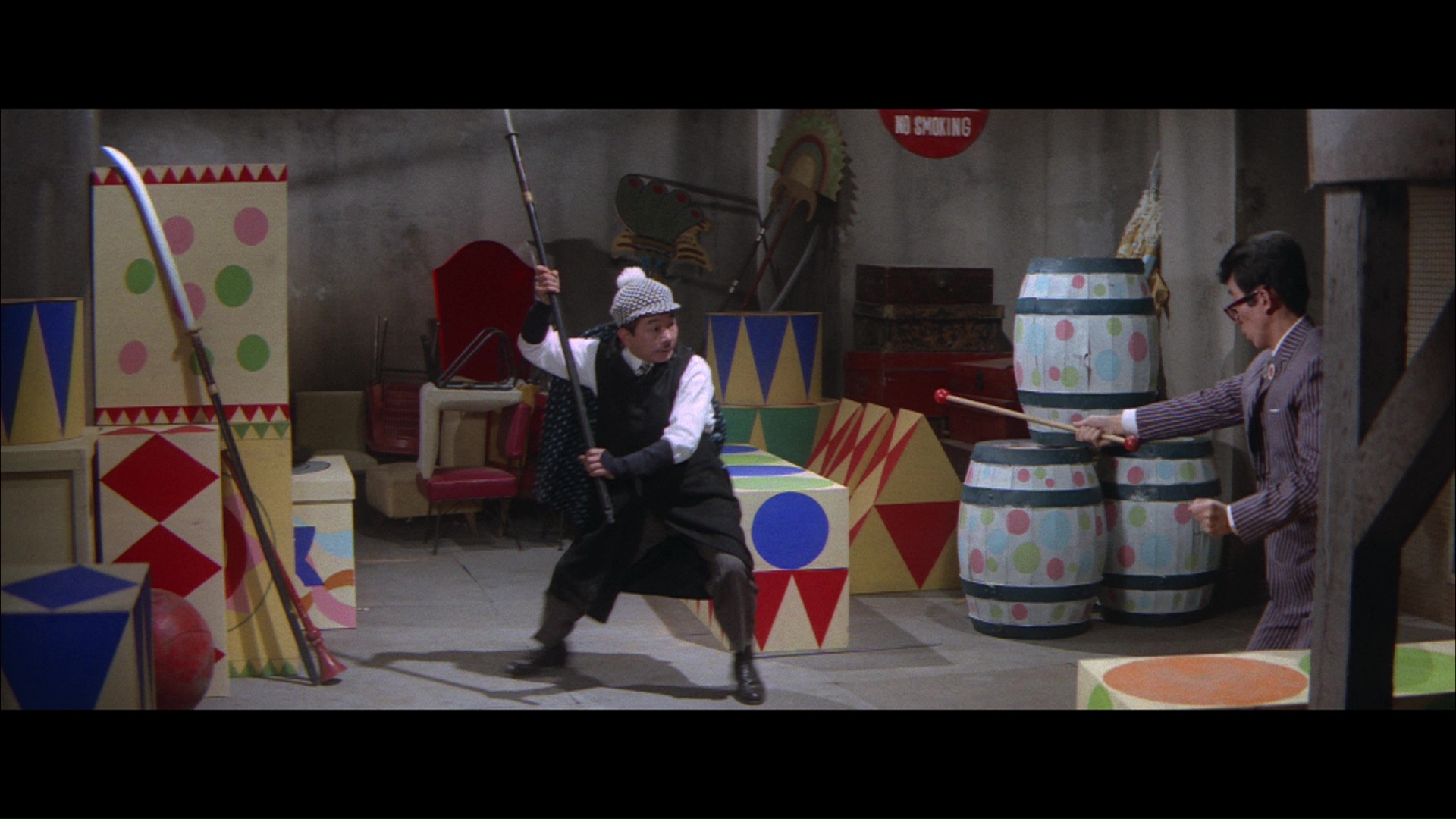 Frank Tashlin, and Mad magazine. In a rough Japanese port town, someone's gunning down criminals starting with big shot Mr. Yoyogi and leaving ripped spade playing cards at the scene. Yoyogi's cohorts, who specialize in drugs, prostitution, and other vices, get other spade cards as a presumed death threat, with the sequence determined the order they'll be taken out. The panicked crooks ring up the title organization, which sends out a call for assassins to take care of business. All of them are eccentric goofballs who come into town via different modes of transportation, and of course, nothing goes as planned as murder attempts backfire, motives get crossed, and Shishido gets to show off his cool sunglasses. You also get some geisha drag comedy, a little boy aspiring assassin (Shiraki) dressed like Oddjob from Goldfinger, a lot of references to poet Heinrich Heine, the most absurd mass assassination scenes before Massacre Mafia Style, and strange commentary about obsessions with baseball and TV violence. More like a string of bizarre comedy sketches than a normal narrative, this one starts off at full volume with a threat to the viewer that they'd better laugh with the movie or get killed, and it never settles down for the remaining hour and a half. The high-pitched performances may irritate viewers unaccustomed to acting pitched this broadly, but it's a fascinating and very entertaining comedy if you're in the right frame of mind.