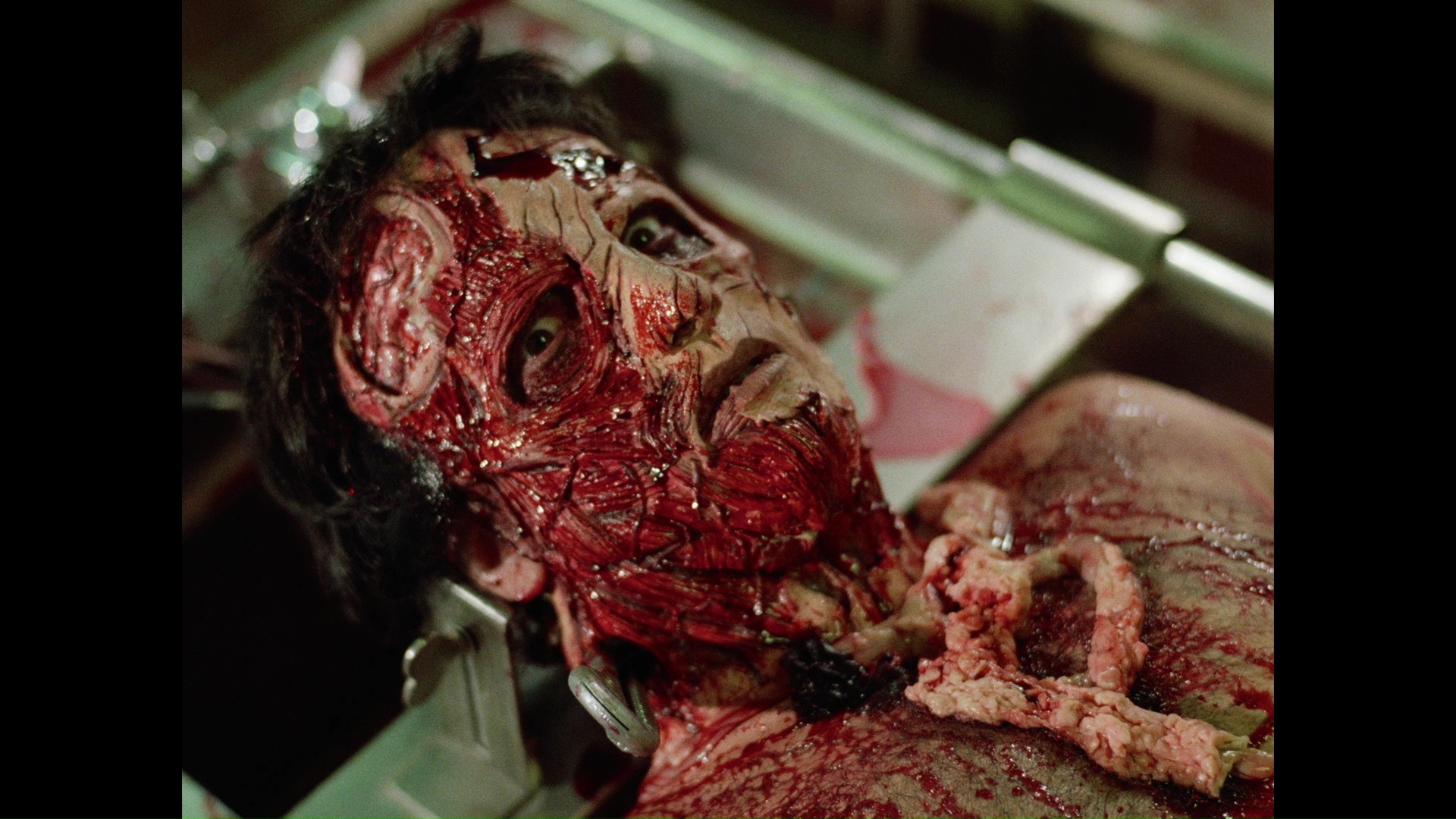 Interestingly, there's no new material here with the past participants; instead you get a much need and welcome audio commentary with Rick Marx (mentioned above) in conversation with Howard S. Berger, spending more time chatting about his incredibly wild journey through the movie world than on the actual feature at hand. There's quite a bit about Doom AsylumChuck Vincent of course (including the classic Roommates), and detours through other exploitation alleys along the way touching on everything from the differences between entertaining people on film versus video to the commercial demands of X-rated Doom Asylumfilms versus more mainstream ones. They also discuss one major novelty of this film: an '80s horror film take takes place entirely in daylight and doesn't rely on jump scares. A second audio commentary, also new, features the lively podcasting gang at The Hysteria Continues offering their own take on the film. Among the highlights: pointing out the power tool mayhem that would never have flown had this gotten a U.K. release back in the day; tying the film to the direction of the slasher craze which was on a down-slide at the time; the joys of spotting Slayer graffiti in the background; and the brief trend of mixing hard rock and horror films, to just give you an idea. Quite a fun party track, especially if you're a fan of the film. Star Ruth Collins, who has the most flamboyant role, appears for a new interview, "Tina's Terror" (17m56s), discussing the unusual way she got the role after it had already been cast with someone very different, her fond memories of her director, and the inside scoop on that unforgettable rooftop chicken-eating scene. She also verifies the stories about the last-minute negotiations involved in her brief topless scene, which wasn't in her original contract. In "Movie Madhouse" (19m), director of photography Larry Revene explains some of the shortcomings of the production (including a short script that necessitated the inclusion of those Slaughter clips and a completely needless second unit), his connection to getting this role via a gig on an Armand Weston production, the art of doing wheelchair dolly shots, and an unforgettable directing mantra from Friedman: "Think cleavage." Special make-up effects creator Vincent J. Guastini turns up for the third and final new featurettes, "Morgues & Mayhem" (17m38s), which is quite an entertaining peek at how he was just starting out at the time learning the ropes from masters like Dick Smith, with the effects for this film "done out of my mother's pantry." He's full of stories about the resourceful methods used to create the effects as well as tangents like the homeless people and rumored dead bodies in the real asylum location. He also points out a gaffe with a blood tube that will forever alter the climax of the film once you've noticed it. The earlier DVD featurette with Kogan, Friedman and Tasgal is ported over, and a stills gallery (3m5s) is also included. The reversible packaging design sports a new cover design by Justin Osbourne, and in the first pressing only, an insert booklet is included with liner notes by Made for TV Mayhem's Amanda Reyes.