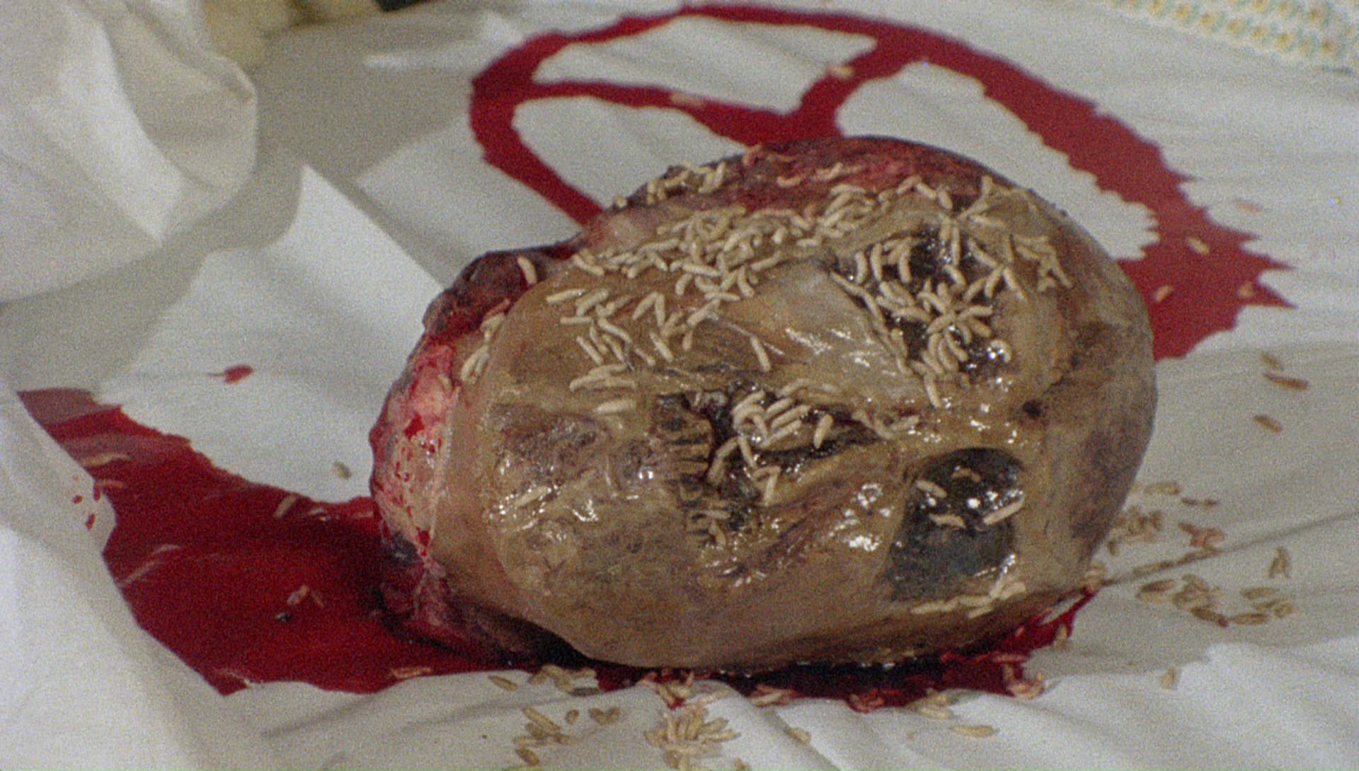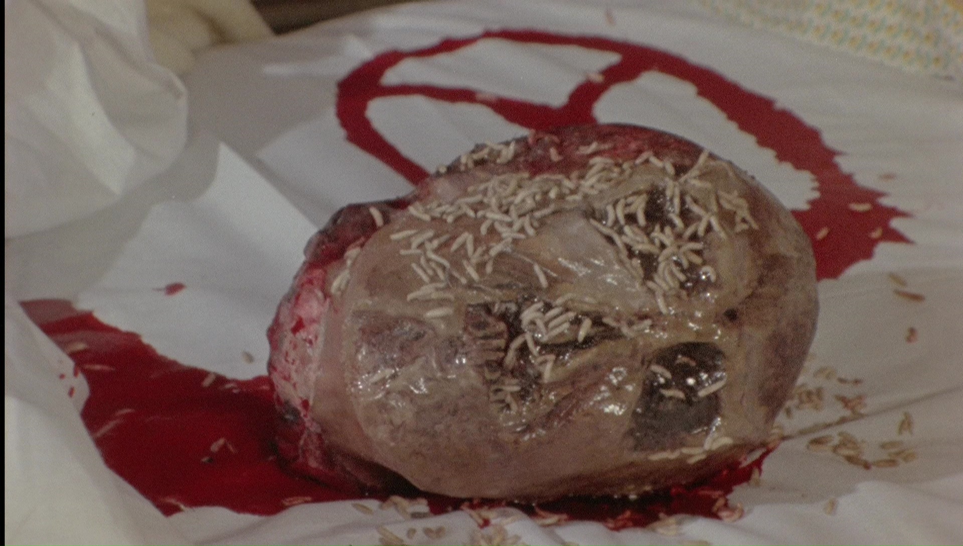 county morgue and taking off with random body parts. One of the parties responsible is soon caught in the act of eating flesh and pursued until he plummets to his death out of a window,