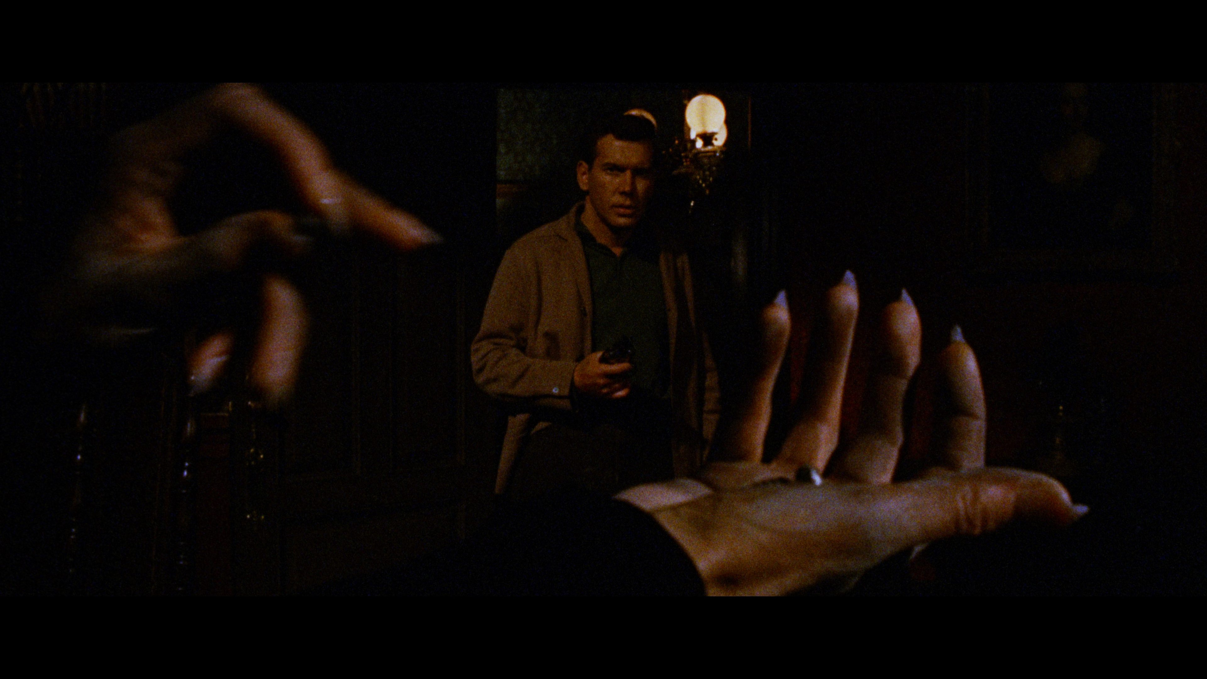 Dr. Terror's House of HorrorsThe best option by far though is the 2024 UHD and Blu-ray set released in the U.S. by Vinegar Syndrome, which sports a gorgeous 4k scan from the original camera negative. Colors are Dr. Terror's House of Horrorsextremely intense and accurate, detail is pin sharp, and the ending is uncut and presented as intended. The UHD in particular is a very heady viewing experience and comes highly recommended, while the DTS-HD MA 2.0 English mono track sounds excellent and features English SDH subtitles. Ported over from the Optimum release are a solid audio commentary by Francis with Jonathan Sothcott about his work on this film and at Amicus in general, a 7m7s gallery, and a "House of Cards" (57m50s) making-of documentary with Reece Shearsmith, Jonathan Rigby, Jo Botting, and Kevin Lyons analyzing the film's use of horror tropes and its place in the British horror canon. From the 2022 U.K. reissue you get archival Derek Pykett video interviews with actors Kenny Lynch (24m42s), Ann Bell (21m22s), and Jeremy Kemp (8m13s), which are a bit technically rough but nice to have for the memories of working on the film and rubbing shoulders with a formidable roster of costars. Also included are separate archival audio interviews with Subotsky (12m21s), conducted in 1985 with Philip Nutman, and Rosenberg (1m50s) about the start of Amicus and this film's role in getting it off the ground. "A New Home of Horror” (14m50s) features previously unreleased interviews with actress Katy Wild, second assistant director Hugh Harlow, propman Arthur Wicks, continuity supervisor Pauline Harlow, and dubbing mixer John Aldred, with short but welcome anecdotes from the production about the simple but effective visual effects, the process of packing a lot into short horror stories, and working with the fledgling company at a turning point in local genre filmmaking. In "Tales of Terror" (39m2s), author Stephen Thrower provides another of his incisive breakdowns with some great bits about each of the stories and thoughts on how the film carved out a path for its anthology successors; his dissection of the peculiar musical logic behind the voodoo segment is a particular highlight. Also included are a second gallery (1m55s) and the English, German (Die todeskarten des Dr. Schreck!), and Italian trailers.