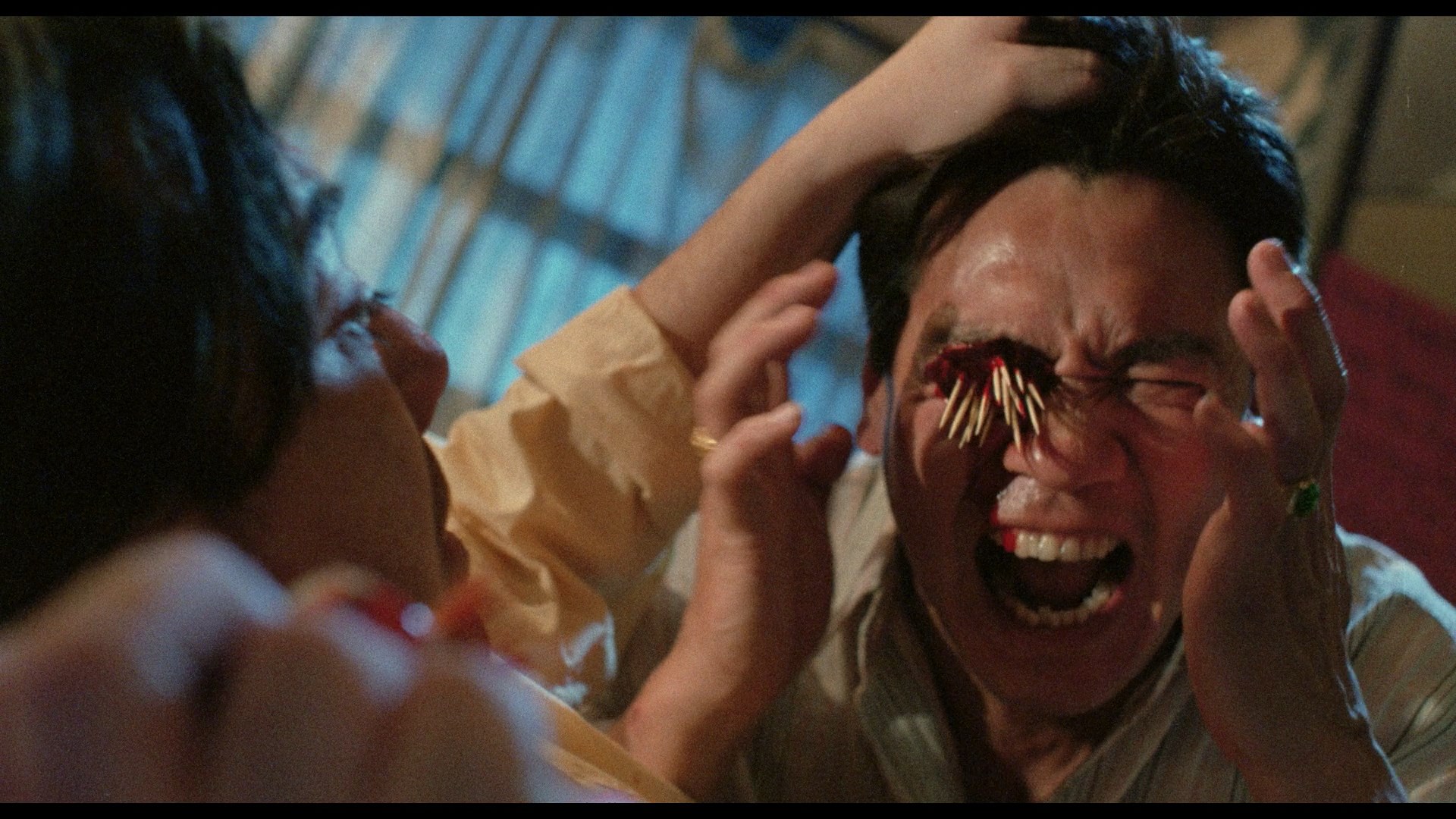 Proving that we truly live in a time of miracles, Vinegar Syndrome decided in all its mad glory to bring Ebola Syndrome back to the world as a lavish 2021 edition on 4K UHD(!) and Blu-ray, featuring a gorgeous scan from the original negative and completely uncut for the very first time for legit English-speaking consumption. All the cranium abuse, bodily functions, and corpse skinning are here completely intact, and the quality leap here is very impressive with fine film grain, excellent detail, and convincing color timing throughout. The UHD looks especially good, bringing a lot of punch to the more vibrant colors including some very robust red blood when it starts spraying. The DTS-HD MA Cantonese 2.0 mono track sounds great with no issues to report, complete with optional yellow English or English SDH subtitles capturing all of the profane dialogue perfectly. Ported over from the Discotek release are a restrained but sometimes very funny audio commentary with Yau and Wong (which alternates between English and Cantonese, with subtitles throughout) and a video interview featurette with the pair (15m39s), mostly focused on Yau. Between the two you get to find out about how the film evolved from a more straightforward violence and softcore sex project into an "anarchy" movie (i.e., nutso extreme black comedy), what Wong thinks about his significant follicle changes since then, the social commentary buried in the story (a Yau trademark), the decisions about how far to take the more button-pushing material, the changing trends in HK cinema and editorial styles, and the ins and outs of local censorship including the sometimes odd reasons for getting a Ebola SyndromeCategory III rating. However, Yau also turns up here for a new video interview (21m52s) looking back at '90s Hong Kong filmmaker, more about the three-tier Ebola Syndromerating system, a rebuttal to the theory that Ebola Syndrome as a spoof cat Category III films, his working relationship with director of photography Puccini Yu, his approach to action filmmaking including his triad films, and more. Yau also pops up for a brief intro to the film (35s) and an amusing "Cantonese with Dr. Yau" (12m4s) discussing the sometimes intricate (and occasionally lewd) challenges in translating the language to English subtitles, pointing out how some terms can even differ from one generation to the next. But that's not all! The film also comes with an enthusiastic new audio commentary by film scholar Samm Deighan, who notes how the film is close to her heart as the first Category III film she ever saw and notes the importance of having the cut footage reinstated here. She also goes into her love of the director and star, her thoughts on the various kinds of Category III cinema and the nihilistic worldview depicted in films like this, the permutations of HK crime films, the class and racial perspectives in Yau's cinema, the frequent anti-cop bias in these films (concurrent with some of them having underworld financing), and her absolutely understandable favorite plot device in the film. All of these extras are present on the Blu-ray, while the UHD retains only the commentaries so the film can enjoy an extremely maxed-out bit rate. The package also comes with an insert booklet featuring a primer on Yau's cinema by Ariel Esteban Cayer and a 2021 roundtable discussion with Cheng Yu Shing, Honkaz Fung, William Yuen, and Andy Willis about this film, its poor box office performance at the time, and the overall state of Hong Kong cinema.