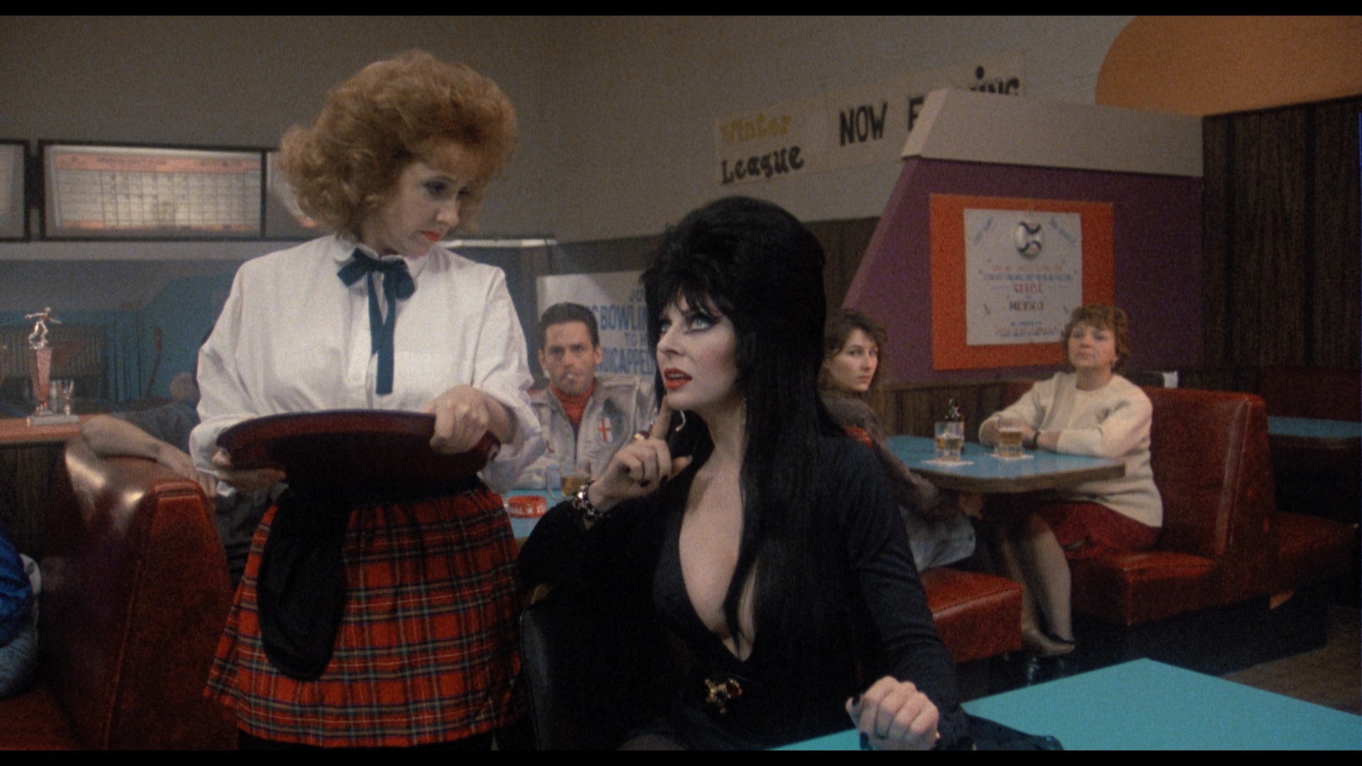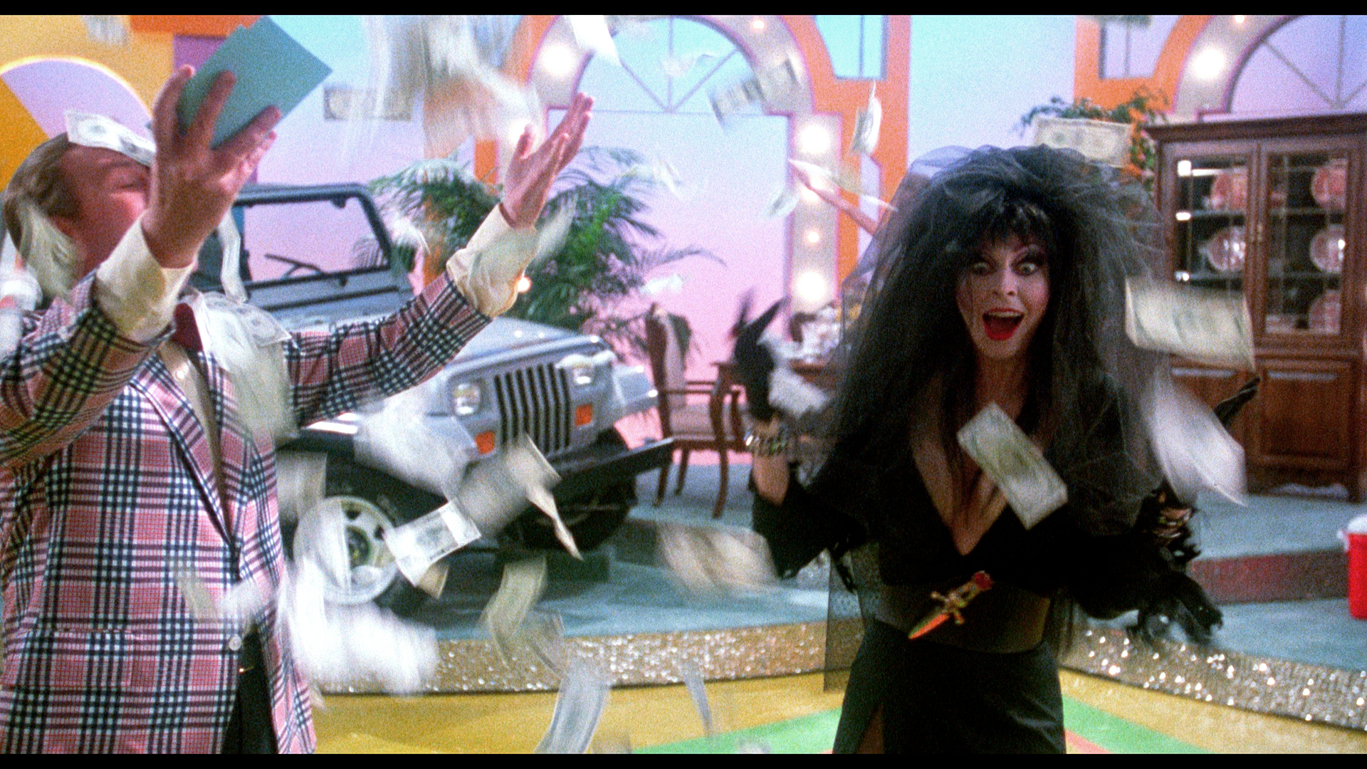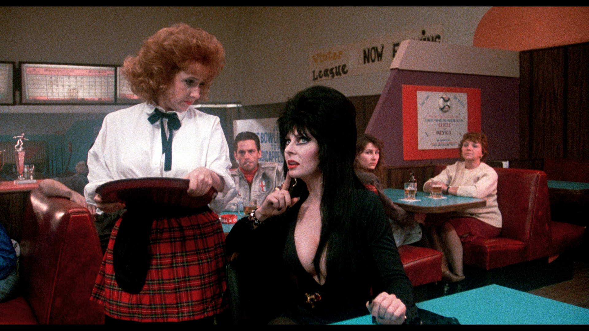 Making of Elvira: Mistress of the Dark" (97m4s), which is touted here as a newly-revised 2018 version and features pretty much every single available person who worked on the film chatting about its creation including in-depth looks at the special effects, the casting, the rationale behind some of the character choices (including her preference for the character of Bob), and the budgetary issues, among many, many other topics. In "Recipe for Terror: The Creation of the Pot Monster" (22m13s), you get another look at the creation of the effects with many of the same participants explaining how they went from concept sketches to reality. Separate extensive galleries are also provided for production stills, behind the scenes shots, special effects photos, storyboards, New York premiere coverage, and miscellaneous material including invites. The disc closes out with the U.S. theatrical and teaser trailers, while the first pressing also contains an insert booklet featuring new liner notes by Lundquist and comments by Sam Irvin on the 2012 audio commentary. In 2025, Arrow revisited the film as a UHD release featuring what's touted as a "brand new 4K restoration," and the difference is obvious with a far more dynamic color scheme including blazing blood reds and healthier flesh tones throughout. The HDR10-compatible Dolby Vision grading looks great and gives the stylized, comic-influenced look of the film quite a bit of extra punch; detail is also finer throughout, while framing looks identical. All of the extras are included here, with the film itself featuring the usual 2.0 stereo mix and the collector's booklet included in the packaging.