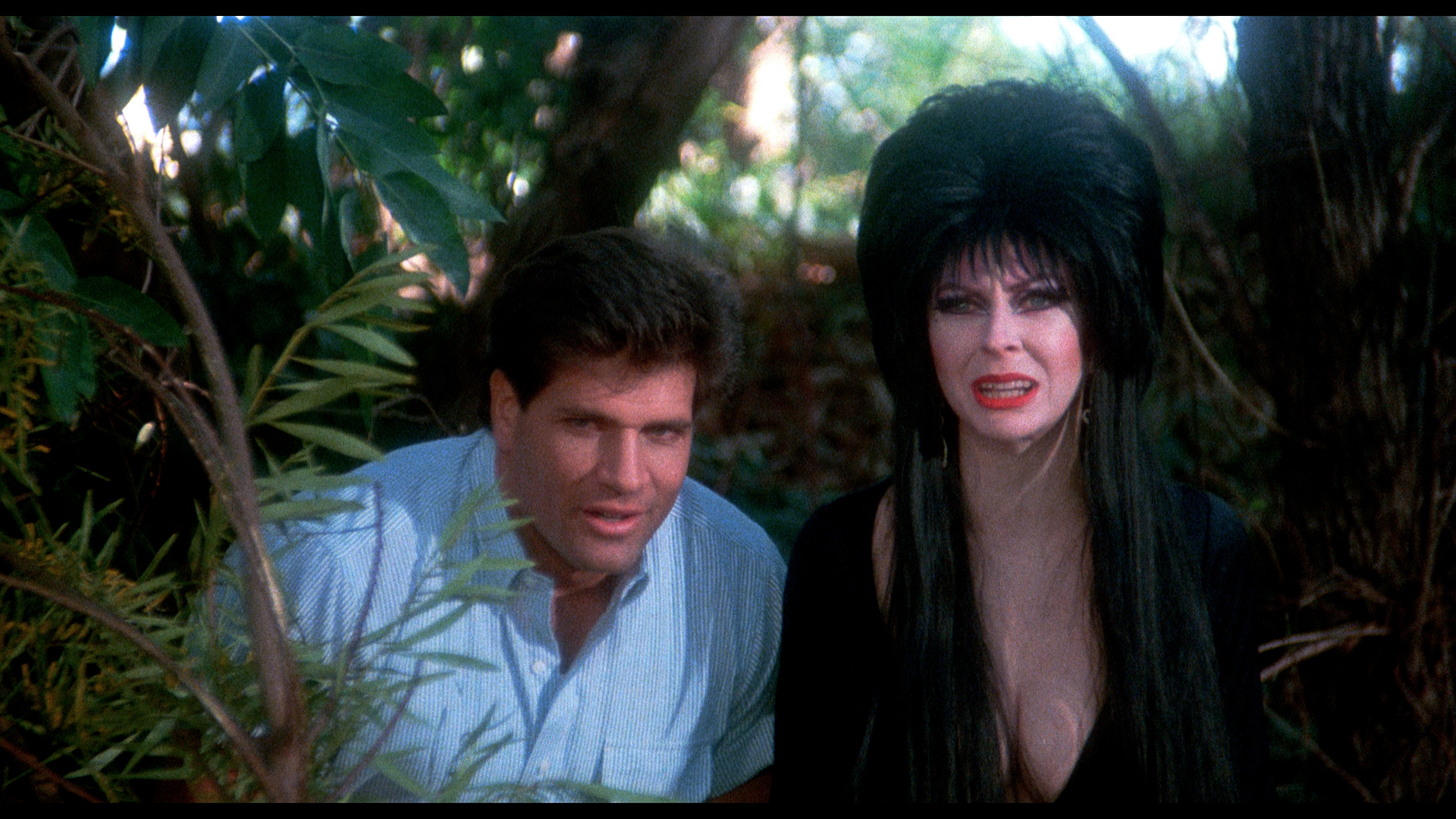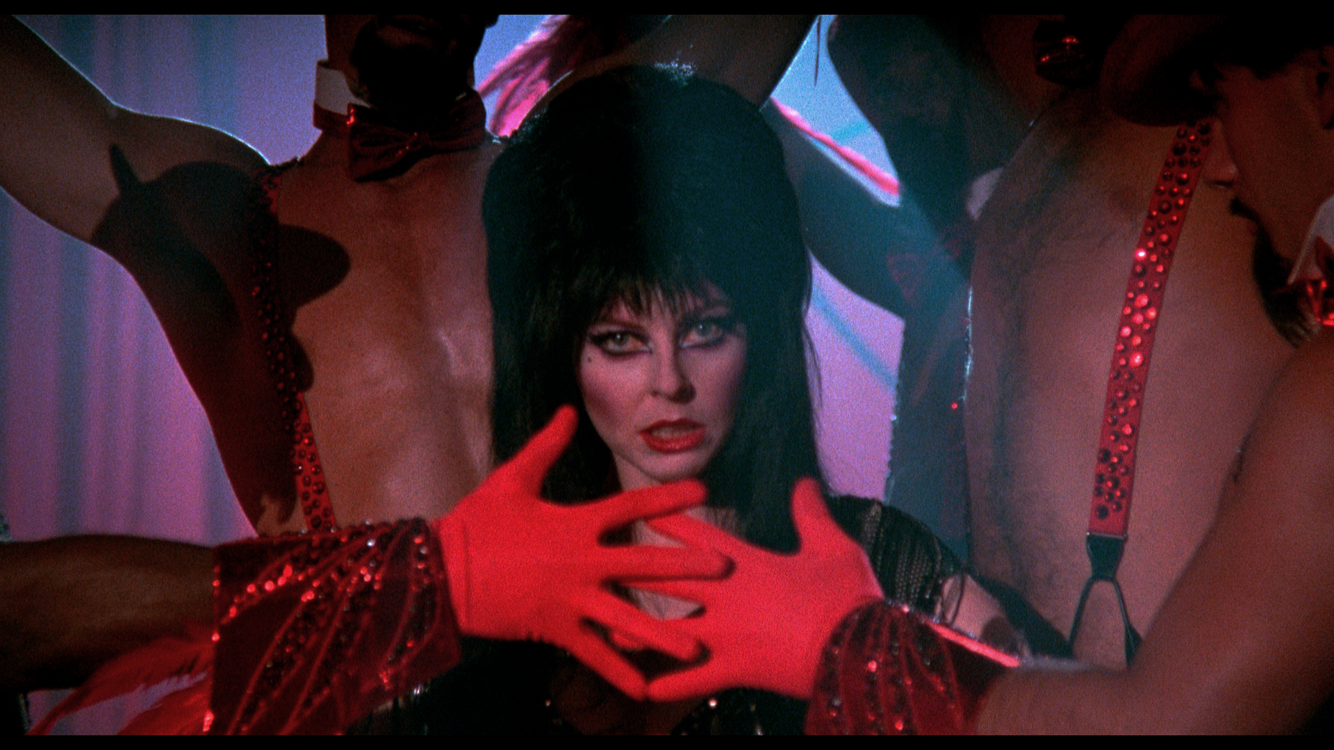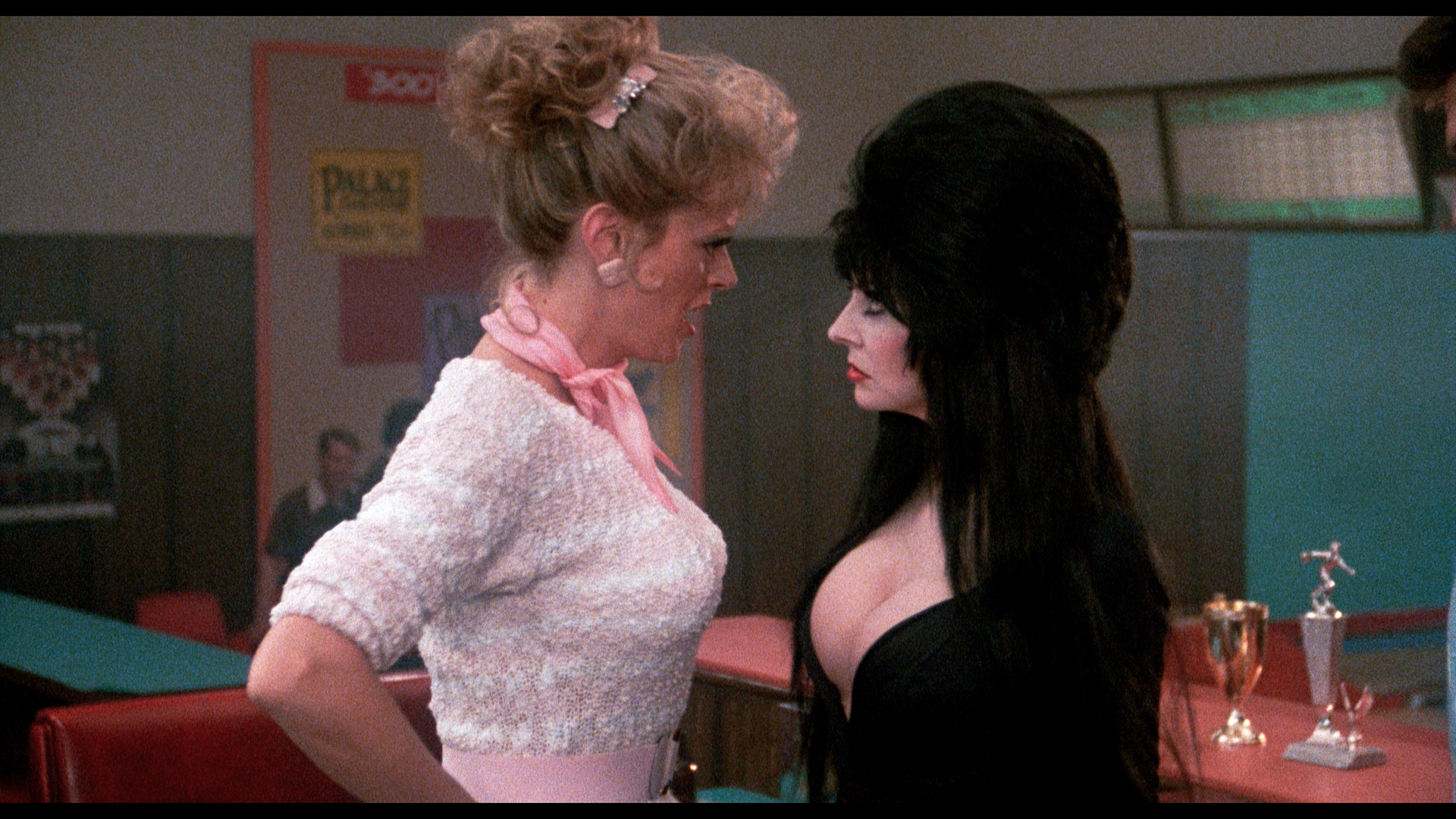 Making of Elvira: Mistress of the Dark" (97m4s), which is touted here as a newly-revised 2018 version and features pretty much every single available person who worked on the film chatting about its creation including in-depth looks at the special effects, the casting, the rationale behind some of the character choices (including her preference for the character of Bob), and the budgetary issues, among many, many other topics. In "Recipe for Terror: The Creation of the Pot Monster" (22m13s), you get another look at the creation of the effects with many of the same participants explaining how they went from concept sketches to reality. Separate extensive galleries are also provided for production stills, behind the scenes shots, special effects photos, storyboards, New York premiere coverage, and miscellaneous material including invites. The disc closes out with the U.S. theatrical and teaser trailers, while the first pressing also contains an insert booklet featuring new liner notes by Lundquist and comments by Sam Irvin on the 2012 audio commentary. In 2025, Arrow revisited the film as a UHD release featuring what's touted as a "brand new 4K restoration," and the difference is obvious with a far more dynamic color scheme including blazing blood reds and healthier flesh tones throughout. The HDR10-compatible Dolby Vision grading looks great and gives the stylized, comic-influenced look of the film quite a bit of extra punch; detail is also finer throughout, while framing looks identical. All of the extras are included here, with the film itself featuring the usual 2.0 stereo mix and the collector's booklet included in the packaging.