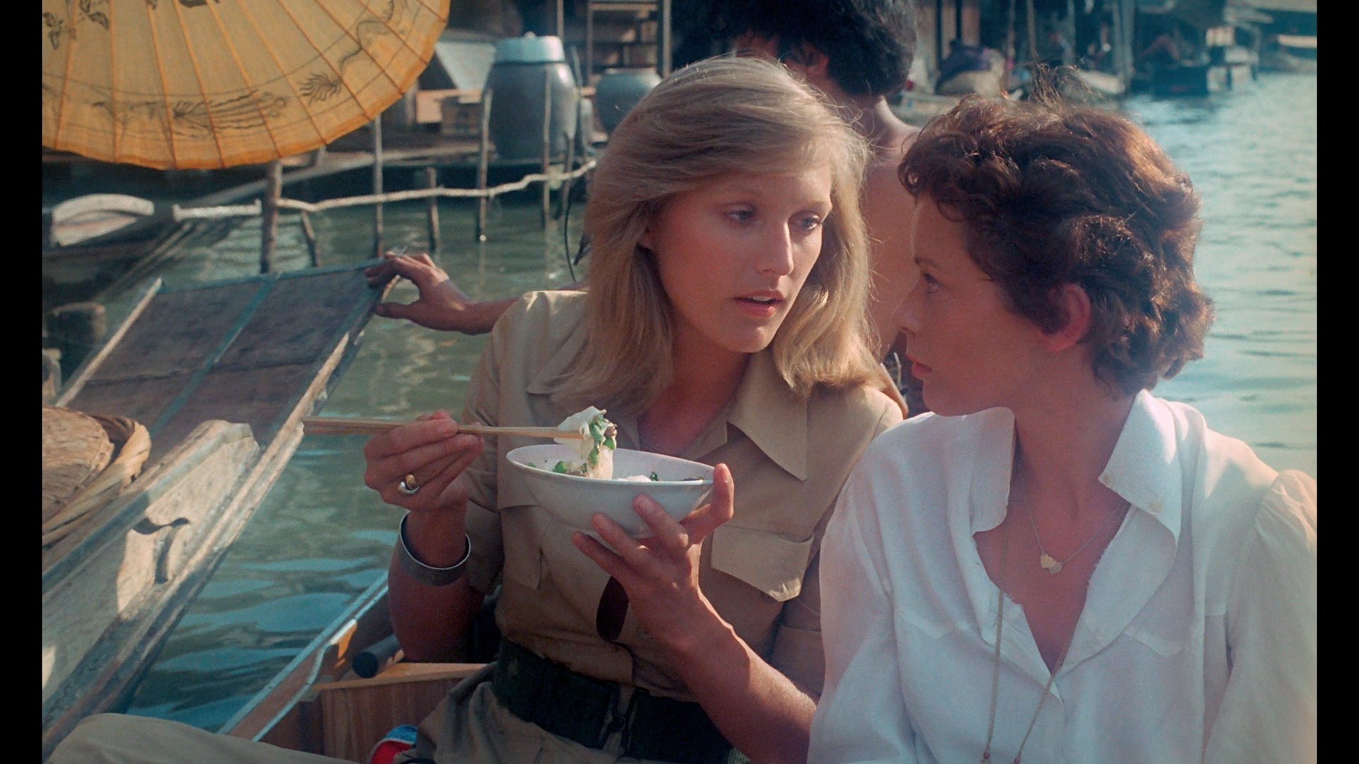 covers his own career starting in commercials and moving to vast success with this film and its successors. In “Filming Emmanuelle” (16m19s), Fraisse recalls his own experience as a cinematographer and camera operator, working to support newcomer Richard Suzuki as director of photography, the major shifts in industry practices since then especially since the advent of the Steadicam, and enjoying shooting in Thailand for the first time. In “Fabric & Fantasy: Costume As Character Development” (14m6s), fashion and costume historian Elissa Rose explores the use of color and style changing between the films as well as perceptive observations about the influence of Hollywood Pre-Code films and the myriad cultures at play in the stories charting the character’s sexual progression. In “The Channel” (14m9s), actress Liane Curtis discusses the work of her mother, dubbing artist Paulette Rubinstein (who graced many Japanese, Italian, and French productions), whose career spanned from Broadway to film work to voicing characters like this who changed the world. Oh, and Liane’s dad was Jack Curtis, the man who brought you The Flesh Eaters. Also included on the first Blu-ray is a press interview with Rollet-Andriane (2m6s) on the set of The Sand Pebbles, while a second Blu-ray features an additional
