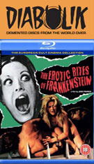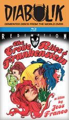 Never released theatrically in the U.S., Franco’s film did make the rounds in Canadian theaters as well as numerous European countries. Bootleg VHS copies back in the ‘80s became a hot property as collectors starting to awaken to the distinctive flavors of Franco cinema began to The Erotic Rites of Frankensteinhear about its more outrageous highlights, such as a nude couple tied back to back and whipped by the monster over a spiked floor (a scene Franco repeated with less S&M but more explicitness in his revamped version of Countess Perverse). The film is indeed wild stuff, and when it became clear that there were two versions circulating around out there, confusion erupted over what people had seen and which one actually deserved the title of Erotic Rites of Frankenstein. The longer but tamer Spanish version (La maldición de Frankenstein) bowed on U.S. DVD in 2005 from Image Entertainment with English subtitles (as just The Rites of Frankenstein since there wasn't anything erotic left), plus the stronger naked version of the whipping scene added from an inferior VHS copy as an extra. The full-strength French version didn’t get an English-friendly official release until 2015 on The Erotic Rites of FrankensteinBlu-ray and DVD from Kino Lorber, with both French and English language options as well as English subtitles. The quality’s quite strong if you know the history of the film, which looks like it was shot on short ends with lots of technical limitations and a less than pristine appearance during darker scenes. The colors are gorgeous throughout sometimes hit a level of intensity that could be mistaken for a Jean Rollin The Erotic Rites of Frankensteinfilm. This release also comes with a Tim Lucas commentary, and as always he’s quite knowledgeable as he ties this film together with both Franco’s other output and the appropriation of previous monster movie tropes. The French trailer is also included.