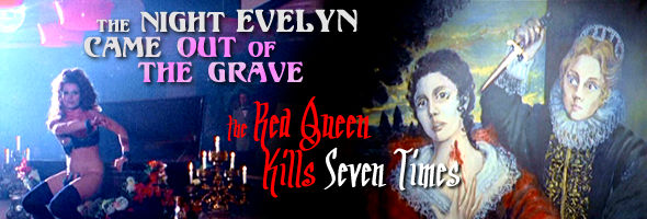 The big new extra for Evelyn is an audio commentary by Troy Howarth, author of the So Deadly, So Perverse books about giallo films. He's frank about the film's shortcomings (Steffen's contributions especially) but makes a strong case for the film's unusual place in the Italian thriller canon, also covering several other of its Italian peers relating to the cast and crew. Despite his apology at the beginning, he also handles the avalanche of Italian titles pretty respectably, too. Red Queen Kills Seven TimesRed Queen also has a new commentary courtesy of frequent pair Alan Jones and Kim Newman, no strangers to giallo analysis, who take an often amusing and informative look at the film's status within the "decadent" period of the giallo craze and its effective fusion of several talents at the peak of their powers. The always welcome Stephen Thrower offers new appraisals of both films, "Remembering Evelyn" (15 mins.) and "The Red Reign" (13 mins.), in which he offers his own take on these films' peculiar genre-twisting charms, covers their colorful and somewhat mysterious American theatrical runs, and points out some of the odd quirks of their home video histories. Running just under 10 minutes is a new, different interview with Blanc, who talks about her lengthy career acting with vain former fighter Steffen, her enjoyment of the real whipping in one big scene, and the castle locations outside Venice standing in (not very convincingly) for Old Blighty. The 20-minute "Life of Lulu" features vivacious cult icon Sybil Danning (who still looks astonishing) talking about her colorful career from her youth in Austria through her European films that led to her American work, with a particular fondness for her "free spirit" role for Miraglia. Not to be overlooked is the fact that both the English and Italian trailers for Red Queen are presented here for the first time, and they're pretty spectacular. The English one has the title The Lady in Red Kills Seven Times, one of the two under which it briefly ran in a handful of US theaters. (The other was Blood Feast, confusingly enough.) The American trailer for Evelyn is still absent, though you can find it on the Trailer Trauma 2 Blu-ray. Limited to 3000 units in each territory, the set also features a 60-page booklet with new essays by James Blackford, Kat Ellinger, Leonard Jacobs and Rachael Nisbet.