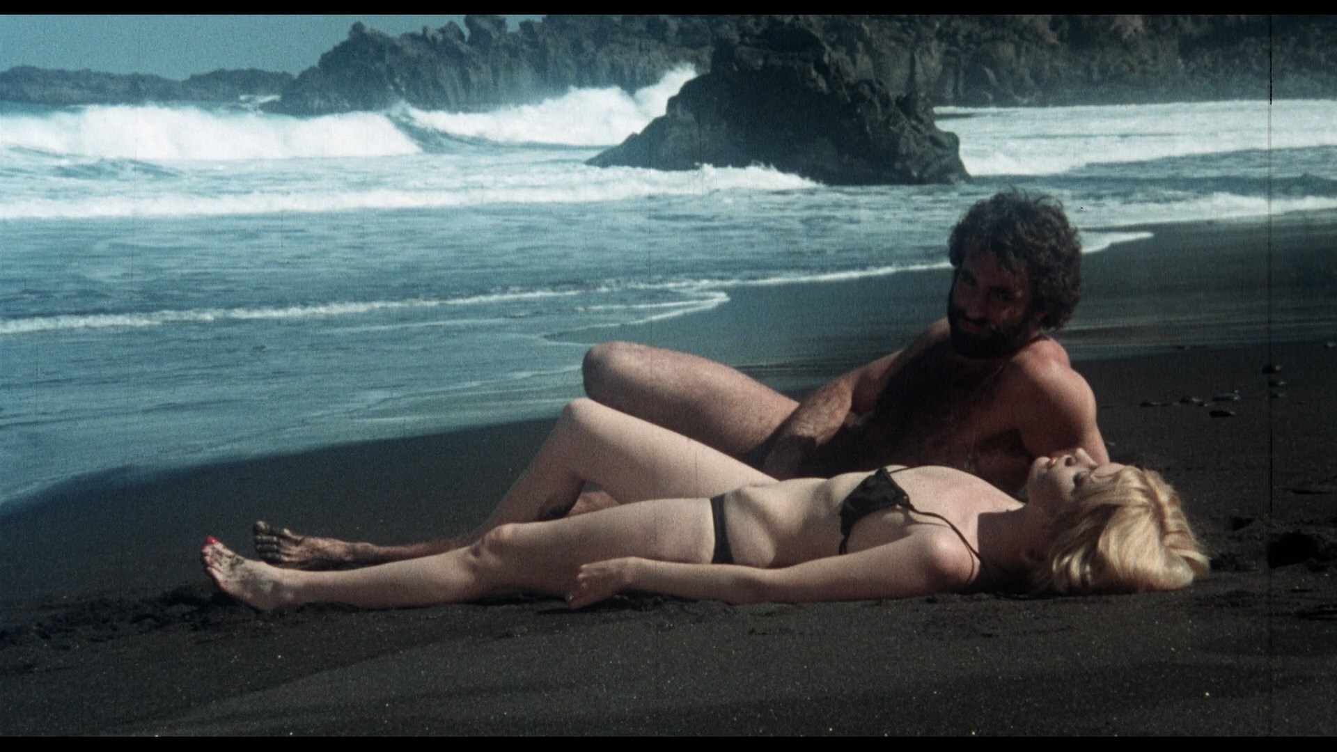 On the same disc is the much trashier Triangle of Lust, a Spanish-West German-Austrian co-production also released as Teufelscamp der verlorenen Frauen and Desnuda ante el espejo. In fact, since pre-print elements no longer exist, this Triangle of Lustdebut Blu-ray release pieces together the best existing Spanish and German prints that's a much more coherent experience than the VHS versions that once floated around (plus a bootleg DVD as The Angel and the Beasts). This one is also set on the Canary Islands and feels very Jess Franco as well (in a different way), with sexploitation director Hubert Frank (Vanessa, Melody in Love) doling out the jungle sleaze in heavy doses here. While taking a private plane ride with her married sugar daddy, danger-seeking Susi (Adriani) ends up parachuting for her life when their flight takes a dive. She ends up on a tropical island populated by Henno (Black Venus' Ceinos), Wim (Godó), Silvia (Rey), and Brit (Wondratschek), Faceswith radio reports about a band of missing robbers giving a pretty big clue about who they are. Lots of copulations, jealousy, firearm threats, and eventual deaths ensue, with a bunch of bikers playing a key role in the bizarre left turn of a final act that leads to a baffling twist ending.