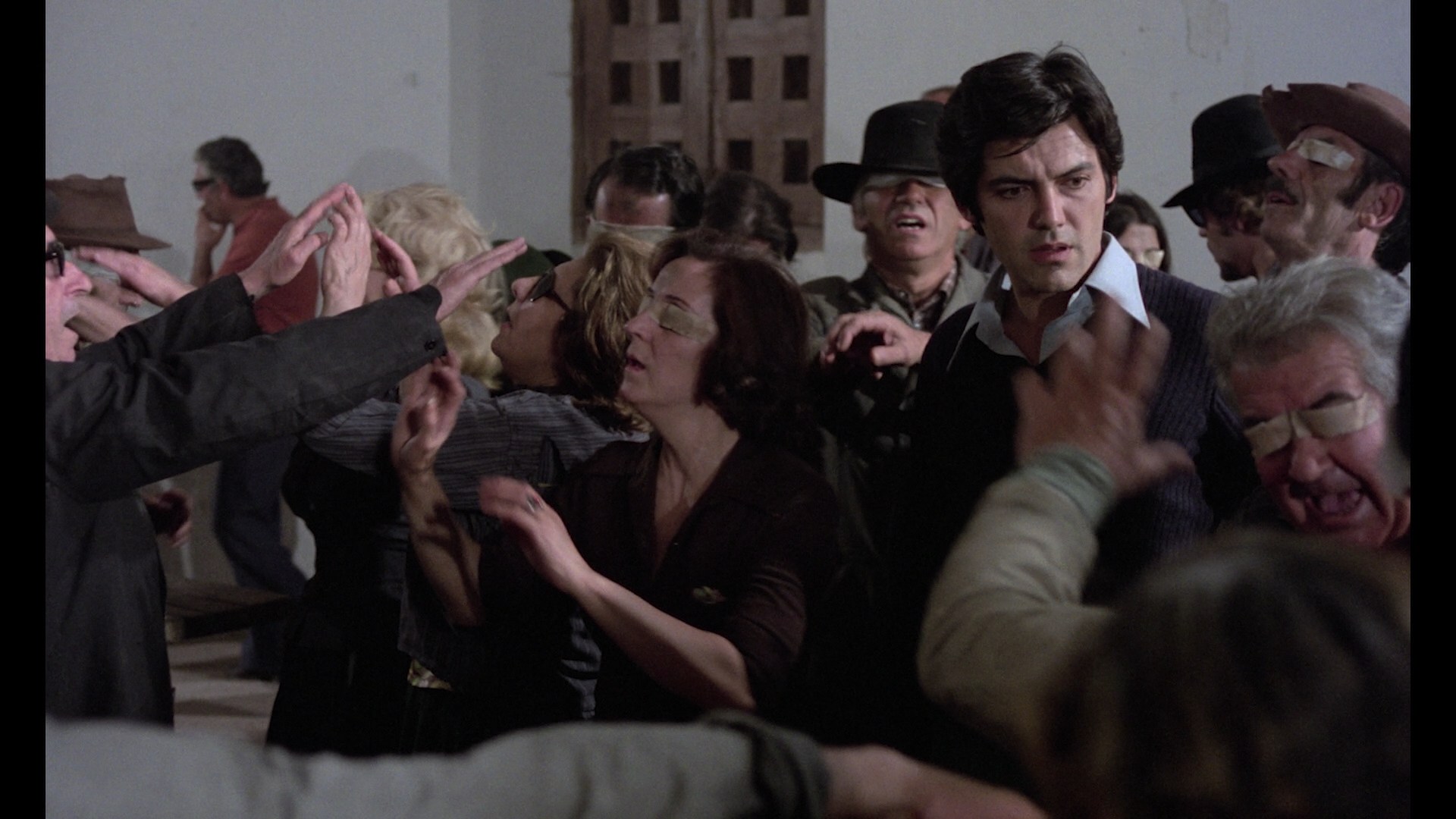 When they weren't busy teaming up for '70s The People Who Own the DarkSpanish monster movies like Werewolf Shadow, Vengeance of the Zombies, and Dr. Jekyll and the The People Who Own the DarkWerewolf, actor Paul Naschy and prolific director León Klimovsky turned out the peculiar and strangely haunting horror/sci-fi hybrid The People Who Own the Dark, which gets disc four all to itself. Inspired in equal parts by I Am Legend and The Day of the Triffids, it's a terrific film with Naschy actually taking on more of a supporting role here as Borne, a macho hunter type who joins a bunch of debauched upper class businessmen and their female companions for a weekend of fun and games in the countryside. That includes gathering in the basement to put on creepy pig masks and parade the women around in see-through gowns for some kind of kinky swingers' ritual, but they're cut short by an earth-rattling explosion above that sends a blind pigeon crashing to the floor. The maid shows up blind, too, with completely white eyes, and soon they realize that some kind of apocalyptic attack above ground has rendered most of the population dead or completely sightless. As the party hounds try to gather munitions, the blind locals become bent on irrational vengeance and start to gather outside the house as those inside also find their sanity beginning to break.