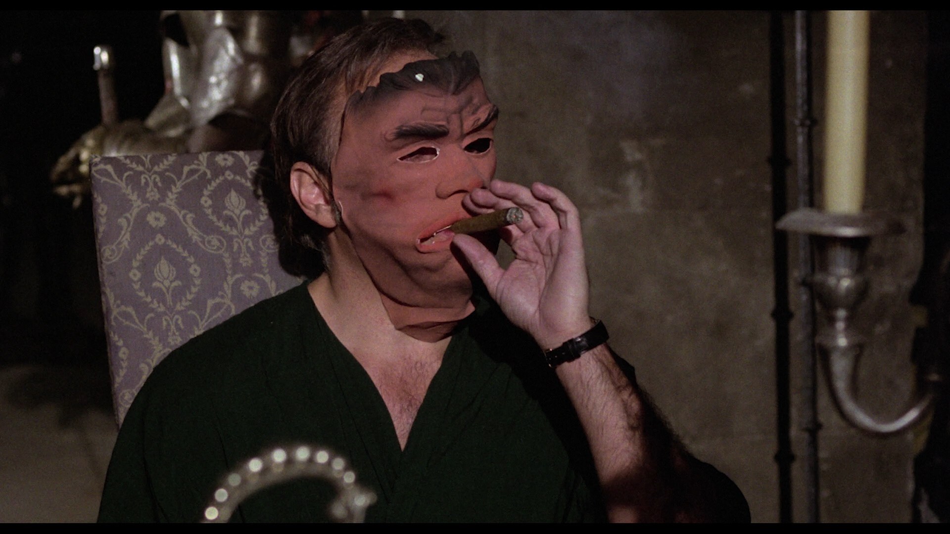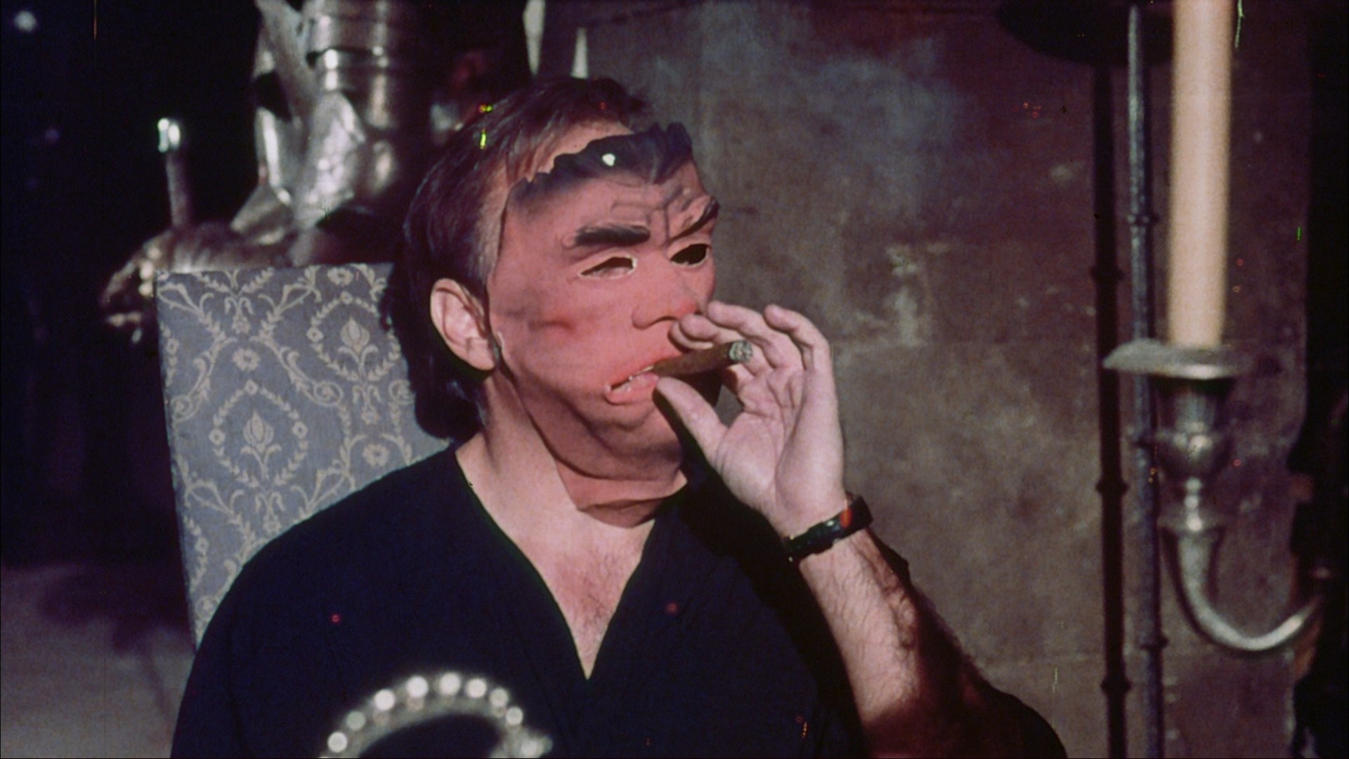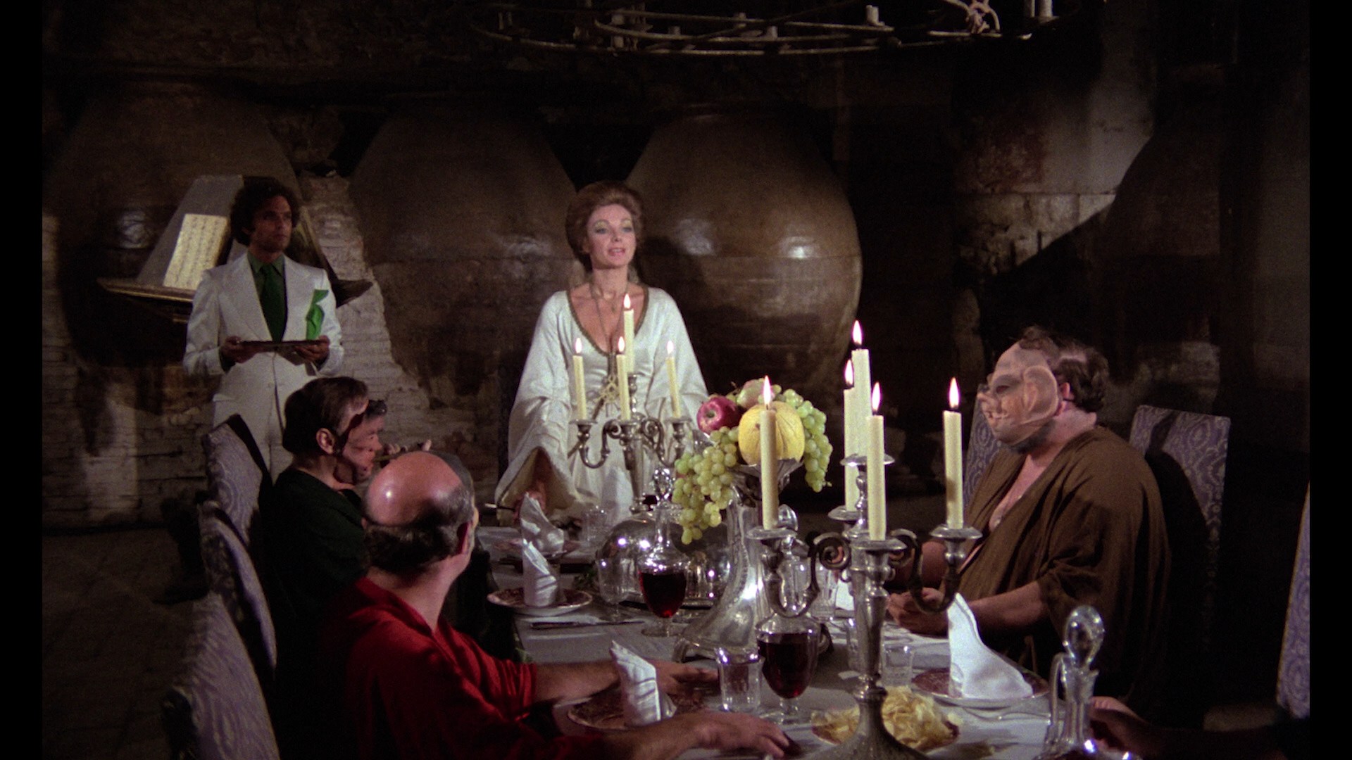 Far from your typical horror exploitation film, The People Who Own the Dark feels much more like a creepy art film than the usual Klimovsky fare. Part of that may be due to the presence of The People Who Own the Darkco-writer Vicente Aranda, the director/screenwriter of The Blood Spattered Bride and Lovers, whose penchant for dark surrealism is well in evidence here. The first third of the film feels like a dark comedy in the vein of Luis Buñuel or The People Who Own the DarkMarco Ferreri (think The Exterminating Angel or La Grande Bouffe reconfigured as a drive-in movie), but the story then takes a number of increasingly bizarre and irrational turns: one unhinged survivor taking to crawling around unclothed and lurking in the corner in his pig mask, the spooky gatherings of the titular people outside the house at night, and especially the incredible final five minutes.