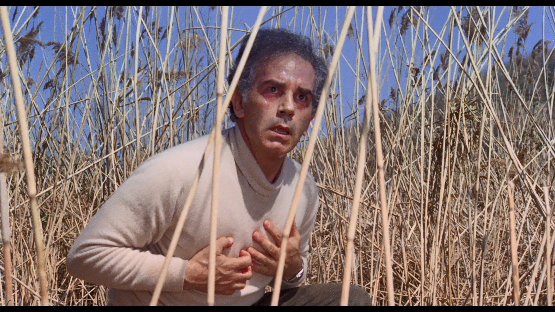 The film starts on a particularly lurid, shocking note as a half-nude woman is pursued through a reed field by an assailant wielding a large metal bar. The aftermath of his ultimately fatal attack is witnessed by Fabio Santamaria (The Dead Are Alive's Cerusico), who's gone out for a quiet afternoon of solitary fishing. He stands for several moments making eye contact with the murderer, who turns out to be a respected professor, Eduardo Ranieri (Rabid Dogs' Cucciolla). Santamaria bolts to his car and flees but decides not to go to the police, feeling he's out of danger and would only stir up trouble for himself and his wife (Brochard). That turns out to be a very bad call indeed when Ranieri goes to the authorities instead and fingers Santamaria as the culprit, with the increasingly traumatized innocent man resorting to shaving off his mustache and altering evidence to try to save his own hide.