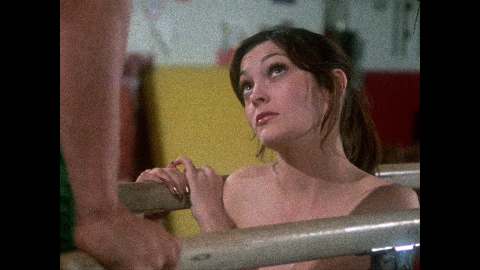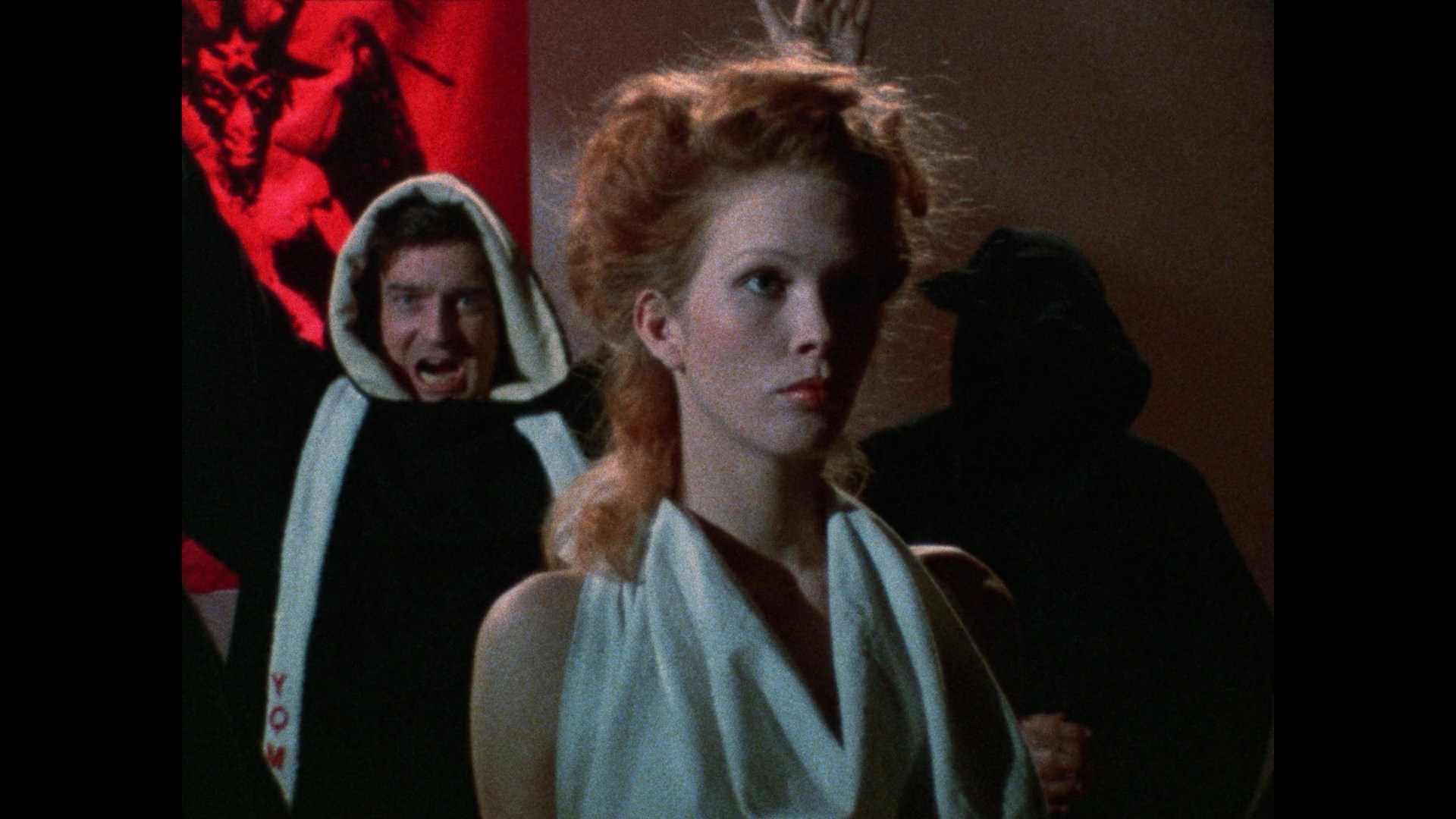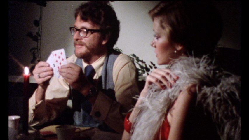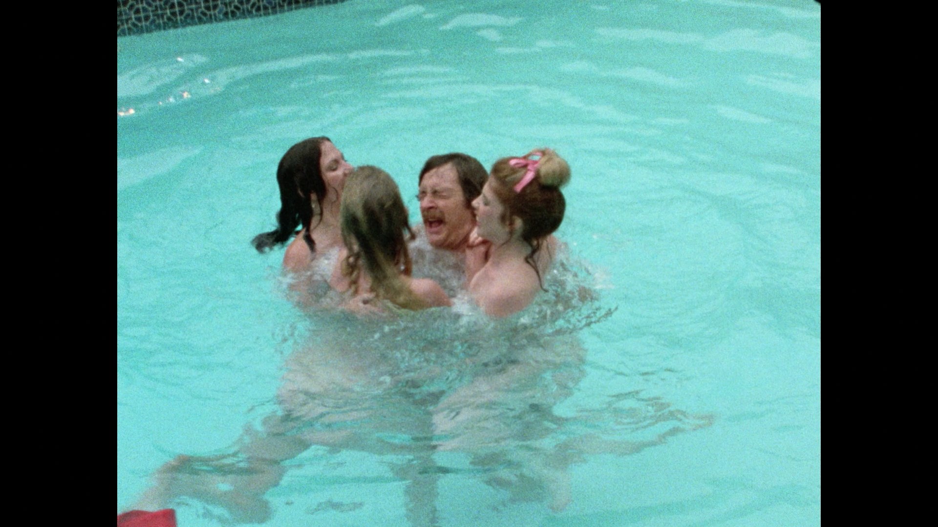 and repays him by straddling him with a strap-on in "Wearing the Pants." A young student (Rene Bond) pursued alone at night winds up in the clutches of boxer Al Williams who forces himself on her in the ring in "Nightmare Alley;" then Uschi Digart and Mara Lutra have a literally steamy lesbian encounter in the sauna ("You have beautiful breasts." "Sank you!" "I've always wanted to have bigger ones like yours!") in "The Girls." Maria Welton gets to know her banana intimately in "Fruit Salad" and goes borderline hardcore in a swimming pool with John Holmes; a gray-haired, busty mother (Candy Samples) welcomes her son home from the military with a warm bath in "Mother's Darling;" three men visit sultry Shayne's apartment and watch her perform a pretty dull strip routine in "Black Velvet;" pigtailed Roxanne Brewer (Female Chauvinists) enjoys some "After School" time with her weak-hearted teacher by flashing her goodies at the blackboard; and finally Serena is stripped and ravished during a "Blood Orgy" by devil worshipers in jockstraps, led by uncredited smut goofball Charles Orlando.