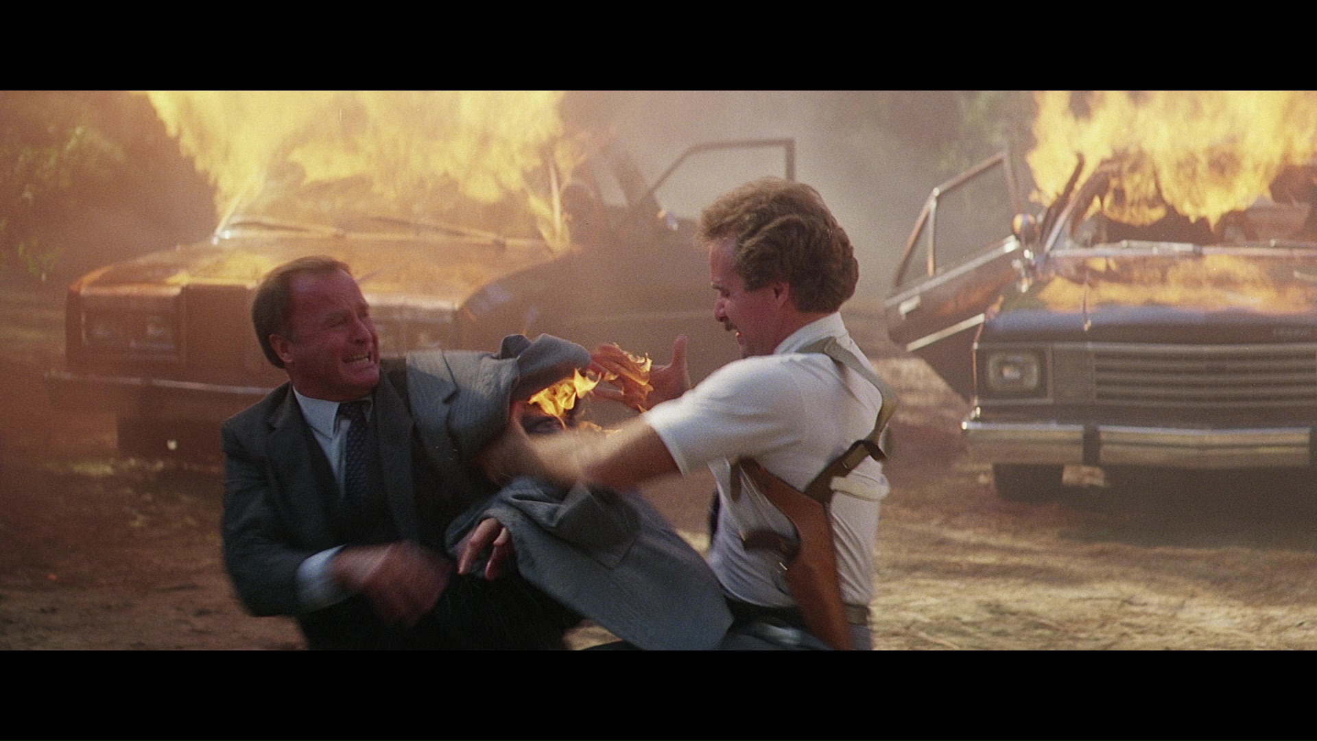 Not surprisingly, Firestarter has been a home video mainstay since the '80s including a DVD bow from Image Entertainment, a Blu-ray and DVD reissue from Universal, and a double feature DVD with Firestarter 2: Rekindled under the studio's icky, thankfully retired "The Franchise Collection" banner. Scream Factory gave the film its first bona fide special edition on U.S. Blu-ray in 2017, with a U.K. one following in 2018 from Plan B(a label from the same folks behind Signal One). Both releases feature a new 2K scan of the interpositive, which looks surprisingly gorgeous and easily blows away the earlier Universal Blu-ray; fine detail is very impressive with the frequent wide shots focusing on characters positioned at opposite ends of the frame relying more than ever on little touches in the production design around them. Those deep, inky blacks are beautiful to behold, too (with the Plan B just a notch darker), serving as a nice visual nod to the inspiration of '70s thrillers (which carries over to some narrative echoes of Three Days of the Condor as well). The film is given a very high bit rate on both editions, occupying 35.37 GB of space on the U.K. and 34.23 GB on the U.S. The DTS-HD MA English 2.0 stereo track (with optional English SDH subtitles) is perfectly functional for a mid-level '80s mix,