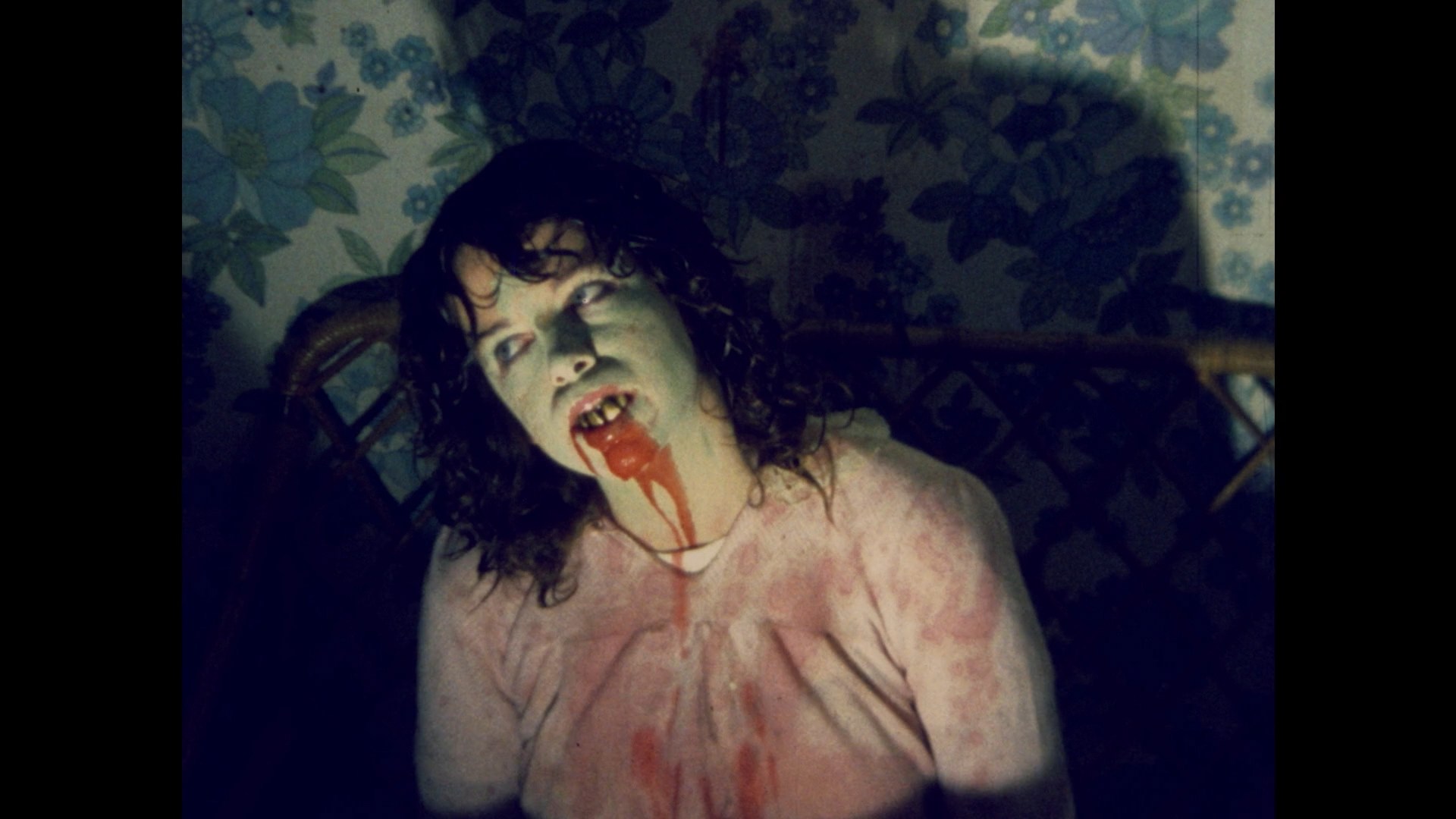 art from multiple films, and the archival featurette "The Doctor in Spite of Himself" (28m42s) from the Metaluna release, a great, frequently split-screen batch of colorful interviews with the filmmaker and his colleagues and family members sharing highlights from the whole crazy filmmaking trajectory. We keep going with another 1985 short, L'élue des enfers ("Hell's Chosen One," 36m1s), which opens with the credit "inspired by the William Friedkin film The Exorcist." That's sort of accurate but the perspective is very different here as we open up with a little toddler girl in the woods surrounded by hooded figures performing a thunder-augmented occult ceremony that will curse her on her 20th birthday to be possessed by Satan.