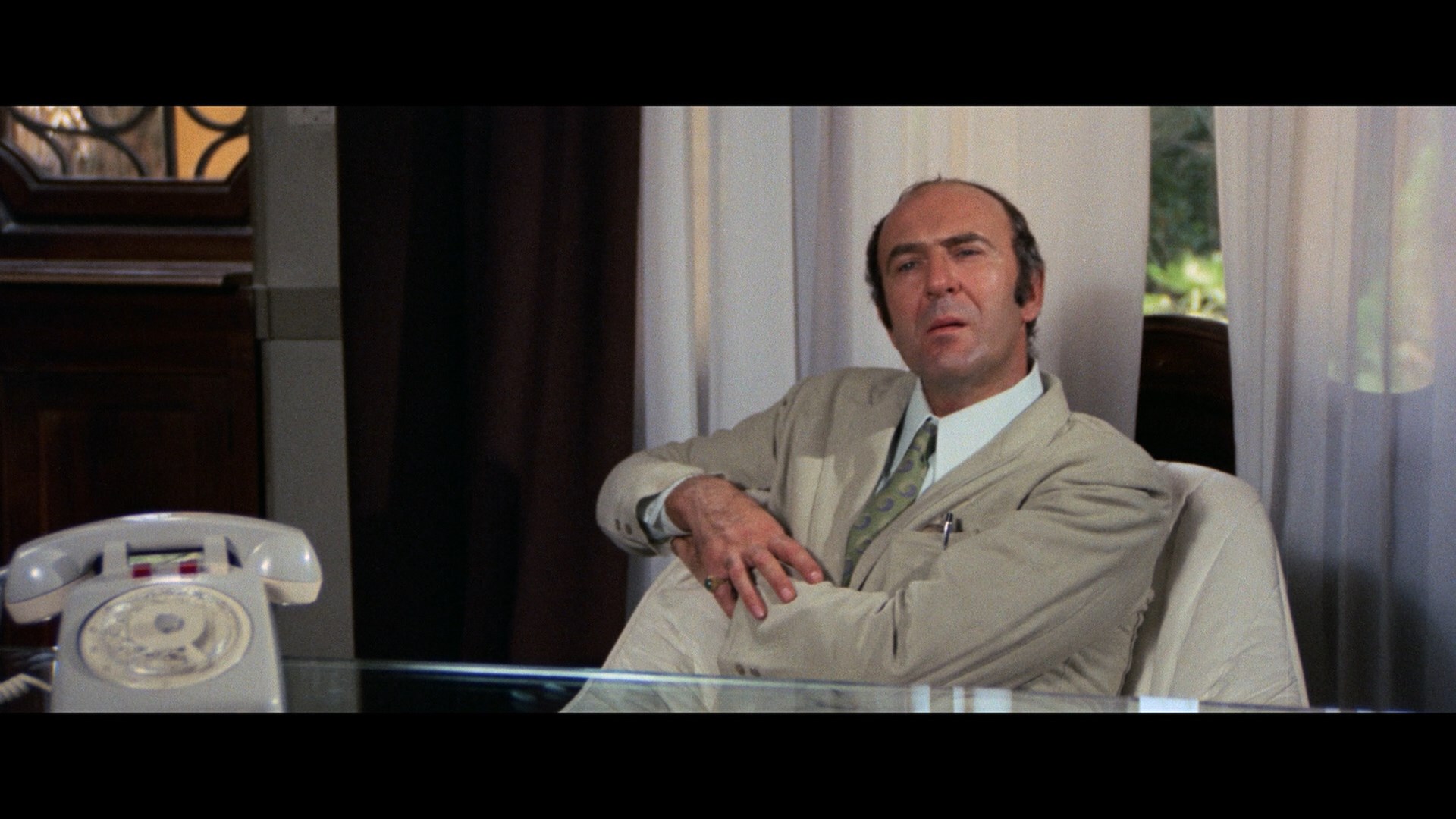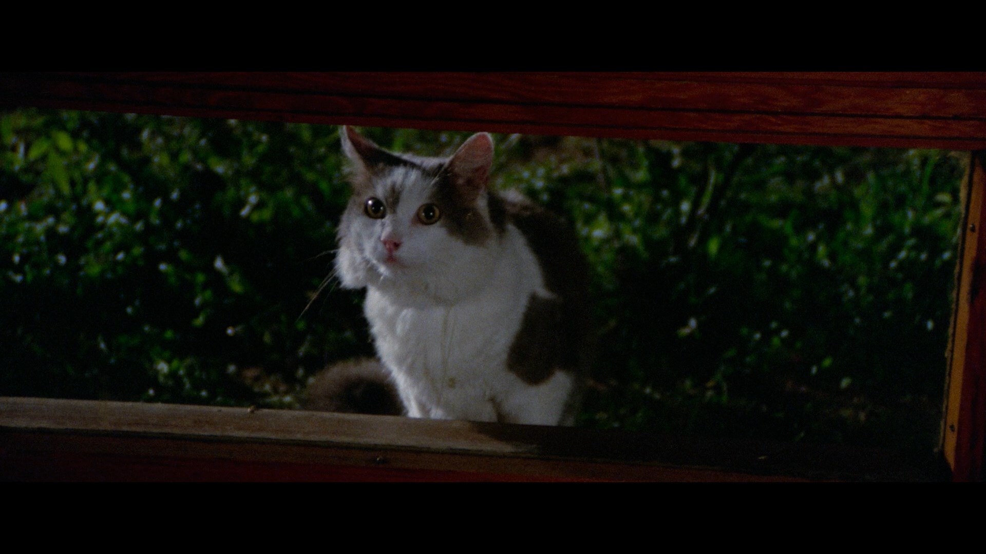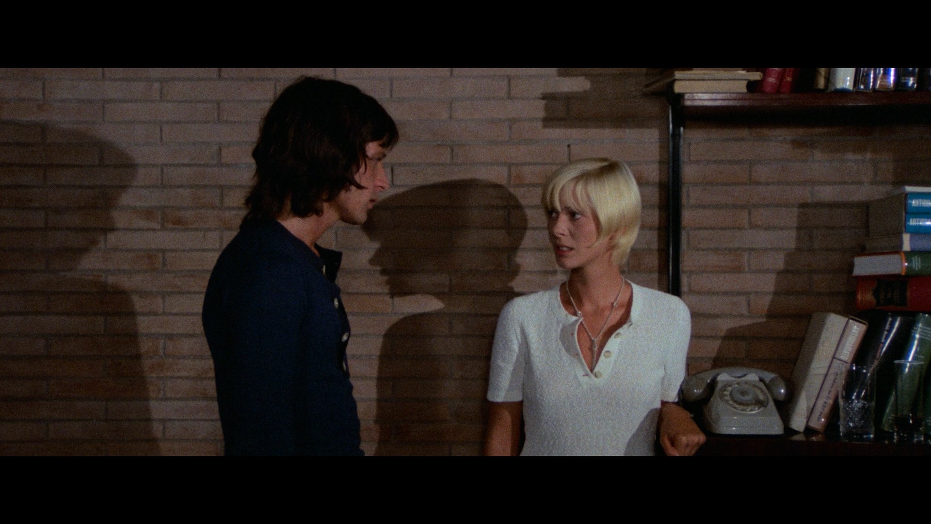DTS-HD MA 2.0 mono options with English SDH or English translated subtitles; of course, in its complete version the English track still reverts to subtitled Italian for the extra footage in the climax. The English track finally sounds excellent all the way through with no distortion issues. It's also worth noting that the opening and closing titles (plus the killer's notes) are taken from the negative material for the English-language version, so at long last you can see "You have been watching Four Flies on Grey Velvet" in pristine quality. The transfer itself looks staggering, with the UHD in particular glowing with the HDR bringing out some gorgeous colors like the deep blues of Brandon's shirts to the many gradations of darkness in the central house. Also the color timing has been corrected for the cemetery sequence, which now gradually goes from late afternoon to nightfall as intended. (See the third frame grab comparison below.) The UHD and first Blu-ray feature an audio commentary by Troy Howarth and yours truly on the director's cut (so no evaluation of that here) along with the Italian and U.S. theatrical trailers. The first Blu-ray also contains two featurettes: "Lord of the Flies" (28m12s), with Argento recalling the autobiographical elements of the project, its effect on his marriage at the time, his good rapport with Brandon, and his approach to the giallo at the time that he would briefly try to veer