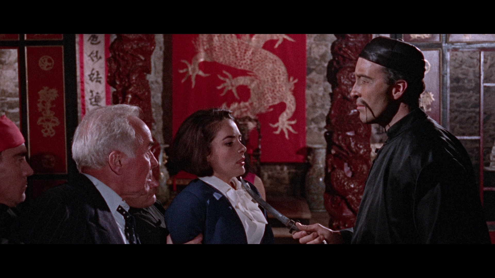 The Indicator edition is a real godsend, marking the film's global debut on Blu-ray and featuring an impressive 4K restoration from the original negative. You actually get two viewing options here, the standard theatrical framing throughout and, as discovered during the restoration process, a full aperture version of the third reel, which was damaged on the left side before the film's release and was zoomed in on all theatrical prints and prior video transfer to compensate. It's a nice option to have, and if you don't mind the The Face of Fu Manchuthin white scratches fluttering against the edge of the left side, it's nice to see the extra image info that had always been hidden before for such a significant chunk of the running time. The DTS-HD MA English 1.0 mono track also sounds excellent and comes with optional English SDH subtitles, a configuration repeated for the other four films in the box. An audio commentary with Stephen Jones and Kim Newman is a thorough study of the film and the series as a whole, covering Towers' globe-hopping approach to the cycle (for possibly shady reasons), the importance of Rohmer's literary influence, Lee's career around the time, and the luxurious approach to the production compared to many of its peers at the time. Two other audio options are "The BEHP Interview with Don Sharp - Part One" and "The BEHP Interview with Ernest Steward - Part One: The BIP Years," both of which run through the length of the feature and have the director and cinematographer speaking at great length about their personal histories and many of their key projects over the years. A short black-and-white archival interview with Lee (3m54s) recording during the shoot in Dublin (and featured on the local show Newsbeat) features him talking about his rise to horror stardom and his belief that he got villainous roles based on his performance in A Tale of Two Cities. A new video intro by BFI curator Vic Pratt (6m48s) is a good thumbnail guide to the film with context about the shooting locations, the major players behind the scenes, the increased kink factor that imperiled a variety of beautiful actresses, the very '60s visual elements that pop up despite the setting, and the star's desire to add a major literary name to his roster of roles even within the confines of his makeup. In "Underneath the Skin" (48m32s), Christopher Frayling takes a deep dive into Rohmer proper with an analysis of the literary canon, the author himself (including the origins of his pen name), the evolving social attitudes that sometimes ran counter to the book series particularly with regards to British imperialism and attitudes about Chinese culture and immigrants. Also included are three alternate title sequences (American, French, and Spanish), a two-part, black-and-white Super 8 version (16m8s) with sound expertly added back from surviving vinyl copies, three trailers (British, German, and textless French), and an extensive 98-image gallery of stills and promotional ephemera.