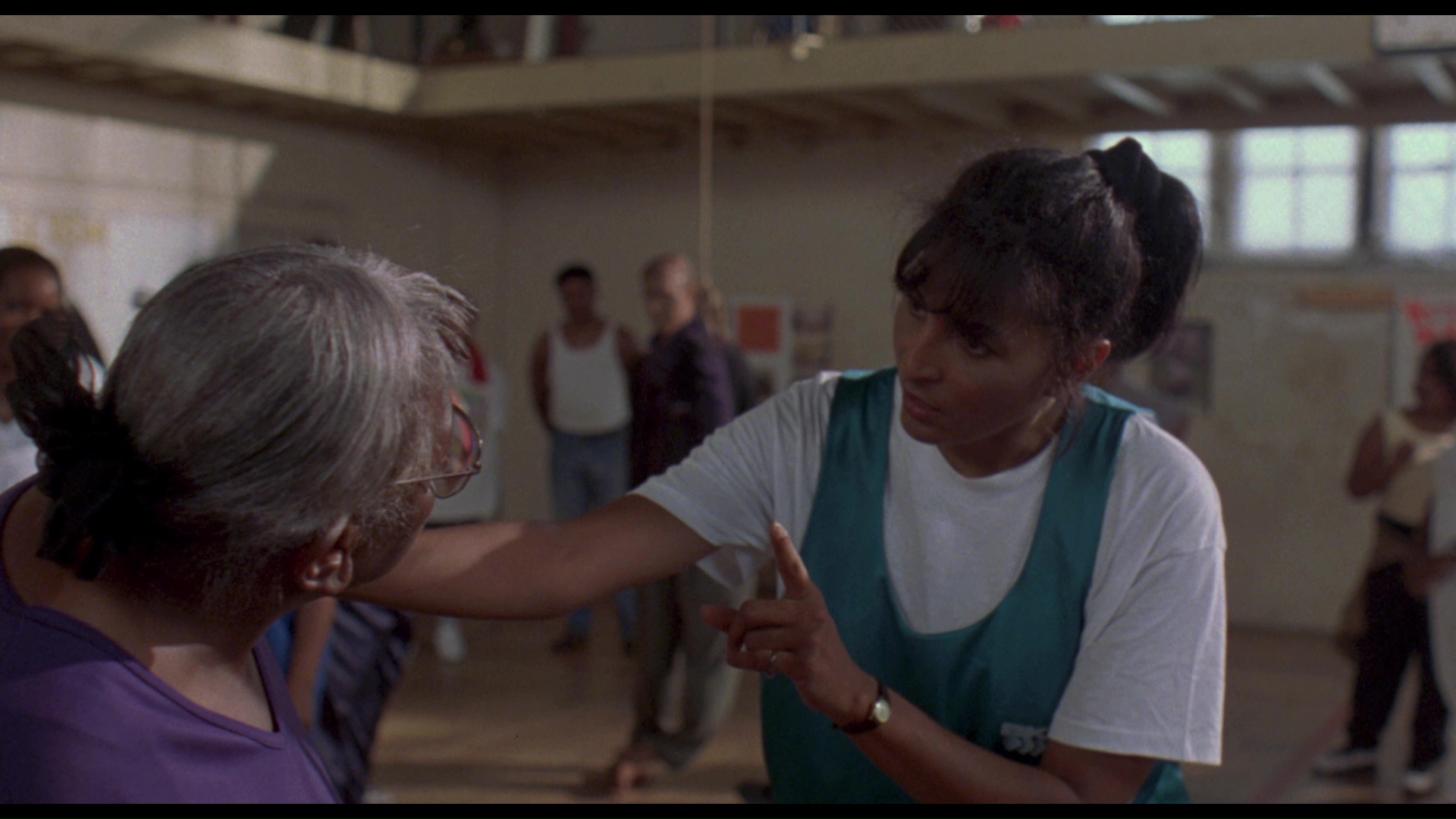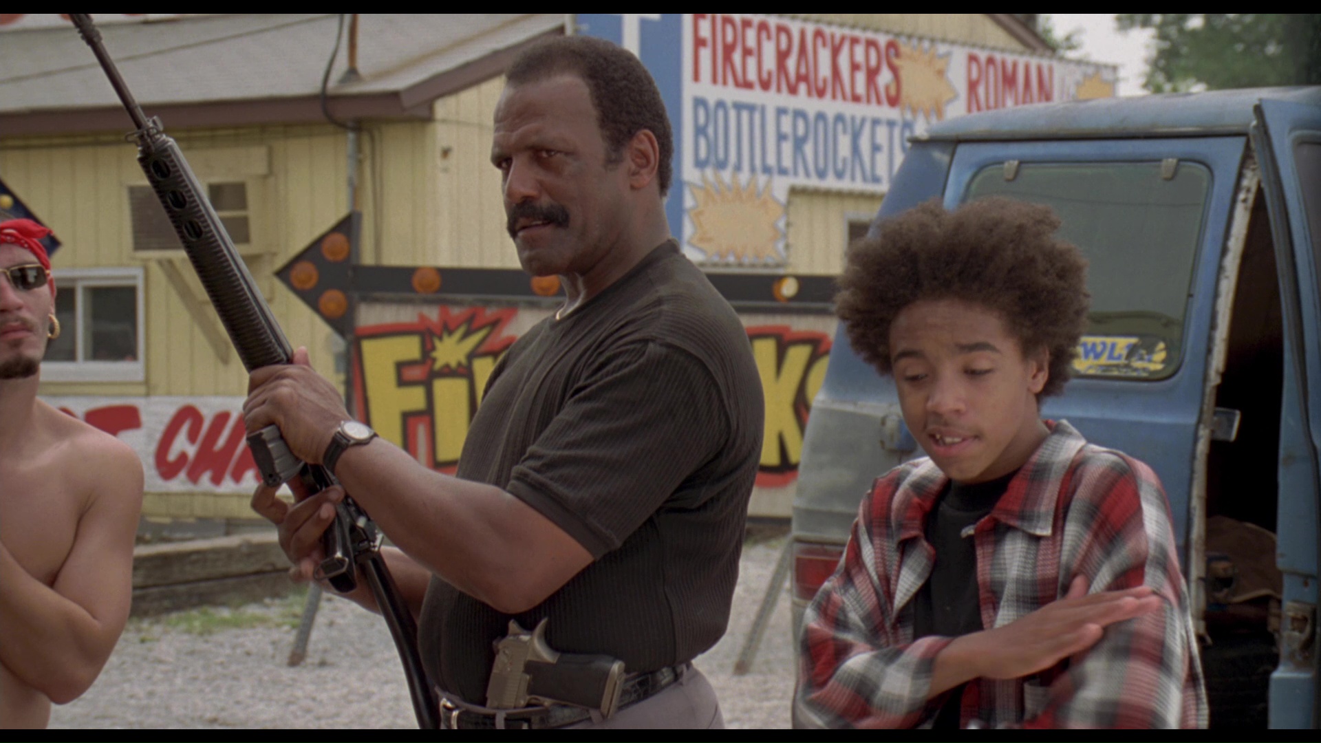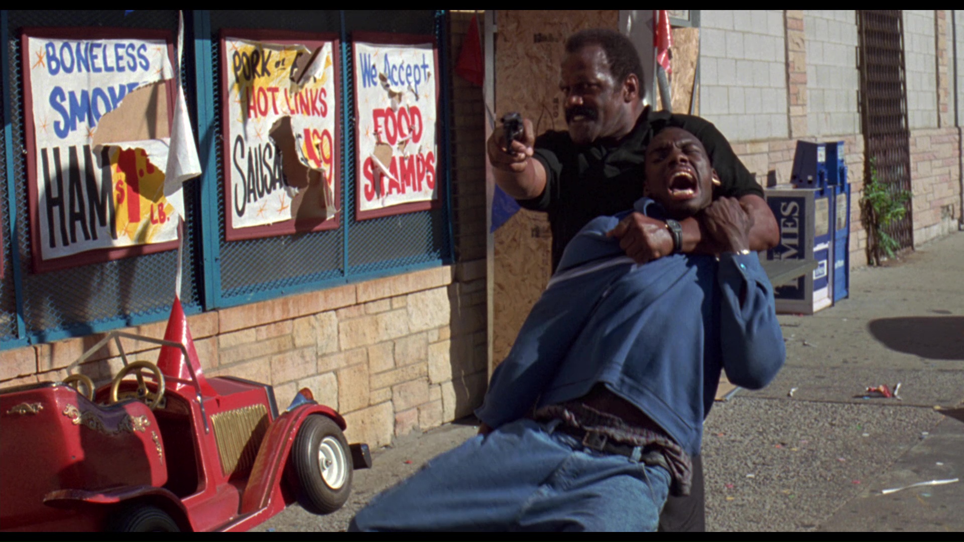 still lived at the time), a town where a dead steel industry has left a skyrocketing murder rate and a frightened populace. When his elderly grocery store owner dad gets nearly beaten to death after witnessing a drive-by shooting, pro footballer John Bookman (Williamson) comes back home and puts out a public cry for a crackdown on all the street violence. The authorities don't seem interesting in complying, however, and after an afternoon altercation at the store involving John teaming up with the shooting victim's father, Jake (Brown), against two young punks, it becomes clear this will have to be a neighborhood project. Soon Laurie (Grier), mother of the deceased, joins in and provides crash course lessons in self-defense and disarming a criminal, which leads to more old buddies coming together to take back the city.