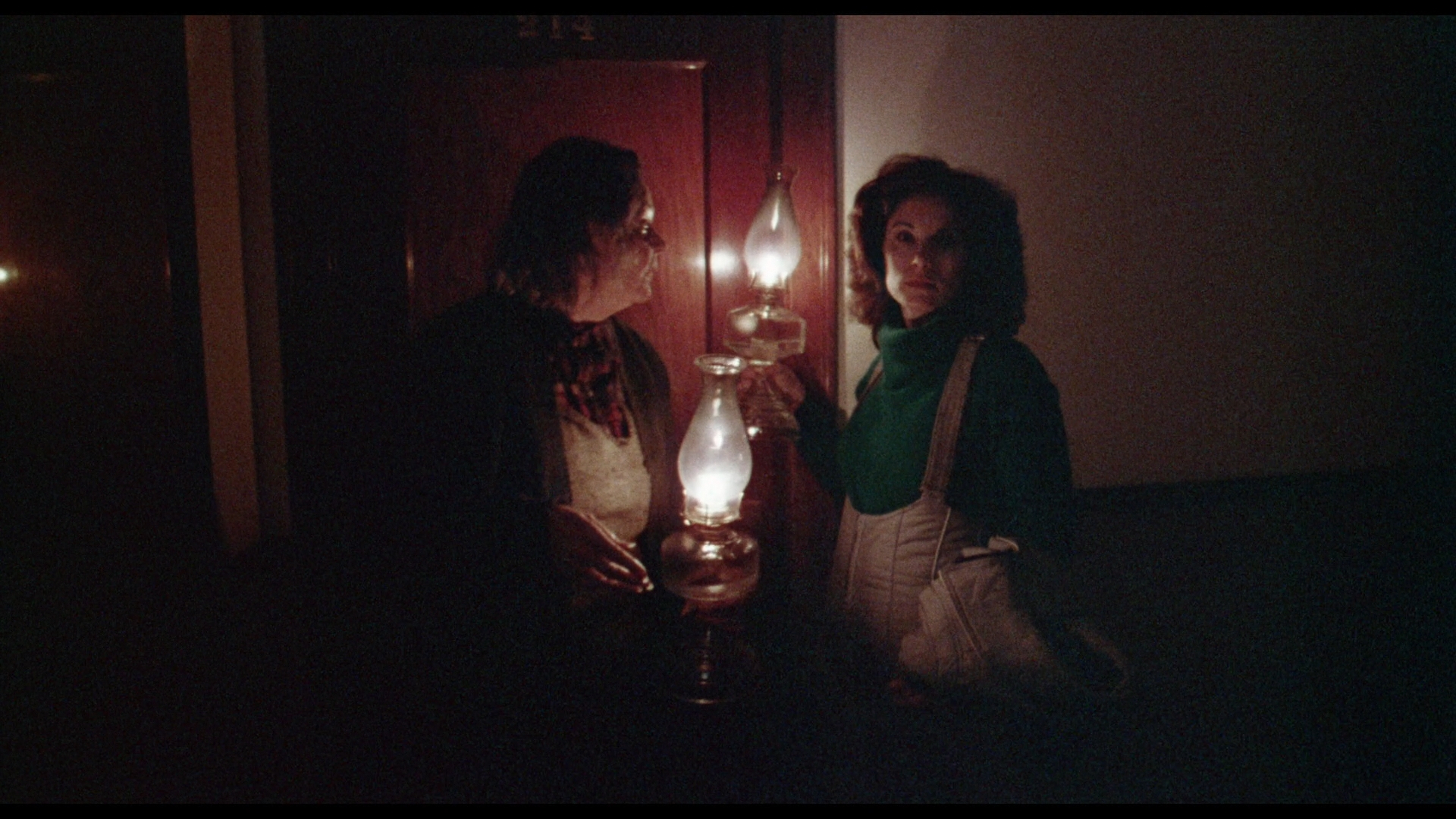 After some opening text about the "Windigo [sic]... a ghost who lives on human flesh" (which doesn't really play out as you'd expect here), we meet our three potential victims-to-be: Jenny (Rabid's Spier), her boyfriend Marty (Ord), and boy-crazy friend Chrissy (McFadden), all of whom get stuck in the countryside when their snowmobile conks out. After some wandering they end up at the Deer Lodge, a closed hotel seemingly inhabited only by a creepy old woman (Collins). However, she's got a nasty surprise or two hidden away waiting to come out at night, and when they aren't busy exploring through the shadows with oil lamps, the visitors are soon fighting for their lives.