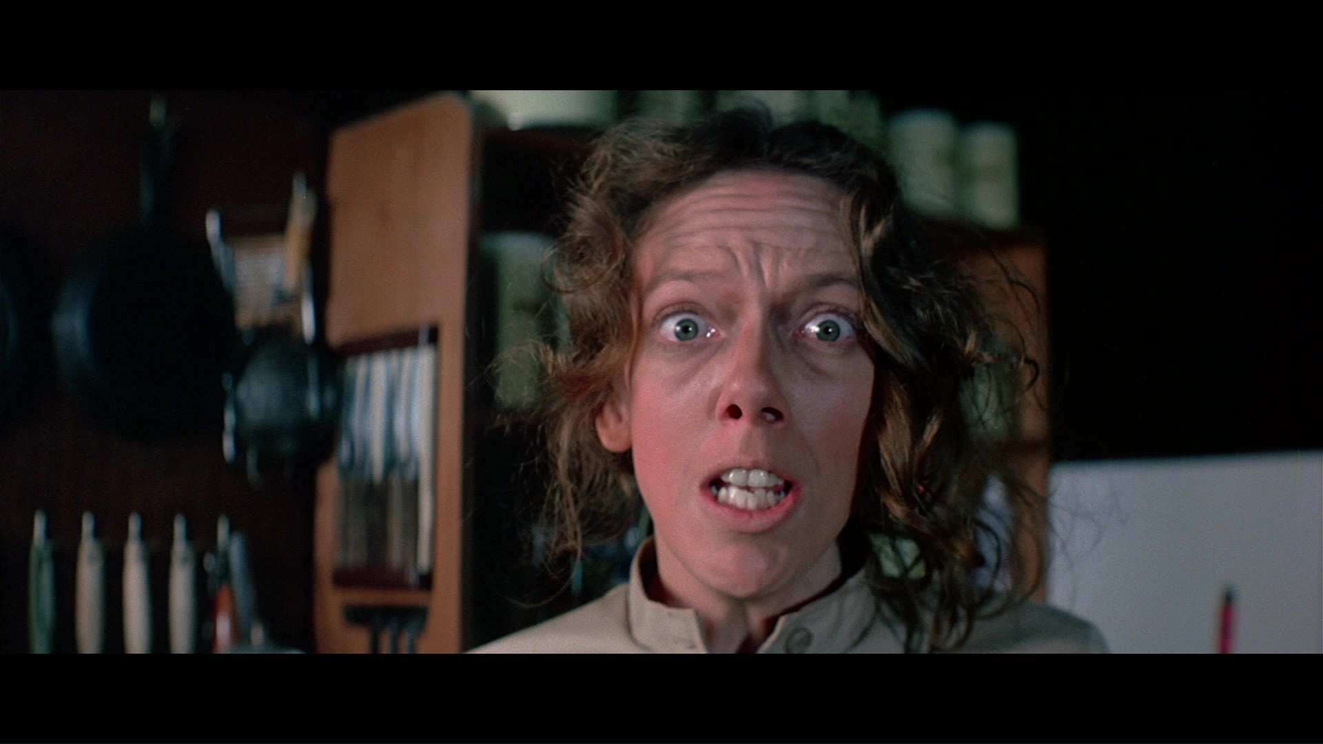 Nine years later, Scorpion Releasing issued the film on Blu-ray as an exclusive, limited 3,000-unit edition via Screen Archives (though a DVD reissue for the general public is also available through them via Kino Lorber). As with their edition of Spasmo, the Blu-ray features both a raw HD scan (with plentiful grain, some fluctuations in a handful of darker scenes, and a pretty gritty, harsh overall veneer) and a "filtered" option softening out the grain, though it doesn't go into extreme waxy territory either. Your mileage may vary so try 'em both, but also be advised that the film was also shot with an odd visual approach in some shots with large areas of the frame going out of focus or, in the case of a handful of medium shots, losing focus a bit altogether (such as the first afternoon scene in the park office). The English audio can be played with a DTS-HD MA 5.1 mix or an alternate music and effects track. The only extra ported over from the prior release is the "Jaws with Claws" featurette, while the rest of the bonus material consists of the (real) theatrical trailer, a lively "Katarina's Fun Facts" segment with hostess Katarina Leigh Waters fending off a big teddy bear and sharing facts about the cast and crew, and a 12-minute Q&A at the New Beverly in Los Angeles with Prine and Sheldon swapping stories about shooting their beloved fur fest.