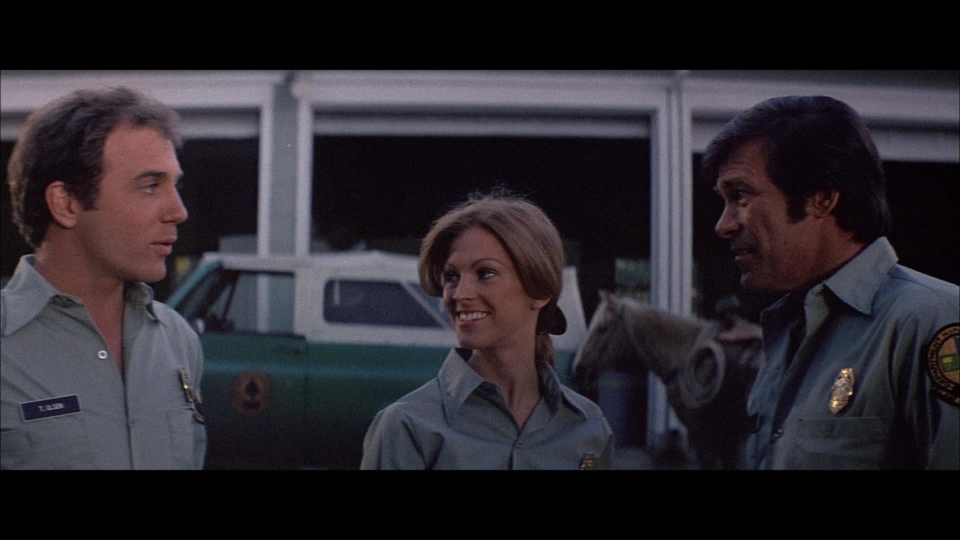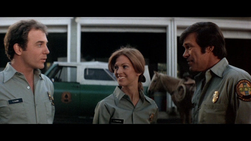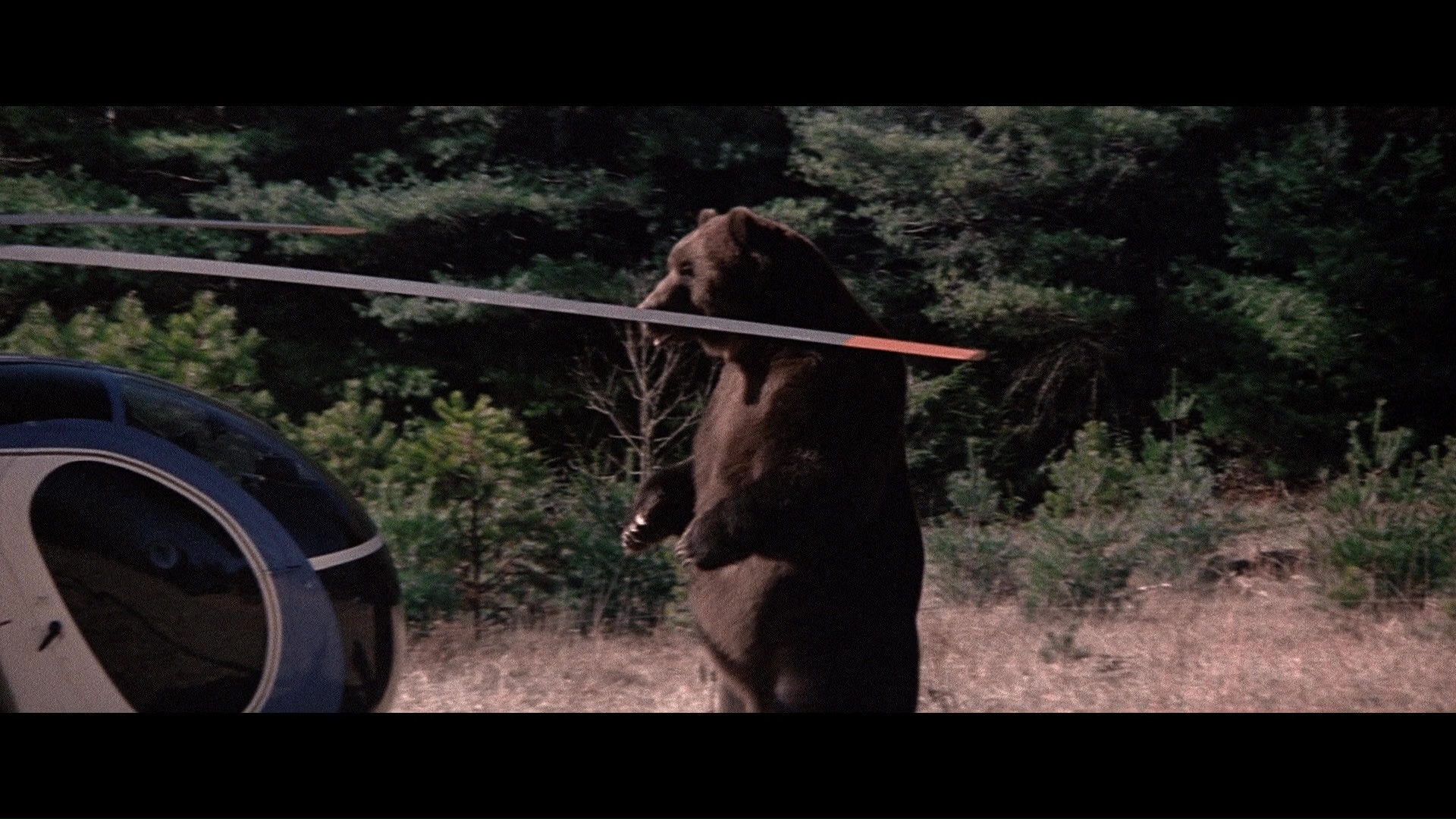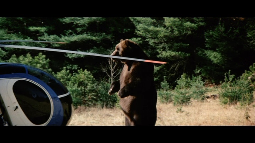 Later the same year, Scorpion brought the screen's favorite rampaging bear back to the Blu-ray with a remastered edition featuring a new scan from the interpositive. As you'd hope, it marks for a substantial upgrade with a more natural presentation of film grain, fresher colors, and a very substantial amount of additional image info visible on the edges during the second and third reels in particular a la the old DVD. (Images in the body of this review are from the 2018 Scorpion release; comparison ones can be found below.) Audio options include the standard 2.0 stereo track, a spacious and surprisingly boisterous 5.1 mix (both DTS-HD MA), and a mono music and effects track (Dolby Digital). English SDH subtitles are also provided. Almost everything from past U.S. releases is finally collected here together in one place: the Sheldon/McCall commentary, "Jaws with Claws," vintage making-of, the New Beverly panel, still gallery, and Katarina "fun facts." One major new bonus here is a very lively and informative audio commentary by Lee Gambin, whose peerless expertise in the animal attack subgenre is in full bloom here as he tackles one of the decade's most essential entries. He touches on Edward L. Montoro (the infamous head of distributor Film Ventures International), other killer bear films like Claws, other potential casting choices like Clint Walker, the joys of animal suits (making this a commentary sequel of sorts to Night of the Lepus), the unreleased sequel, the Jaws influence, and the sweeping score by Robert O. Ragland, just for starters. Two theatrical trailers are also included along with a sampling of radio spots, and the first pressing sold via Ronin Flix and Diabolik features a limited slipcover.