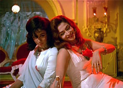 which looks like an outtake from Black Tight Killers and popped up most memorably during the opening credits of Ghost World. However, points for sheer spectacle go to the butler's lavish dance fantasy, a visual orgy of Bava-style colors and twirling showgirls that must be witnessed to be believed. Speaking of Bava, most of the violence occurs offscreen a la Five Dolls for an August Moon apart from one surprisingly brutal hanging; thus the interjections of music and humor aren't quite as jarring as they would be in a bona fide slasher film.