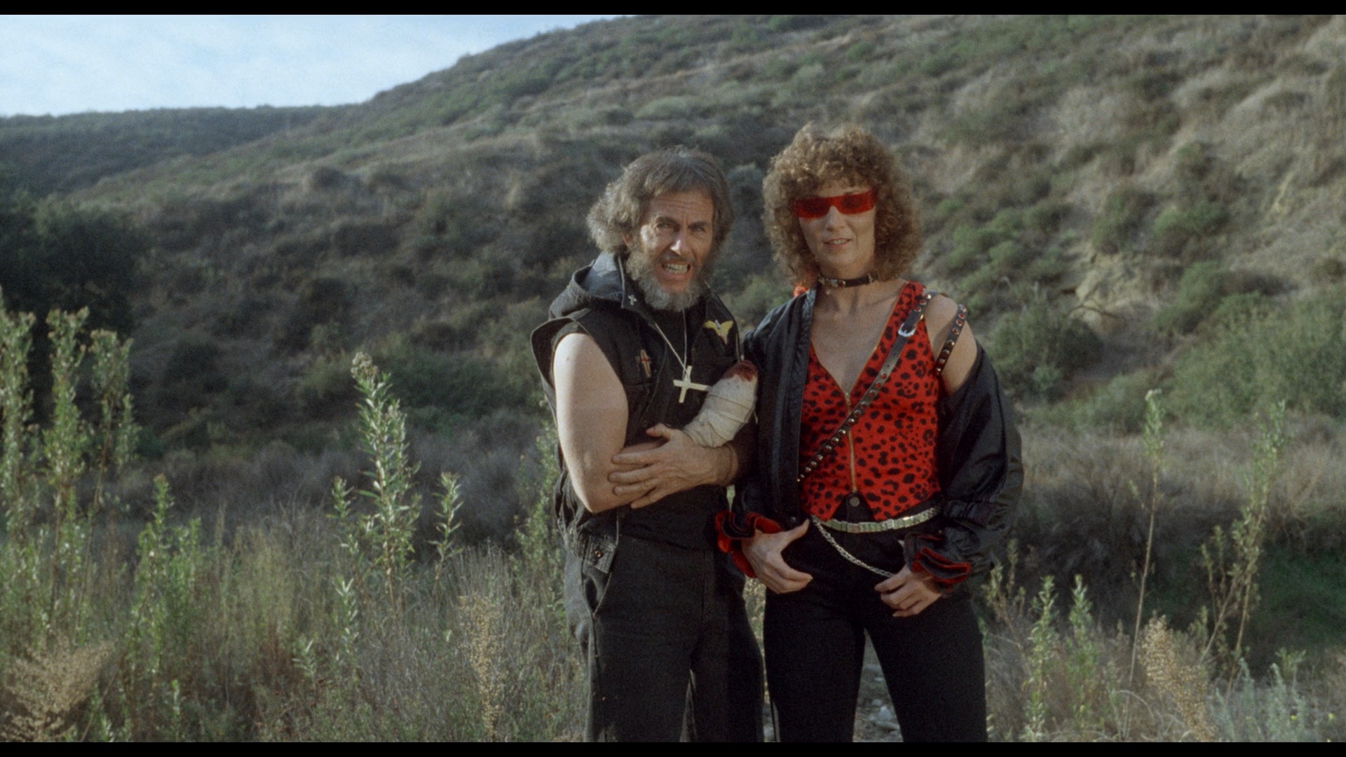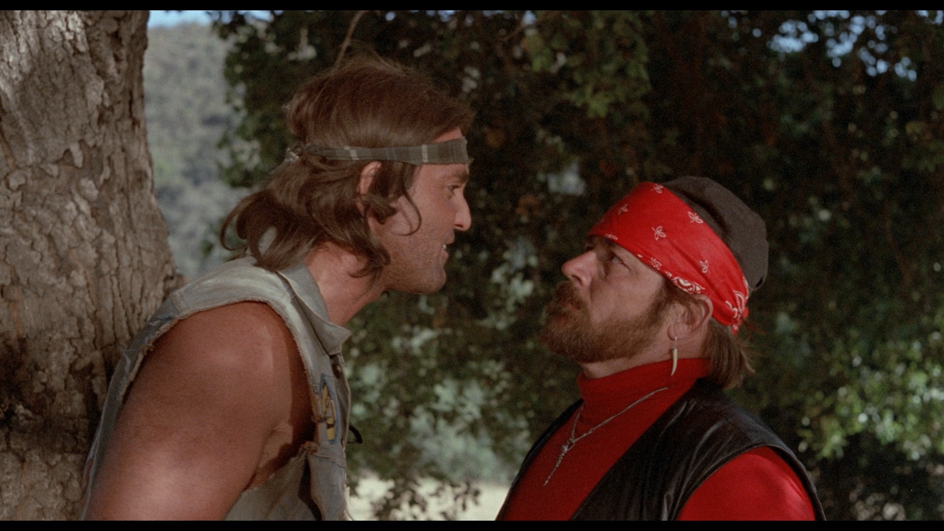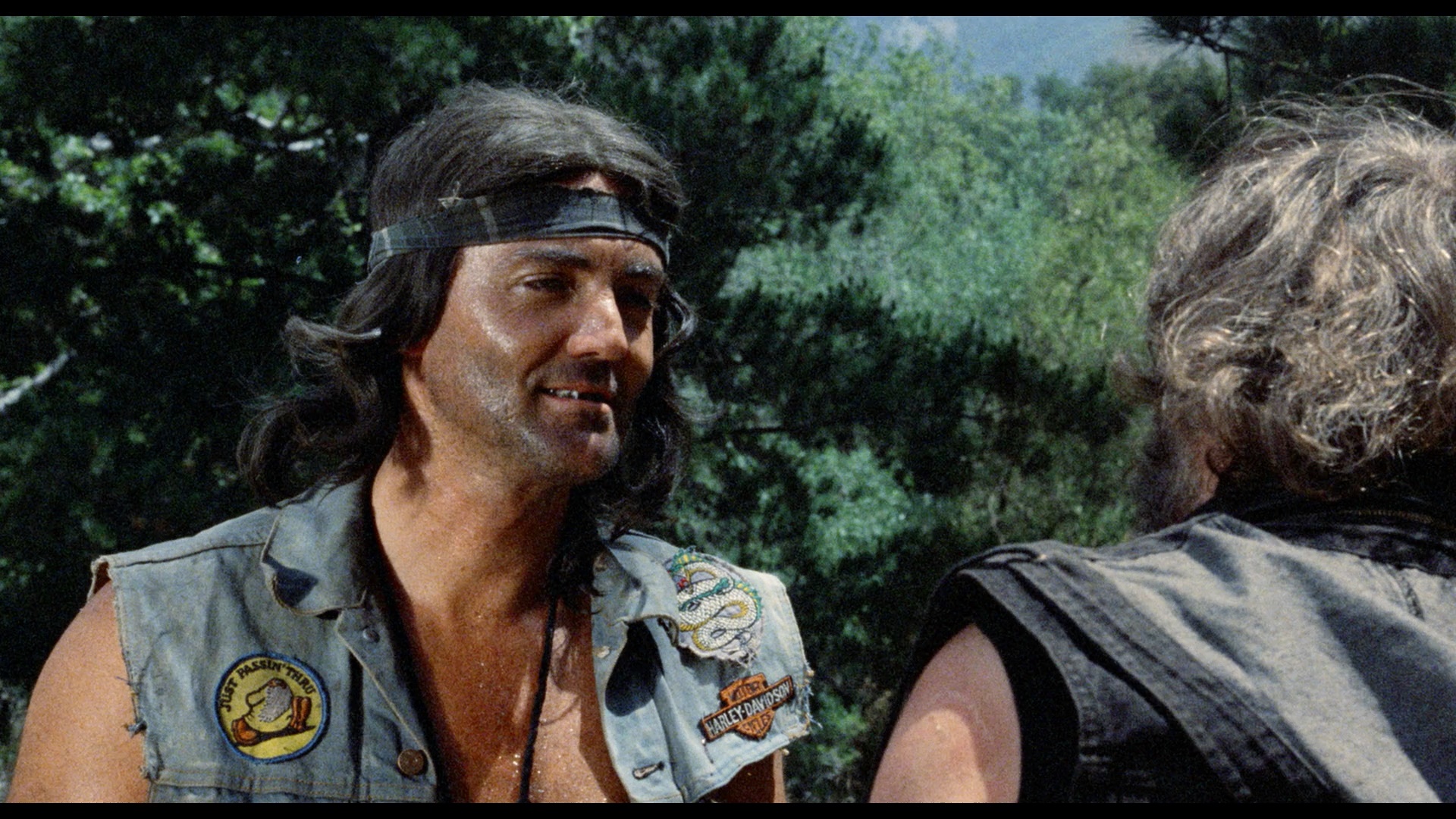 Barely released on VHS in the '80s, Hell Riders made its disc bow in 2020 as part of the Vinegar Syndrome Archive Blu-ray line, only available via the company site and select retailers in a limited 3,000-unit run (complete with a double-sided poster and reversible cover art). The new 2K scan from the 35mm original camera negative looks excellent with gorgeous colors and excellent detail from the foliage to the shag carpeting inside one character's van. The DTS-HD MA English 2.0 mono audio is fine with no significant issues, and the optional English SDH subtitles have some really odd transcriptions at times. ("Queen B?") In addition to a storyboard gallery you get a fun video interview with Bryan, "Straight to Hell" (15m16s), who chats about how some of the rent-a-gang amateur actors were recruited, the less than cooperative attitude of his time-obsessed leading lady (as opposed to the "jolly" West), his enjoyable collaborative process with Harmon, and Harmon's ingenious location scouting that nevertheless required some crafty sound recording to catch all the dialogue.
