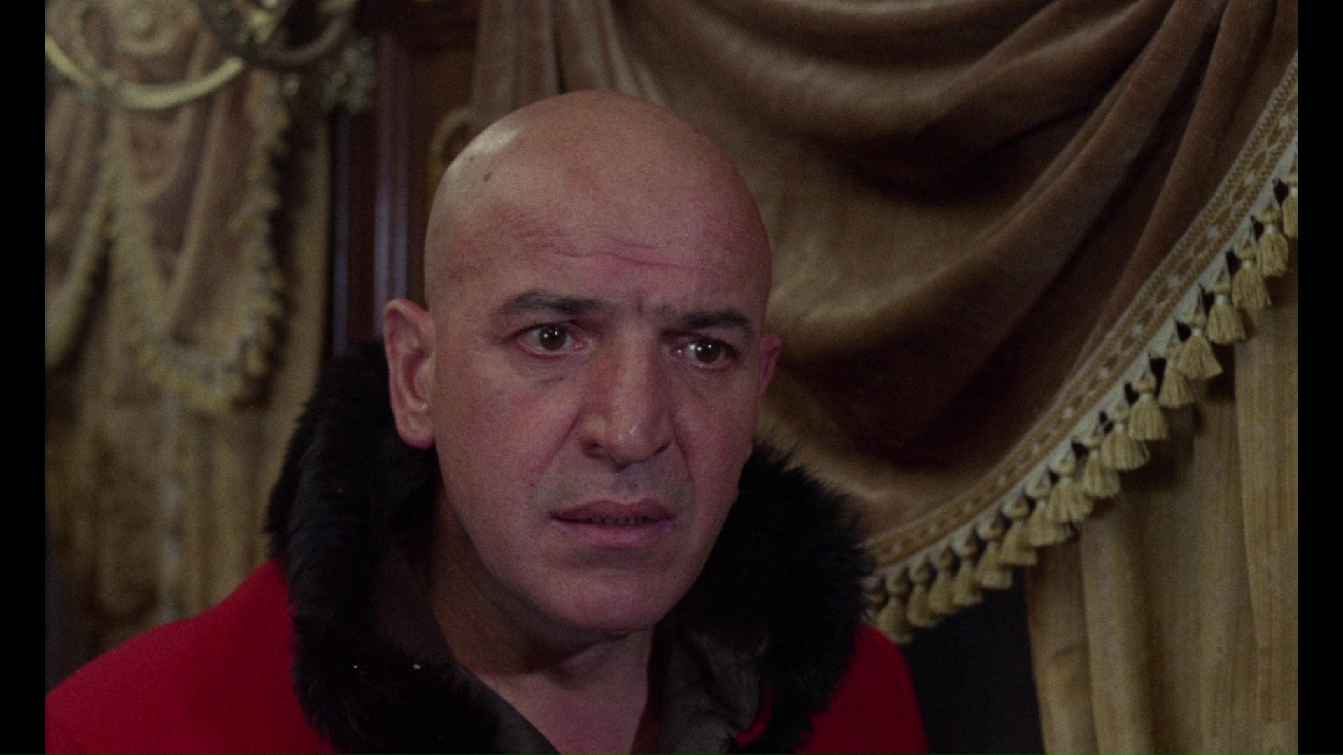 Chris Alexander (6m50s), followed by a new HD video interview with Martin, "Murder on the Trans-Siberian Express" (13m59s), in which he talks about the genesis of the idea for the film, his methods of creating a lush visual texture on a limited budget, and a correction to the oft-repeated story about how Cushing (whose wife had just died before filming) was enlisted to remain for the film by his friend Lee. His accent is pretty thick at times, so turn your volume up. The lengthy and very detailed next interview, "Notes from the Blacklist" (30m30s), features the late producer Bernard Gordon, who goes through the process of blacklisting in the '50s, the making of 55 Days at Peking (which he wrote), and much more. "Telly and Me" (8m4s) is a fun video interview with Cacavas, who got his big break as a film composer through Savalas, arranged two of his albums (including an inexplicably popular spoken version of "If"), and went on to become the regular composer for the TV series Kojak. He also speaks warmly of his score for this film and the positive reception it received from everyone involved. Cacavas passed away three years after this was recorded, so it's a poignant preservation of his thoughts on his career definitely worth seeing. The disc rounds out with the original English-language theatrical trailer and bonus trailers for Psychomania, The House that Dripped Blood, and Nightmare Castle. Subsequent 2017 Blu-rays from Japan (very pricey and difficult to obtain) and Germany worked off the same master with a more proficient compression job; the latter also features the German Super 8 version (15m32s), the German trailer, and a bonus trailer for Thirst.