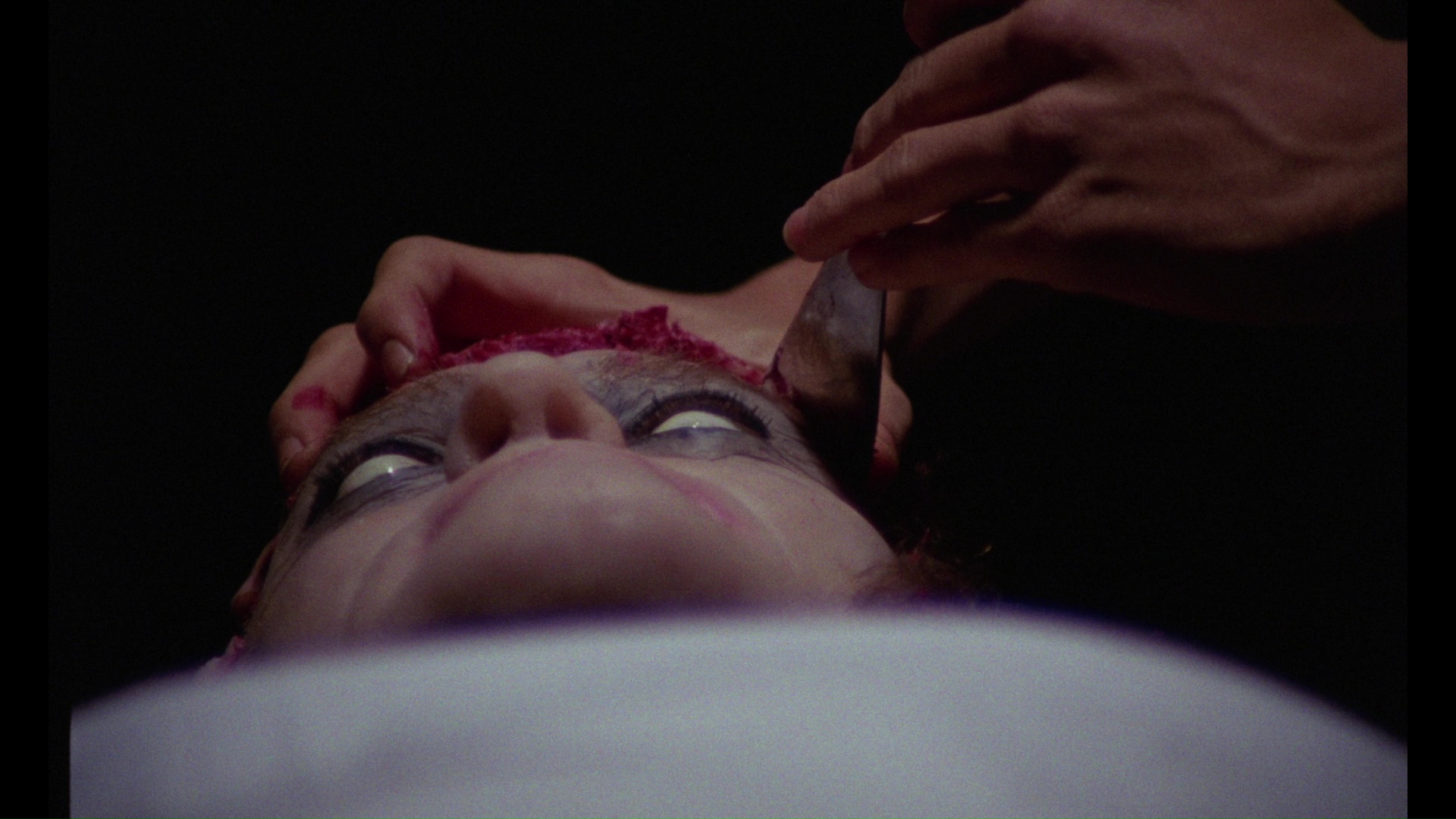 widely-seen US cut. All of the gore is intact here including all the cranial sawing and eyeball puncturing, a likely attempt to compete with the increasingly graphic Hammer films of the period. Audio options in lossy Dolby Digital include the English and Spanish tracks (the latter listed as stereo, but it sounds pretty mono until the end credits) as well as an 80-minute 1973 Peter Cushing interview with an audience in which he discusses his acting career in great detail. Topics include working with Terrence Fisher, his friendship with Christopher Lee, and an odd detour into the making of I, Monster. Video extras begin with a B&W video intro by Fangoria editor