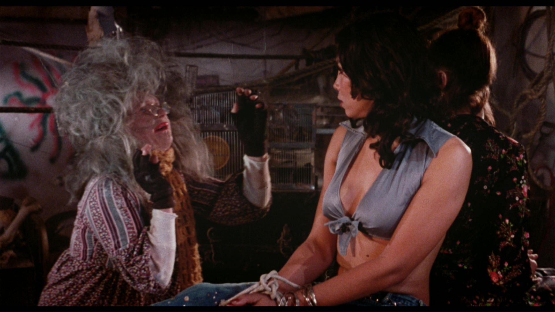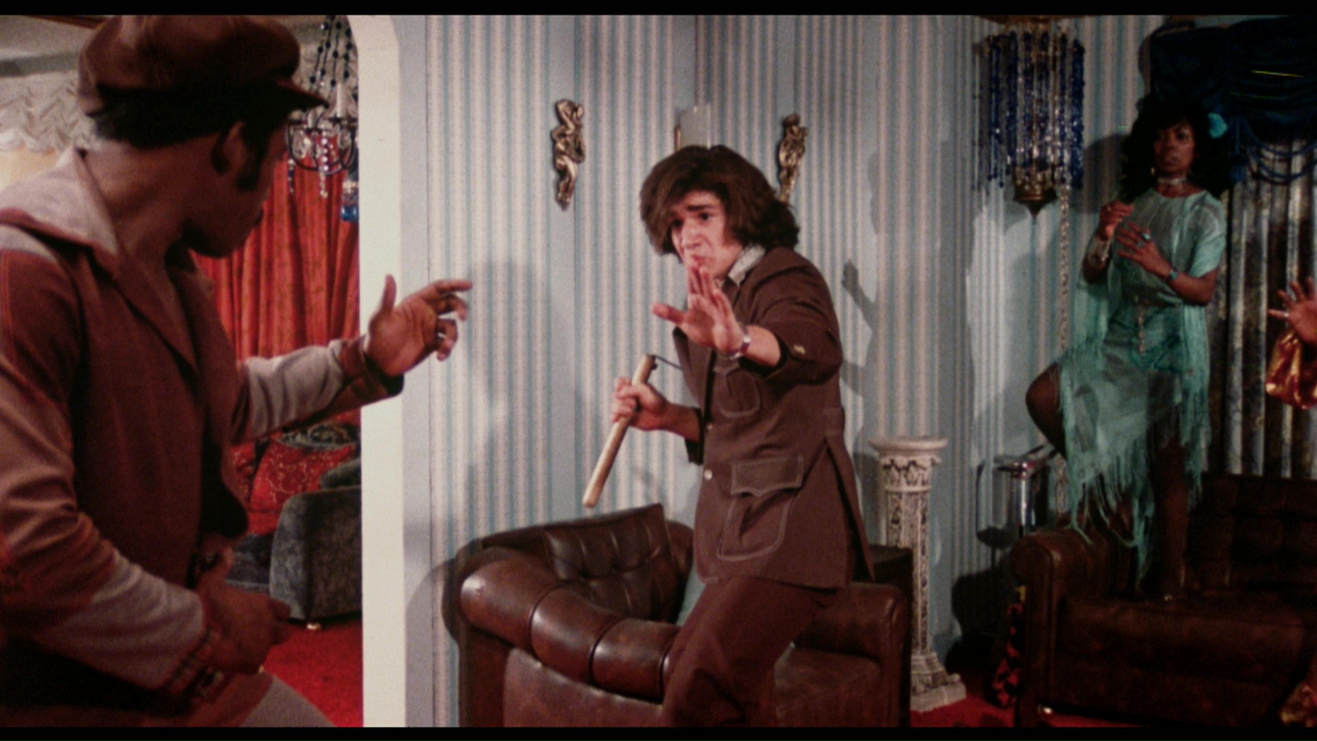 Fortunately the longest and most correctly sequenced version of the film can be seen on Vinegar Syndrome's dual-format Blu-ray and DVD edition in 2016, and as with Dolemite, this marks the first fresh transfer it's had in ages. Despite the super low production values, the film looks very punchy with a vibrant '70s palette (just check out the colors of the walls) and some heavy, stylized red lighting in several scenes. The actual "35mm vault materials" here are in somewhat rougher shape at times than the first film, with at least one bumpy reel change and some significant debris during the climax; however, it's such a massive improvement over anything we've had before that it's unlikely anyone will mind. The DTS-HD MA mono audio on the Blu-ray sounds pretty energetic, with the funky main titles (featuring some charming hand-drawn lettering) really kicking things off in style. Optional English subtitles are also provided.