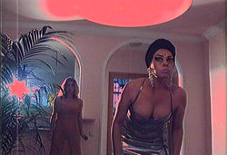 While lounging topless on the Spanish coast, Rachel (Rachel Sheppard) catches the eye of seductive Countess Irina (Analía Ivars), a vampire prone to hugging trees, dancing behind huge glass bottles, and fondling herself through pink boas. Tormented by dreams of the devilish countess, Rachel is further puzzled when she sees the woman's likeness on a T-shirt peddled by a souvenir salesman (played by Franco, of course). She then takes in a nightclub show where the main attraction, psychic gypsy Magda (Linda Romay, who stays mostly clothed for once) proclaims, "Yew arrrre from New Errrk, New Jeerrsey!" Rachel, her slip-sliding accent notwithstanding, naturally replies, "If you mean Newark, New Jersey, yes." Magda then reveals she knows all about Rachel's visions and has even visited the girl herself in dreams. Furthermore, she knows how to stop the bloodsucker, thanks to the most unorthodox vampire "staking" in movie history.