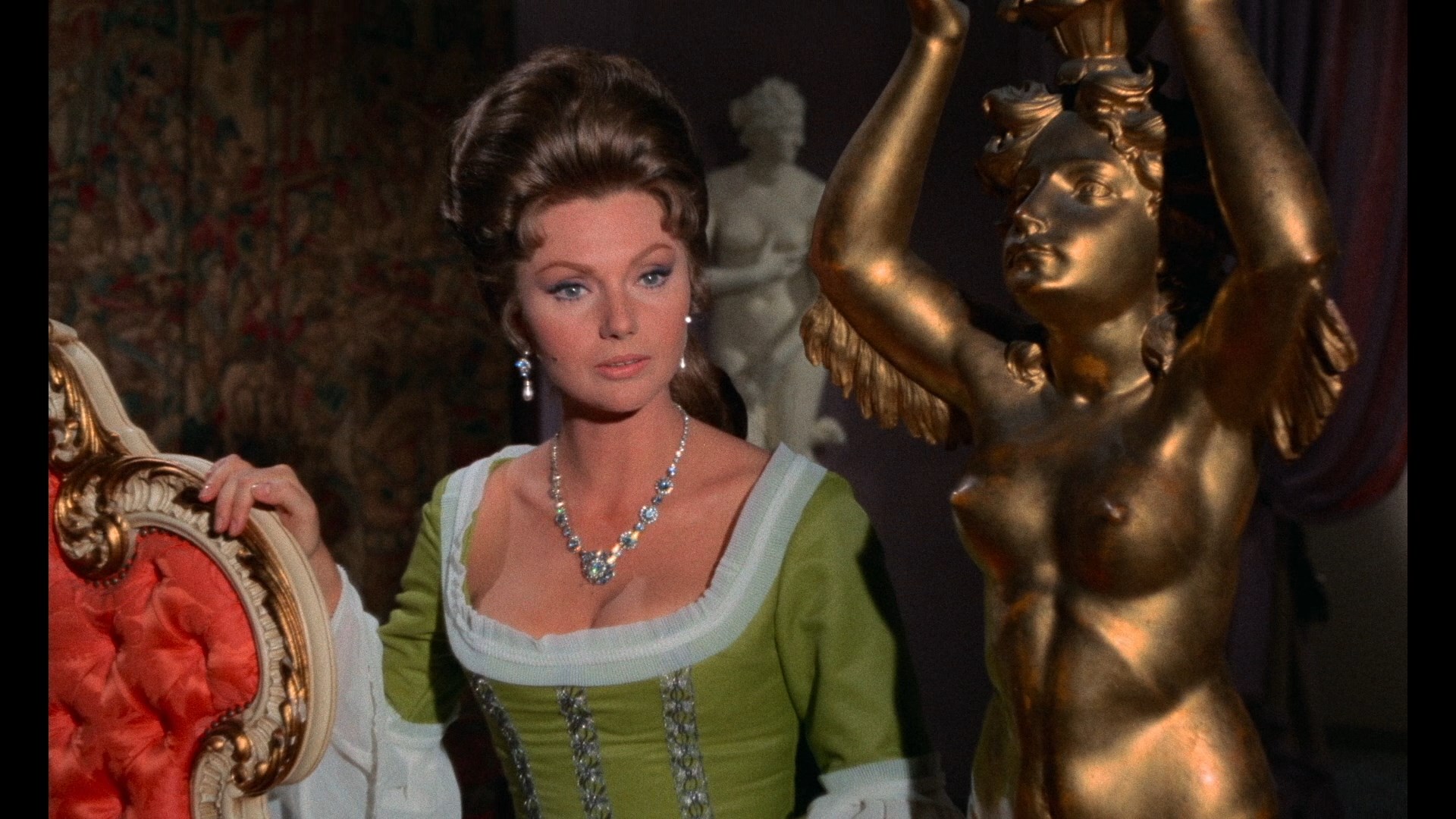 In 2023, Blue Underground paid Justine another visit as a two-set set featuring a UHD and a remastered Blu-ray taken from a new 4K remaster from the original negative. The improvements are apparent right out of the gate (especially with the incredibly rich look of the UHD thanks to the HDR grading) as flesh tones look healthier, the stylized green and red lighting pops more than before, and the film grain is more organic and tightly resolved. The English DTS-HD MA 1.0 mono audio track is in great shape and comes with optional English SDH or French subtitles. Both the UHD and Blu-ray feature the French trailer as well as a new commentary by Troy Howarth and yours truly, which can't be appraised here. Both prior featurettes are carried over here on the Blu-ray, plus an expanded gallery of international posters and stills. New here is the 8m17s "On Set with Jess" featuring Rosalba Neri looking back fondly at her time with Franco, including anecdotes from this and 99 Women with particular thoughts on co-stars like Power, Palance, and Luciana Paluzzi. In a very welcome touch, they've also included an HD reconstruction of the 95-minute Deadly Sanctuary cut. It's fun to revisit this variant as it moves quite a bit faster, retaining the more sordid bits but getting our poor heroine through her kinky obstacles a lot more speedily in a way more appealing to exploitation audiences of the day.