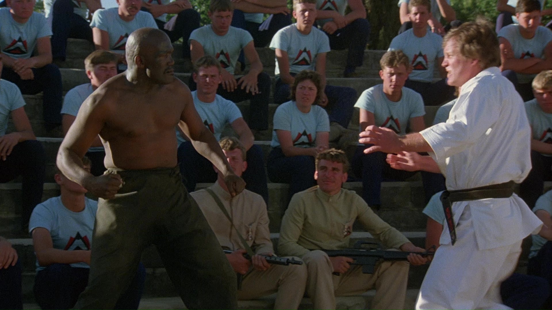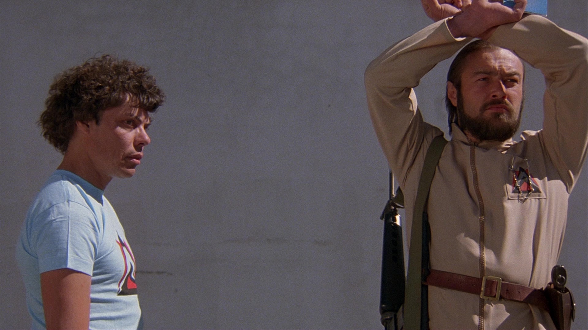 than anyone's seen it outside of a movie theater. The colors are now back to their original early '80s intensity, the film elements are in great shape, and there's really nothing to complain about at all unless you have an aversion to phony facial hair. The mono audio sounds nice and clean as well, and there's even an isolated music track for good measure. As for extras, first up you get a 42-minute phone interview with Ryan (which plays commentary-style with the feature) in which he speaks with his natural South African accent about working on both films, his relationships with Kriel and Kantor, the ins and outs of shooting in his country, and the challenges of intensely physical action sequences. Then the aforementioned Crowther appears for an on-camera interview (23m45s) in which he chats about pitching the film, the WGA's objection to his screen credit, and some of his other films like The Evil that Men Do. Two favorite sound bites: "Nobody really wants character development" and "Go look for subtext... it's a parable for everything that's wrong with the world today, especially vicious dictators." Finally the disc closes out with the original trailer and bonus ones for Puppet on a Chain, The Last Grenade, Joysticks, Death Ship, Mortuary, and Malibu High. In 2017, Scorpion gave the film its inevitable Blu-ray upgrade, with a fresh scan that looks even better with extremely sharp detail and fresh colors; the DTS-HD MA English mono track also sounds clean and clear. The audio interview, featurette, trailer, and isolated music track are carried over here, along with bonus trailers for Force: Five, The Salamander, Barbarosa, and Firepower.SCORPION RELEASING BLU-RAY