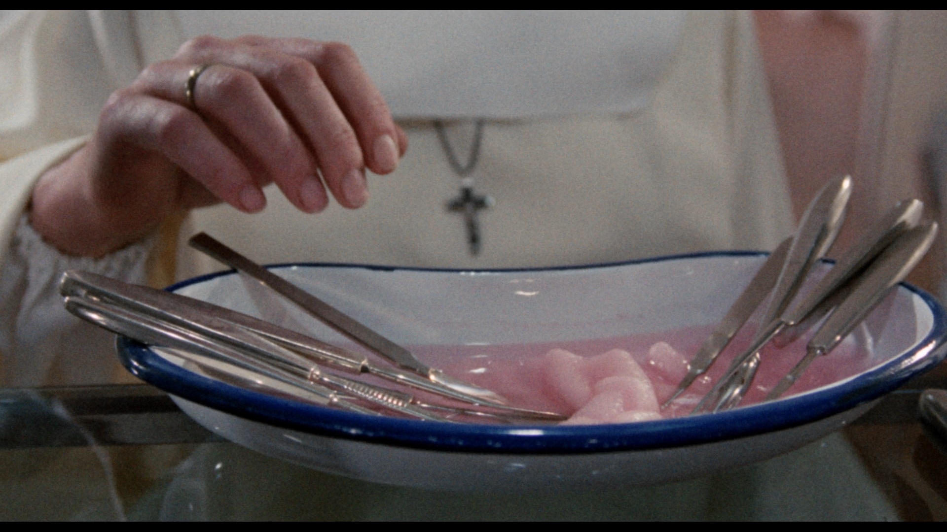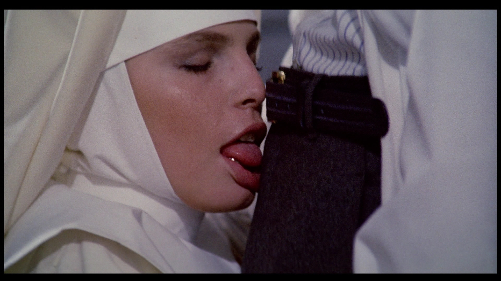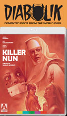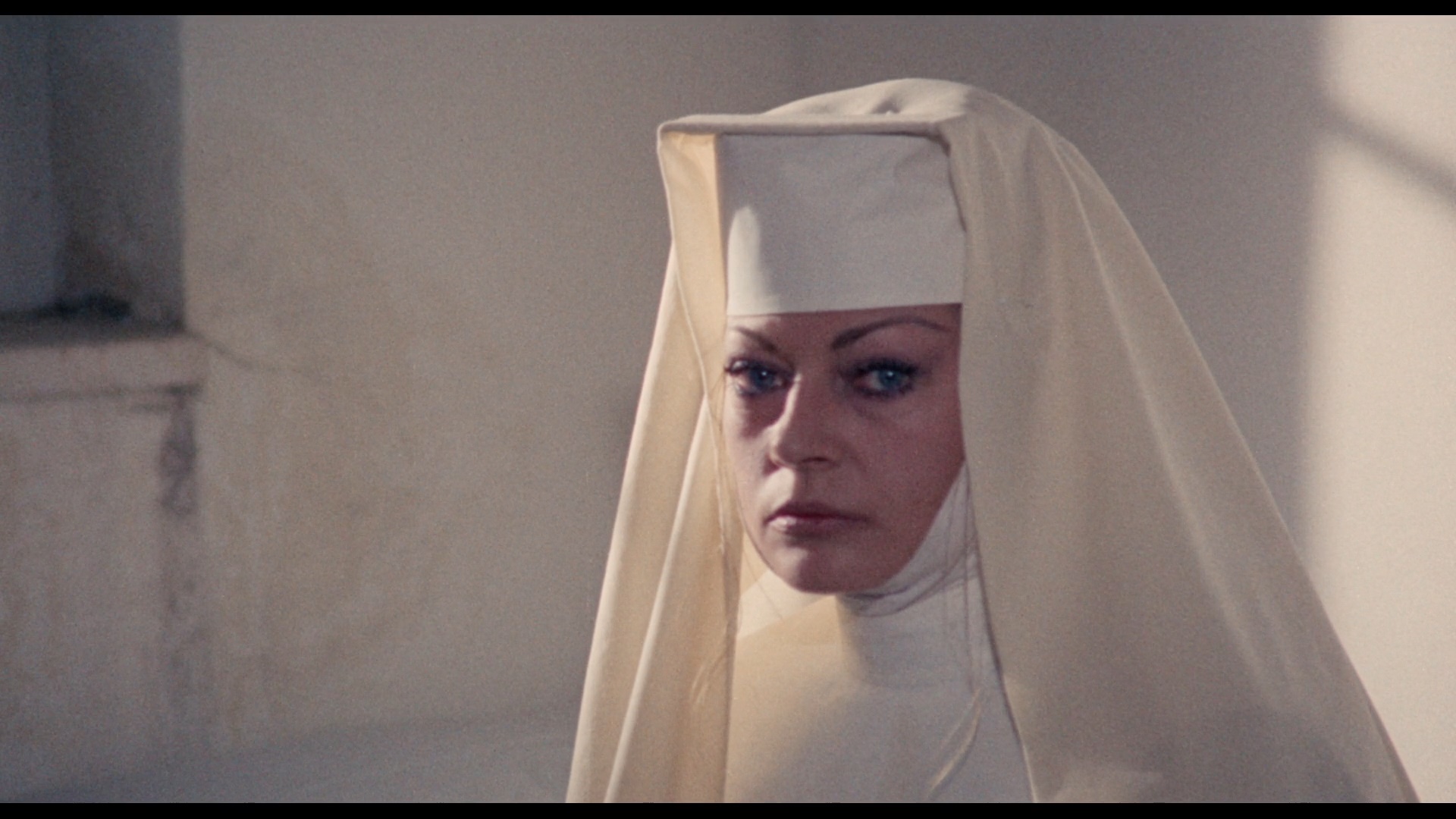 In 2019, Arrow Video gave the much a well-deserved visual overhaul with an American Blu-ray featuring a new 2K restoration from the original camera negative. That pesky scanner noise is now obliterated, thankfully, replaced here with natural film grain and more convincing textures throughout. More image info is also visible on the sides and, unlike the earlier transfer, it isn't windowboxed. The usual English and Italian audio options are providing in LPCM 1.0 mono tracks with optional English translated or English SDH subtitles, and the opening and closing credits adjust accordingly depending which version you select. (The running times also vary due to the different credit lengths.) Interestingly, the English version here has a slightly different opening with producer Enzo Gallo's credit appearing over a black screen rather than being superimposed on the opening shot. A new audio commentary with " Italian genre film connoisseurs" Adrian J. Smith and David Flint dive right in chatting about the Killer Nunfactual inspiration for the story (which happened in Belgium), the issues with labeling this as nunsploitation, the ins and outs of the cast and crew, the elements of classic melodrama, and more. The Killer NunNucleus Films-produced "Beyond Convent Walls" (29m19s) is a video essay by Kat Ellinger charting the history and appeal of the nunsploitation craze from its literary genesis onward including this "wild card" entry and its subversion of expected exploitation elements. (Note that the volume on this one is much louder than the rest of the disc, so take care if you're wearing headphones.) A new interview with Berruti, "Our Mother of Hell" (51m51s), is a very thorough account of his career from early television gigs through the origins of this film's script and his memories of the cast including the cooperative but "cold" Dallesandro and the rapid, half-day shoot for all of the hard-drinking Valli's scenes. Then editor Mario Giacco appears for "Cut and Noise" (20m31s) to chat about his own entry in the business thanks to a fortuitous ad and his climb up the ladder as an assistant editor before going into a handful of memories about this film using tricks he'd learned on earlier projects like Baba Yaga and an increasing fascinating with sound editing and special effects. He also touches on some of later work, particularly A Blade in the Dark. Finally, "Starry Eyes" (23m47s) catches up with actress Ileana Fraia for an overview of her lifelong gravitation to acting with a path running through various TV productions for RAI and work as a dubbing artist on the way to this film, for which she wished she had a more prominent role than the distraught lunatic she plays here. Also included are the English and Italian theatrical trailers (which are identical apart from the language difference) and a gallery (3m40s) of international poster art and lobby cards, while the disc comes with reversible sleeve options including a new cover design by Daryl Joyce.