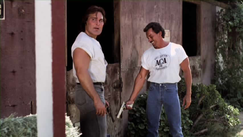 (Verden), who gets a bullet in the gut and needs medical treatment. Dogged Lieutenant Sunset (Jim Brown, of course) tries to track the men down as they hide out on a sprawling ranch where a tacky ornate home is inhabited by dim-witted women in bikinis. Meanwhile the house's owner, John Morgan (Andy Sidaris regular Harold Diamond), shows up after a manly round of kickboxing at the local gym and a police chase only to find himself in a nest of danger and shotguns. Sent out to find a doctor, he has to come up with a way to defeat the bitch-slapping bad guys before his lady friends all wind up riddled with bullets.