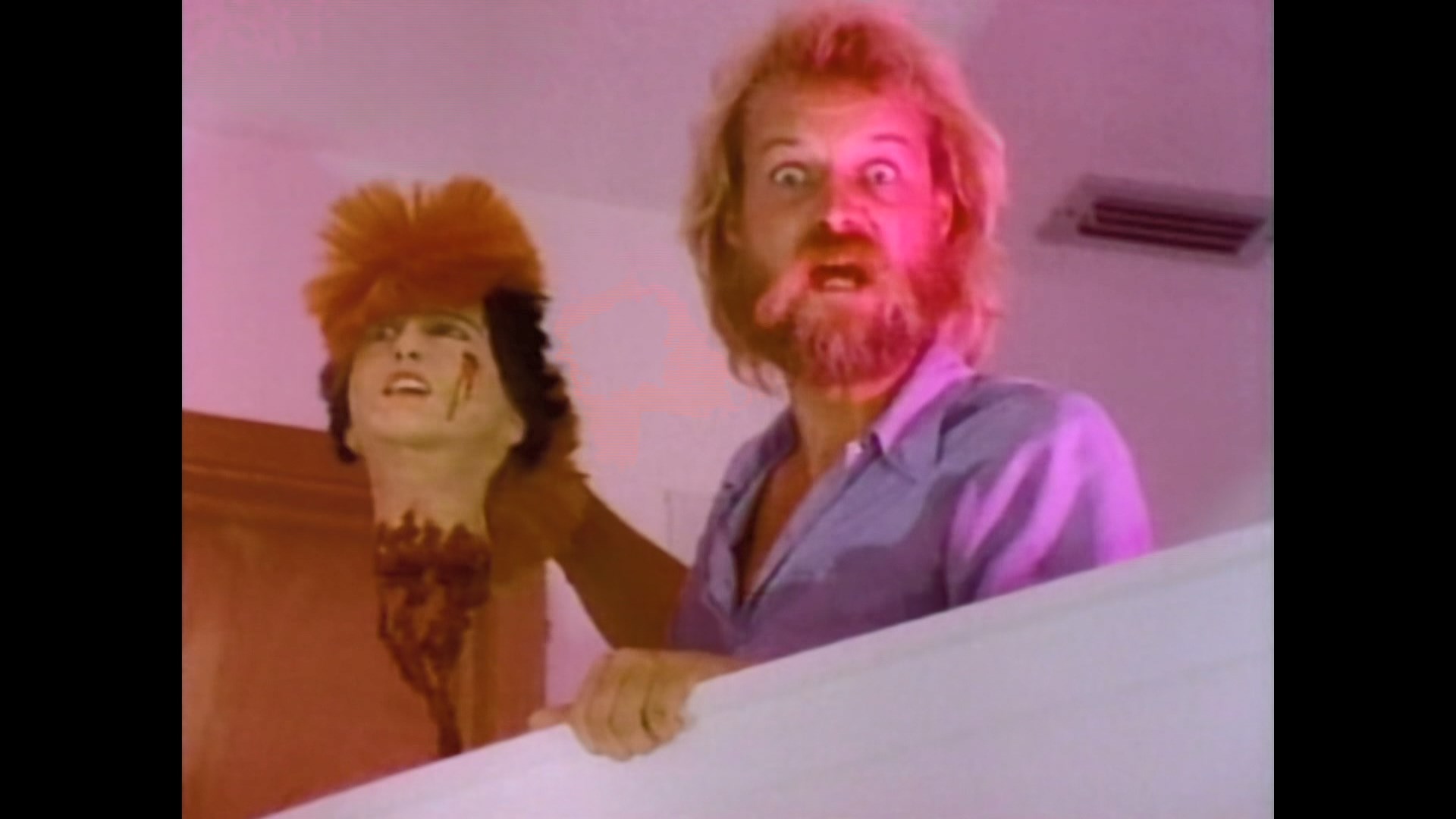 Unmistakably a product of the gorehound era, Killing Spree is packed with cartoonish, splatter-packed murder scenes involving a spinning-blade ceiling fan, an old woman's face pounded to mush, a simultaneous disemboweling/electrocution, and many more, all designed for an FX artist's greatest hits reel. The acting is all stylized and over the top, which will either delight viewers or grate on their nerves depending on their mood. Felt spends much of his time leering into the camera and pulling faces as he eviscerates the cast, with some deliberately groan-worthy one-liners tossed in for good measure. Featuring an ambiance similar to the early efforts H.G. Lewis (who gets a nod in the closing credits), the film's Florida locales have a seedy, realistic quality that makes the film all the more unique and effective, with