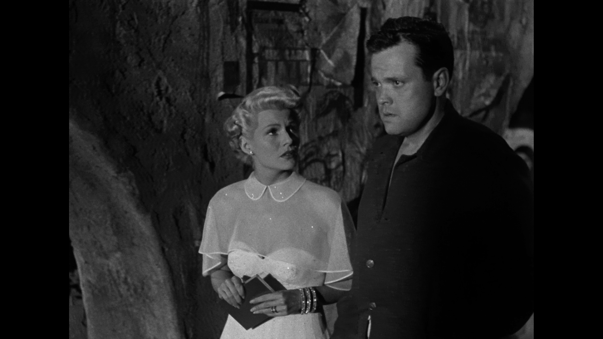 paltry bit rate, and generally weak appearance, not to mention a lossy Dolby Digital track. That edition contained one extra from the general 2000 DVD edition, an audio commentary by Peter Bogdanovich (your mileage will vary on this one depending how much of a tolerance you have for his usual "I was good friends with Orson Welles" routine) and dropping a 20-minute Bogdanovich interview that covered most of the same ground. New to the first TCM edition are an intro by the late Robert Osborne, a half-hour Noir.net podcast, separate stills and poster galleries, production and publicity photos, and talent bios and TCM articles. An advertised "comments" feature by film noir expert Eddie Muller also failed to materialize. Complaints about that release led to a TCM reissue six months later, featuring a superior and significantly darker presentation with a Dolby TruHD track and much better encoding -- not to mention that elusive Eddie Muller material, which is chopped up into three new featurettes ("An Epic Noir Poem," "Back Story," and "It's Film Noir Distilled"), all up to his usual high standards. (Not surprisingly, he went on to become a regular film noir host on TCM in 2017.)