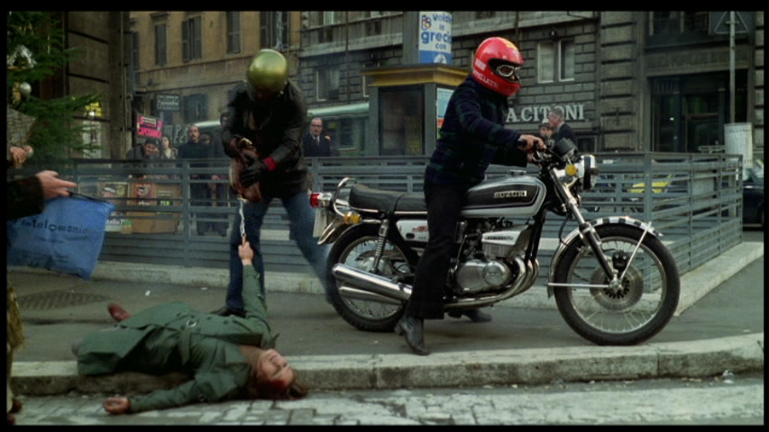 The action starts when a pair of purse snatchers drag their latest female victim's head against the pavement during rush hour in Rome, triggering the attention of cops Fred (The Psychic's Porel) and Tony (The Living Dead of Manchester Morgue's Lovelock), members of a "special squad" devoted to extreme measures against violent criminals. Fred and Tony pursue their targets on motorcycles in a jaw-dropping chase across the city, up and down steps, into storefronts, through cafes, and finally into a truckyard. It's hard to imagine the film could possibly top this opening (easily one of the best motorcycle scenes in movie history), but the rest of the film tries its best with a succession of brutal set pieces as the two cops, under orders from their possibly immoral boss (Thunderball's Celi), set their sights on a gangster named Bibi (Salvatori) and his thugs. In the meantime they sexually harass their secretary, tag team Bibi's daughter, and brutalize a string of other lawbreakers, in one case even gunning them down before they've actually carried out their planned bank robbery. Naturally, it all ends in a violent gun battle that leaves plenty of bodies in its wake.