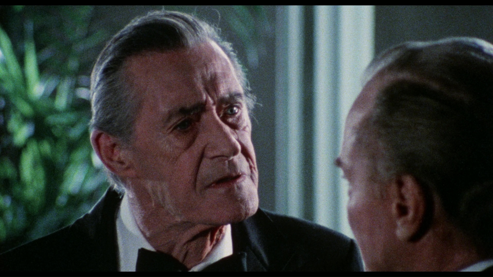 Created in 1978 and sort of released over the next four years, Doctor Dracula (90 mins. 39 secs.) is also included as a bonus tucked away in the list of special features. That isn't surprising as it's far, far less coherent than the main feature, though for Adamson fans it's fun seeing how he managed to wedge regulars like John Carradine and Regina Carrol into the proceedings. For some reason this redo amps up the exposition, keeping the chatty parts of the original and padding them out past the point of endurance while jettisoning all of the sex and violence. Here the whole Svengali plot is turned into a rivalry with Dracula, now hiding in modern day society as Gregorio (Geoffrey Lund) and interacting with Hankin via some new footage shot with the actor. Not surprisingly, the film was deemed unfit for a theatrical release and ended up being sold for international TV in a package deal to 20th Century Fox, who must have had buyer's remorse right away.