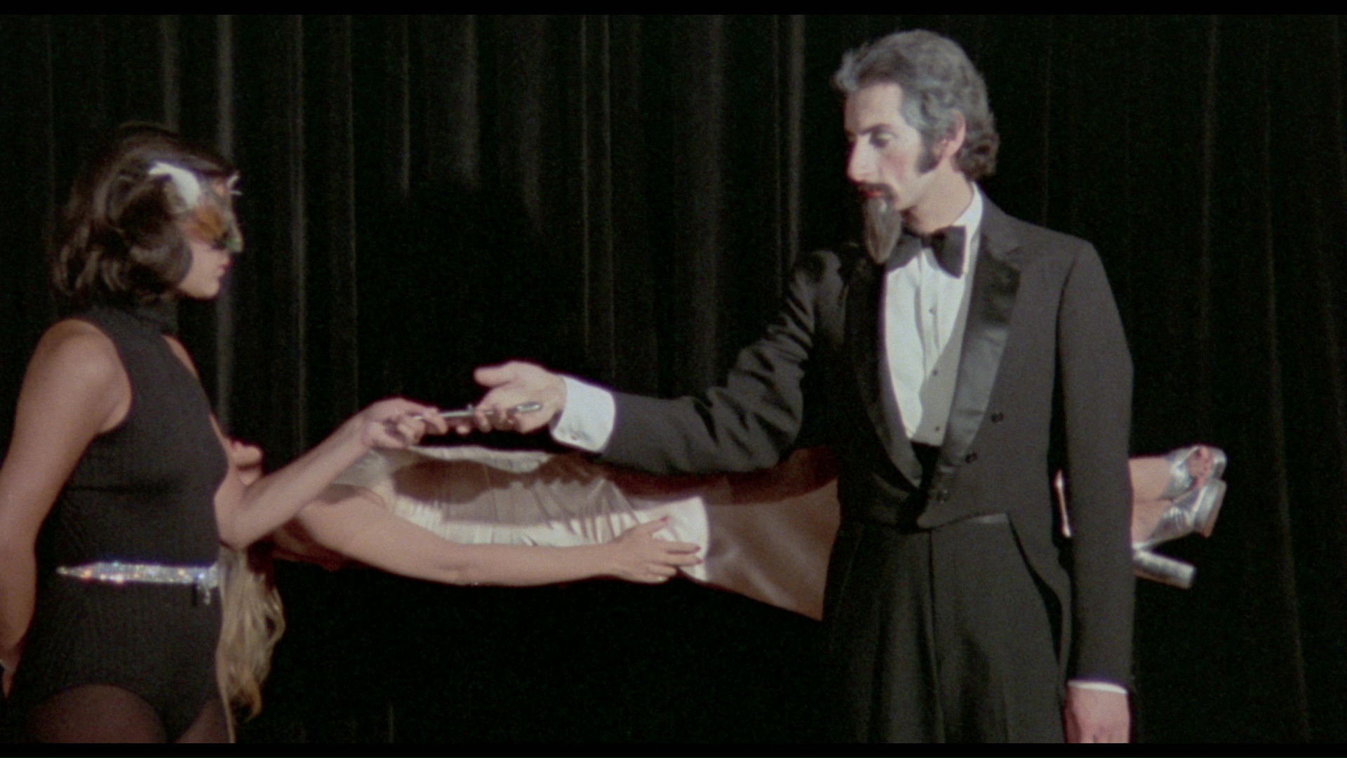major digital chicanery done to make them look more modern. The restoration of the original framing to Doctor Dracula at least gives it more of a professional appearance, and that crazy red lighting during the climax looks nice and vivid. The DTS-HD MA English mono tracks both sound perfectly fine, with optional English SDH subtitles provided. The Lucifer's Women trailer shows up here in a fresh new transfer, and a couple of substantial new goodies have been added as well. A new interview with Thomas (20m4s) is virtually with the price tag all by itself as he spins out an amazing, candid account of his showbiz life including his time on Broadway, a coke-smuggling bust that caused him to temporarily change his porn name, his introduction to porno chic in San Francisco via Autobiography of a Flea, his segue into R-rated moviemaking with this film (including an unexpected issue that popped up during his big love scene), and his lack of professional discipline that kept him from pursuing more mainstream roles. Finally and most illuminatingly, Sherman himself contributes an audio commentary to Doctor Dracula that lays out about how the original film came about and ended up in his library, the reworked version ended up going to television, and Adamson became involved in doing the new footage. He also points out a lot of relevant faces on screen and notes that some nudity was actually shot for the bathtub attack scene but never used. Needless to say, the whole package is an unexpected slice of fringe cinematic scholarship that makes the world a slightly better place. DOCTOR DRACULA (VINEGAR SYNDROME BLU-RAY)