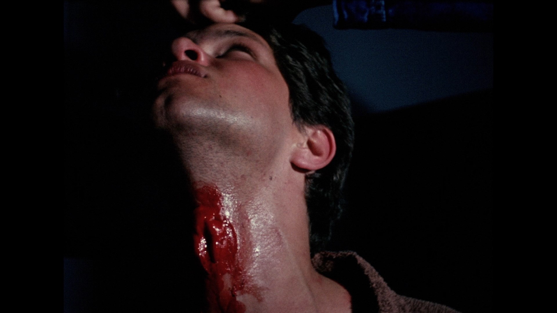roped into a pagan with some weird customers like mute, homicidal handyman Maurice (Colin Efford) who practices shirtless weightlifting while staring at nudie pinups on his wall. Hall turns up here again in a much smaller role, with Efford getting the most memorable part here. It's a very memorable film that turns some wild turns on the way to its vivid, gut-ripping demonic finale, with a few effective stalk-and-slash kills sprinkled in along the way. The droning electronic score is a big plus as well, making this an easy recommendation for fans of '80s British horror. The 1.33:1 presentation is mostly taken from a 2K 16mm restoration, though unfortunately no film elements exist for the last 10 minutes which are pulled from tape. There's an option to view either the original version or a revised 2008 one prepared for the film's 2008 Sarcophilous Films DVD edition, which completes some of the red eye special effects in the final stretch. The companion film, The Last Night (46m36s), is a more straightforward slasher as the final night of a theatrical production called Murder in the Dark gets crashed by a couple of "armed and extremely dangerous" convicts escaped from nearby Broadmoor prison. Soon people are getting snatched, throats are slashed,