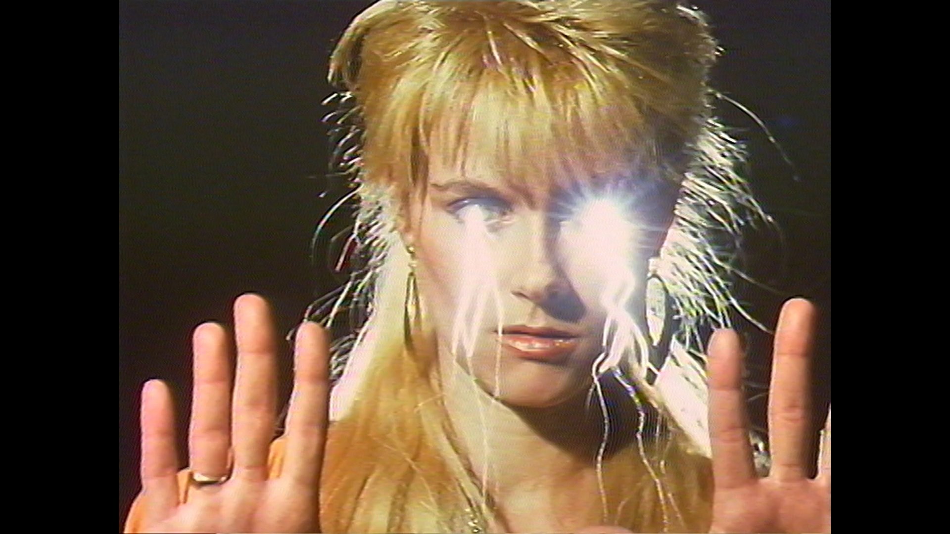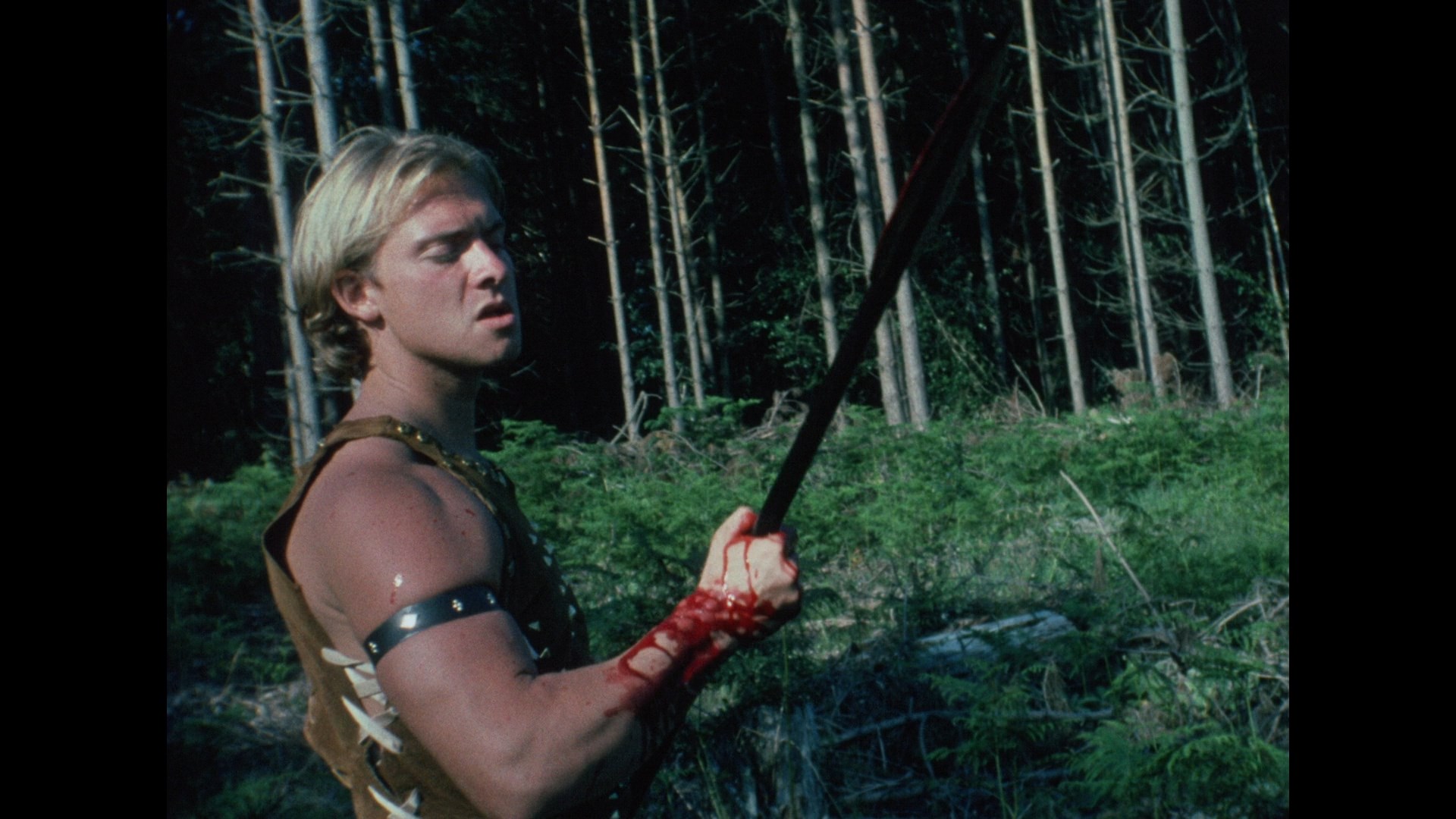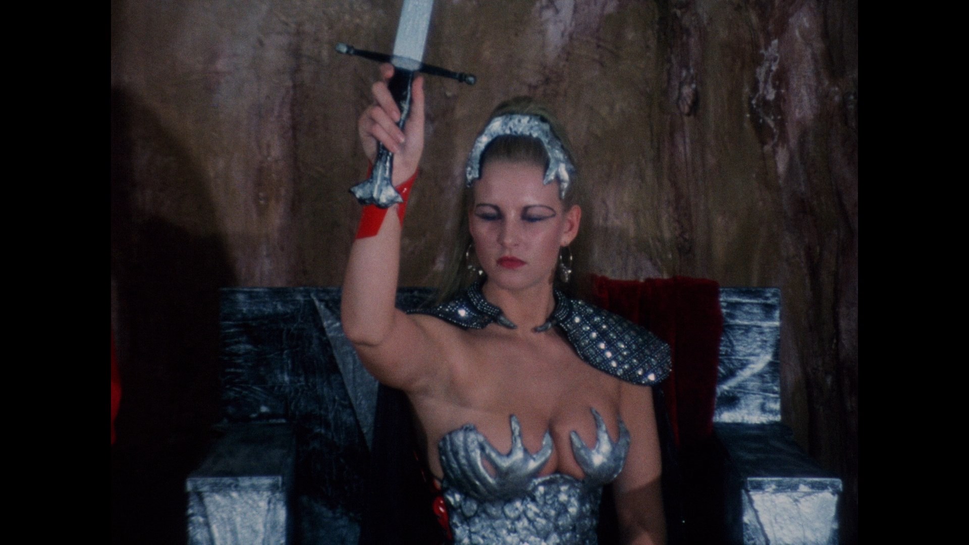 disc five with 1989's Avalon (84m8s), whose film elements also went up in smoke and which is presented here from the best surviving SD source. The Excalibur influence still carries on here, albeit with some insane shiny outfits straight out of a TV variety show, with the Arthurian saga about the evil reign of Morgana (Debbi Stevens) whose sacrifice of the poor Clothilde (Abigail Blackmore) is thwarted by stud-muffin swordsman Owen (Stephen Harris). Accompanied by thief Keiran (Bartlett again) and Merlin (Olliver), they set off for the fabled land of Avalon where they can retrieve a mystical sword capable of vanquishing the tyrannical sorceress and her army of white-robed Druids. Again your tolerance for zero-budget sword and sorcery antics will determine how much you enjoy this one, but it packs a lot of action and goofiness into the running time (not to mention plenty of mullets).