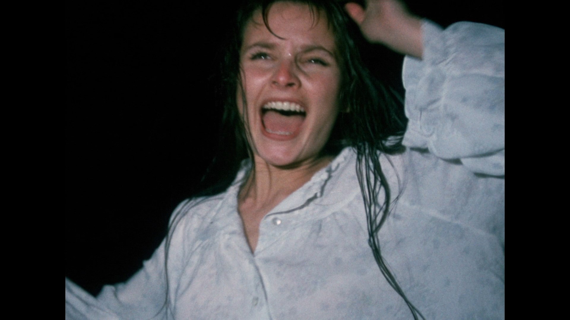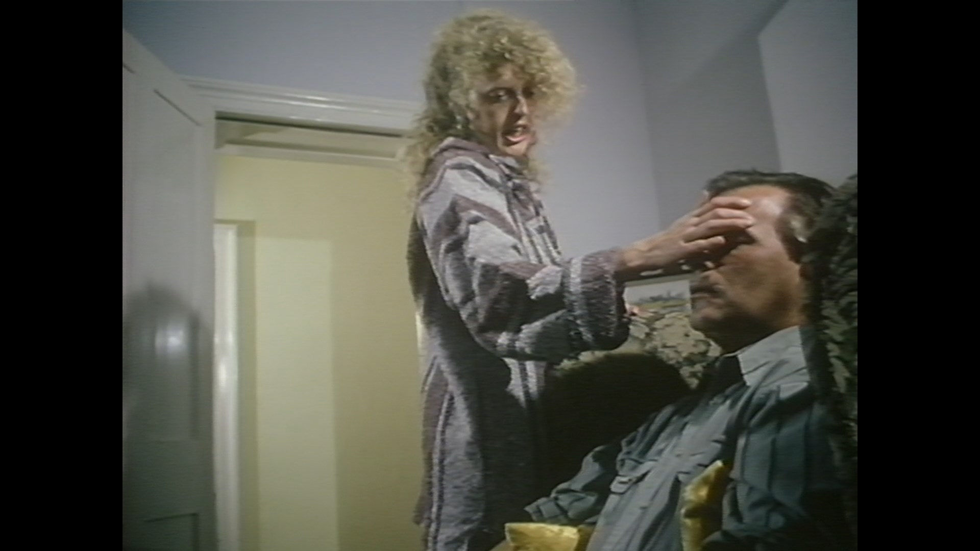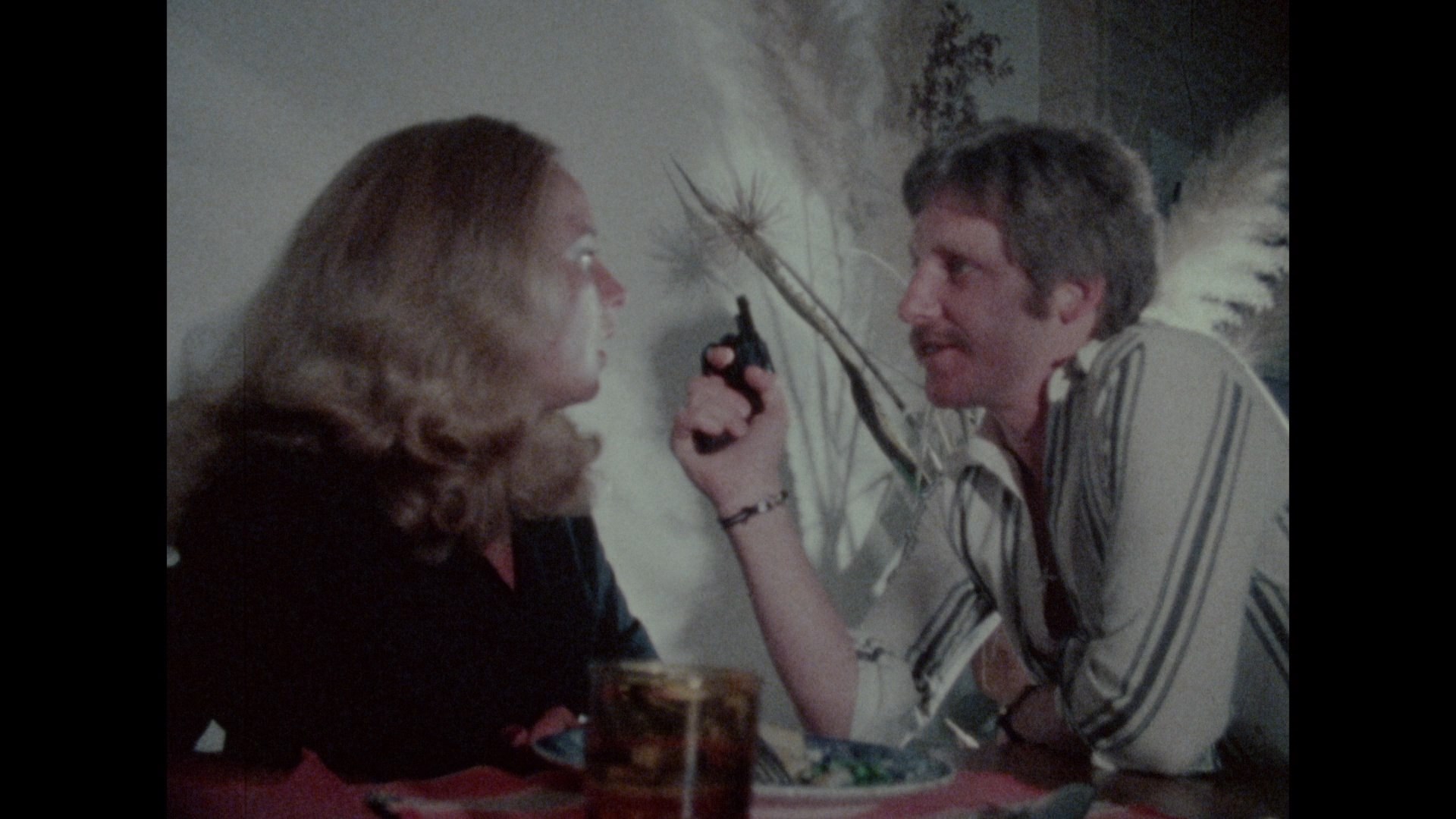 off Murphy's eye for Greek isle scenery again. Then we move to another short feature, 1981's Death in the Family (54m51s), which actually does feel a bit like a more subdued Milligan film and got a U.K. VHS release back in the day from Neon. Oliver (Hall) welcomes several of his relatives to the family villa for a reunion including sister Debbie (Caroline Aylward), with whom he has an incestuous relationship, to meet the new stepmother, Shirley (Aston). It's been five years since the death of Oliver's mom in a fiery car accident, and he's still working through major trauma issues while his dad Max works on building a new marina. Soon hidden agendas rise to the surface as Oliver and Debbie's dark side begins to take over. Though it starts off slow, this one is pure Murphy with its double- and triple-crossing characters, languid Greek island locale, and utterly cuckoo climax that's best experienced unspoiled. The 2K 16mm restoration (with a couple of very fleeting VHS inserts) is framed at 1.33:1 and looks solid while preserving the scrappy nature of the original film.
