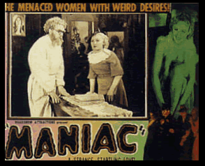 Esper's most famous opus, Maniac, opens as a treatsie on the dangers of mental illness but quickly swerves off in directions no sane person could ever predict. Dr. Meirschultz (Horace B. Carpenter), a prototypical mad scientist, recruits a vaudeville performer, Don (Bill Woods), who happens to possess uncanny impersonation skills. The two swipe a female corpse and revive her by rubbing her arms. After another bodysnatching expedition goes awry, Meirschultz comes up with a great idea -- he An earlier film, Narcotic isn't as consistently depraved as Maniac but offers many goofy chrams all its own. Dr. Davis (Harry Cording), a promising medical talent, winds up experiencing the forbidden pleasures of smoking opium, thanks to the influence of that old '30s standby, the wise but decadent Asian. Actually, it's a terrible American actor with bad make up and a riotous sub-Charlie Chan accent, but you get the idea. Davis' wife doesn't think too highly of her hubby's Designed to violate every censorship code in the book, Esper's films wallow in wretched acting, non sequitor editing, and gleeful exploitation. Just a few minutes into Narcotic, for example, the audience is treated to a Cesarian birth sequence, just for shock value. Likewise, Maniac trots out so much sleaze it plays like a catalog of everything the legendary Hays Code opposed. Not surprisingly, both of the films are in rough shape on this DVD, but their survival in any form is something to behold. Maniac looks better in its Kino incarnation than rotten public domain copies floating around, most of which look projected through a fishbowl. Scratches and splices abound, especially in the openeing credits, but the actual clarity of the image is impressive and satisfying. Narcotic appears to be edited with Scotch tape to begin with, so the presentation obviously isn't much better. Dialogue is often clipped off (deliberately?), and many frames appear to be missing. As with most Esper titles, the bizarre insert footage (cats fighting, snakes eating each other, the Cesarian birth, etc.) have been spliced in without sound and stick out jarringly against the surrounding footage. The sound quality is fine, considering it was always muddled anyway. The DVD includes a sidesplitting trailer for Maniac ("It will make thy blood to freeze and thy hair to stand!"), excerpts from the Maniac screenplay (yes, it did have one), some amusing correspondence between Esper's office and the New York Film Censor Board, and a running commentary by the co-author of Forbidden Fruit, Bret Wood. Almost Criterion-like in its exhaustiveness, this presentation benefits greatly from Wood's laconic treatment of the two films, which obviously still inspire him beyond words during a few scenes. As long as viewers know what they're getting, this double feature really delivers the goods and makes one seriously wonder about the future of fringe DVD.